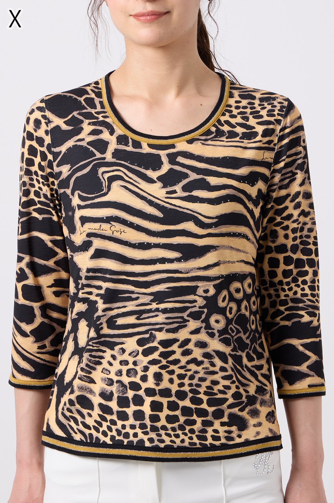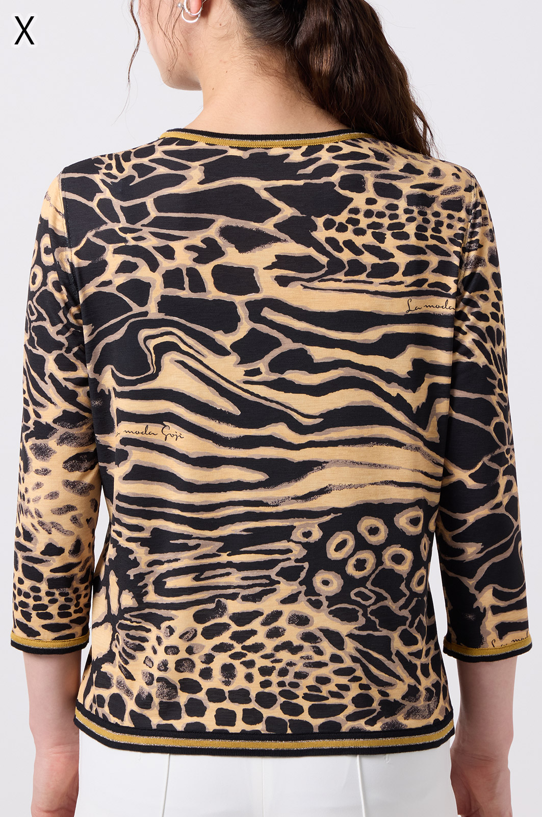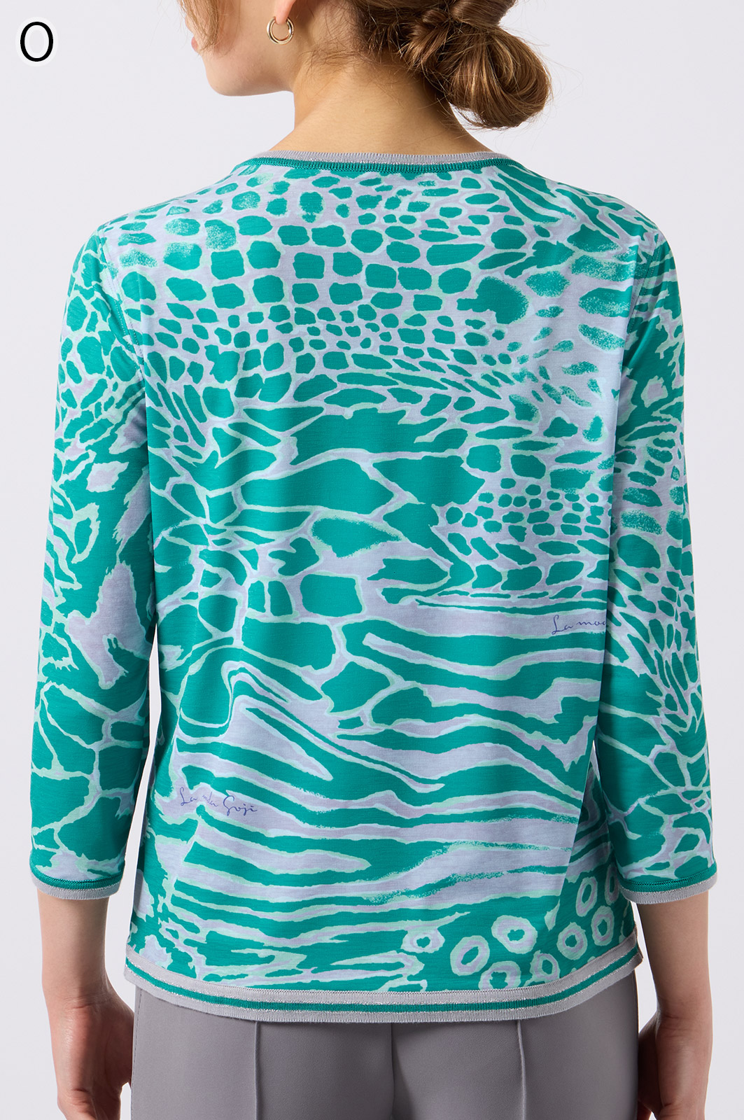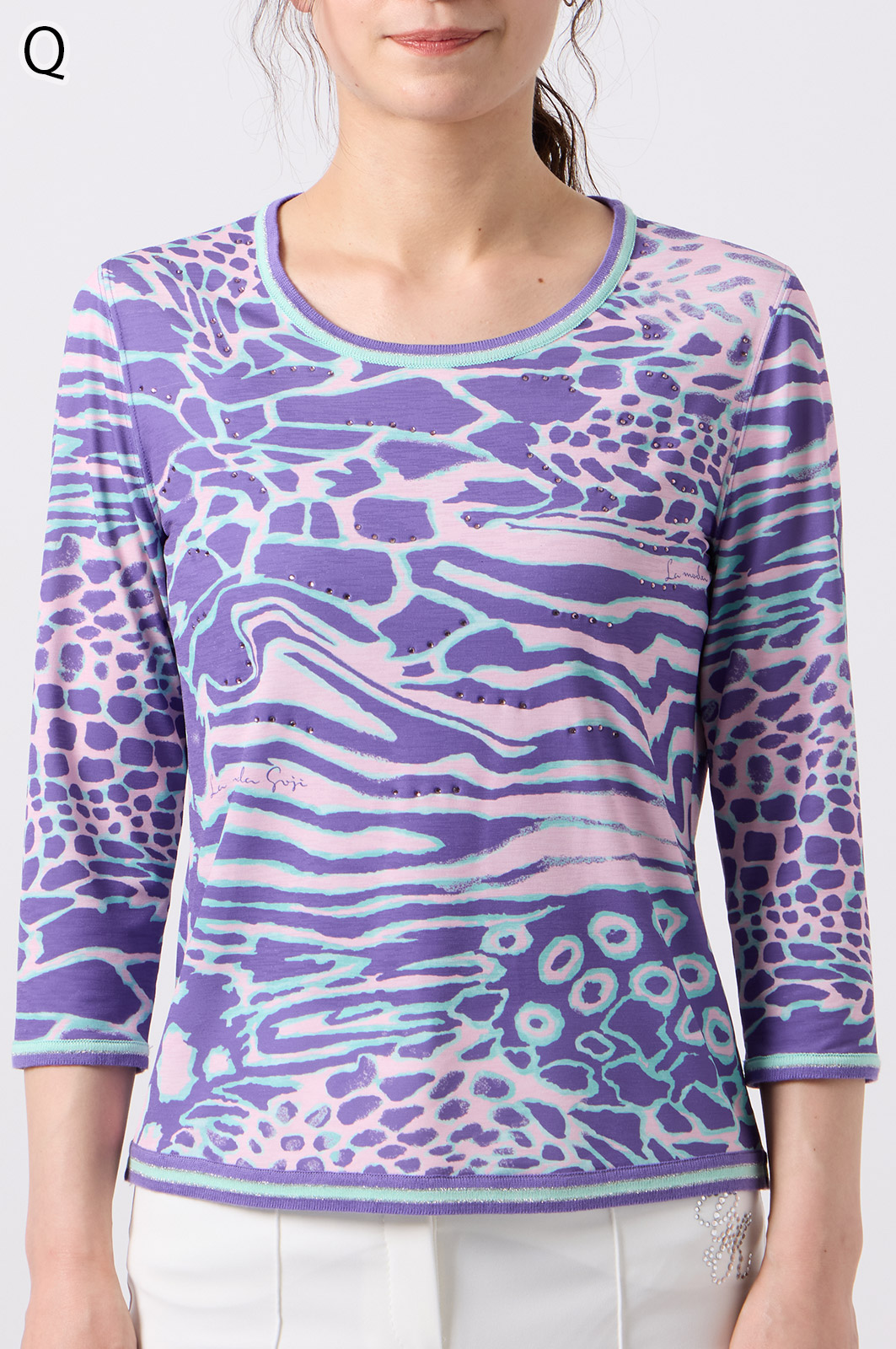 なめらかな素材感が魅力のアニマル柄トップス。すっきりした形と7分袖で着まわしやすく、首元や袖、すそに細ボーダーがアクセント。