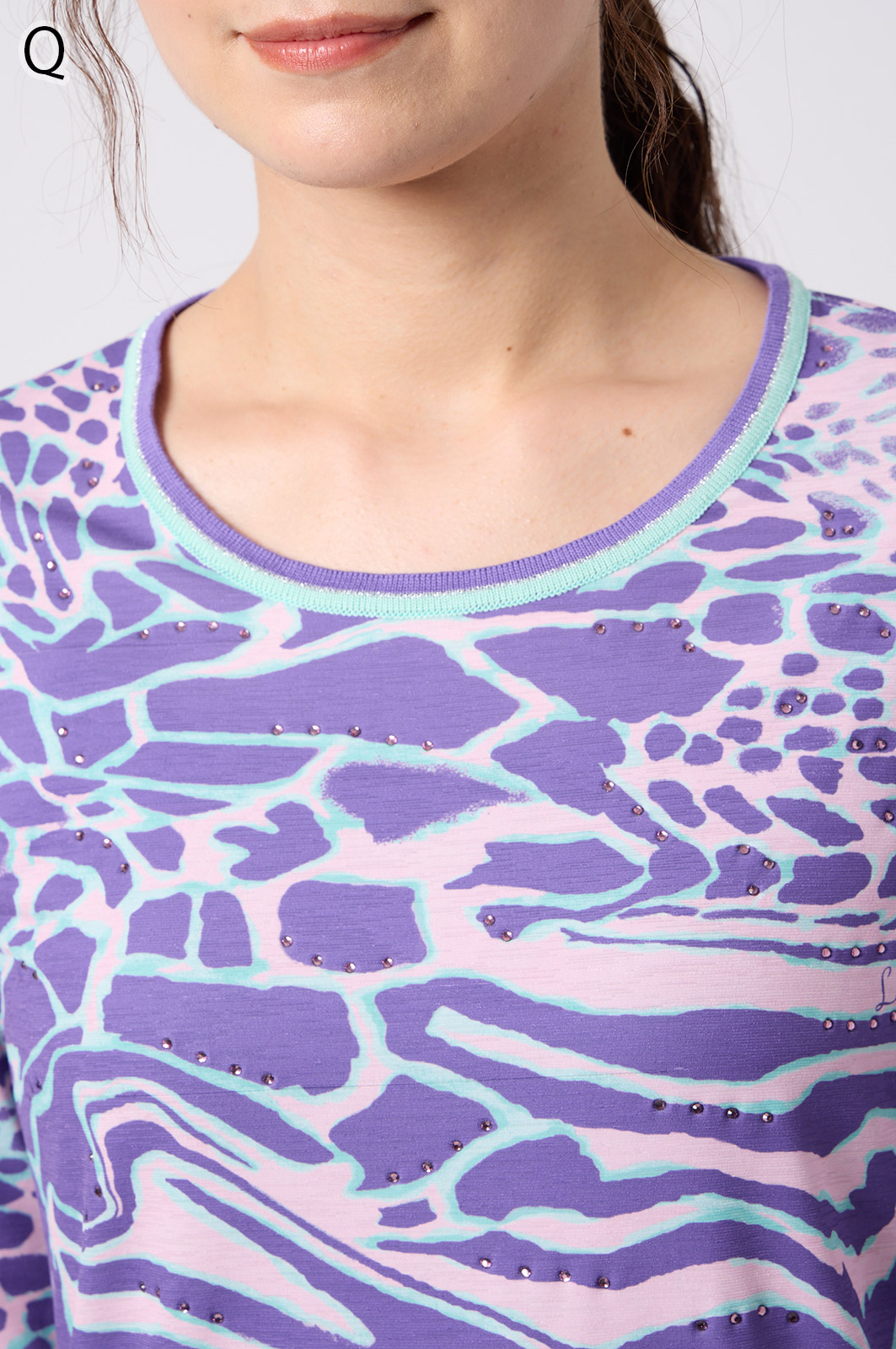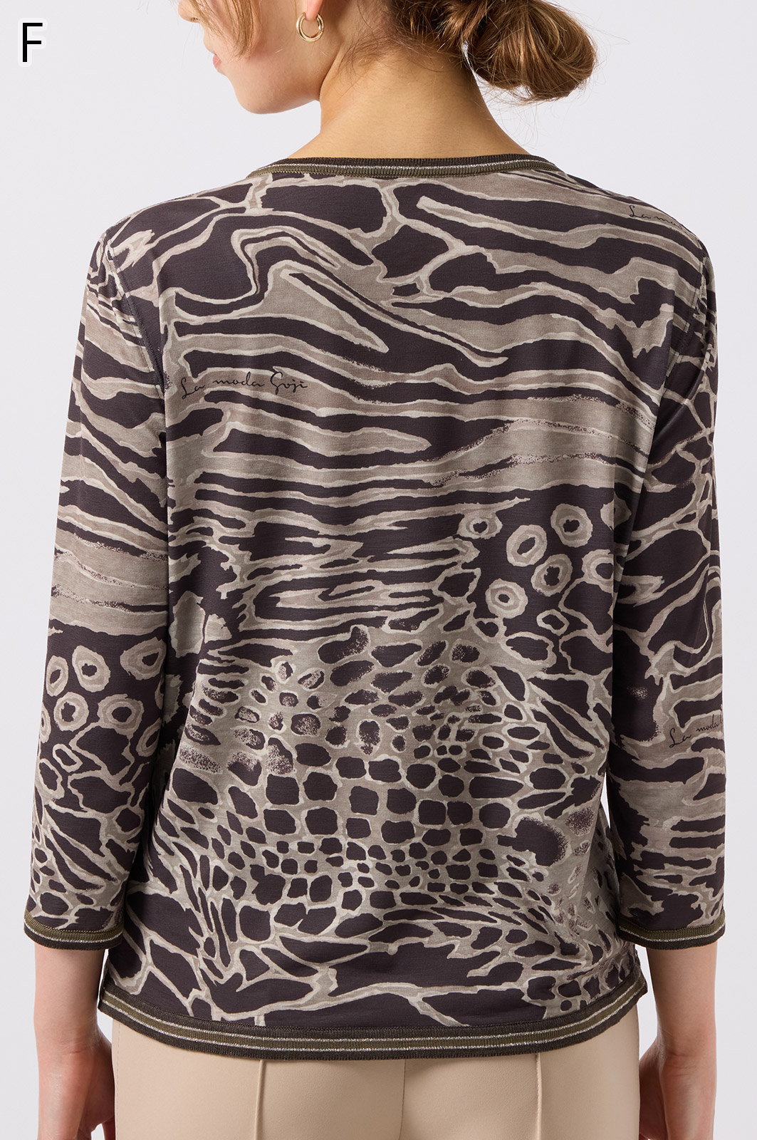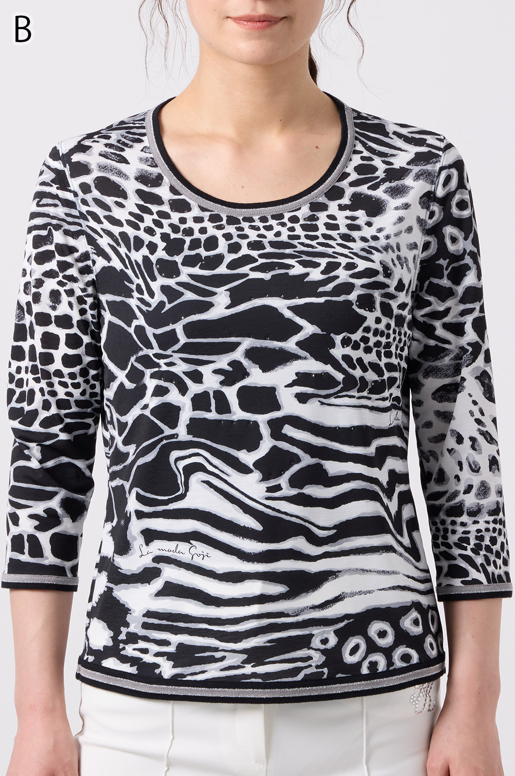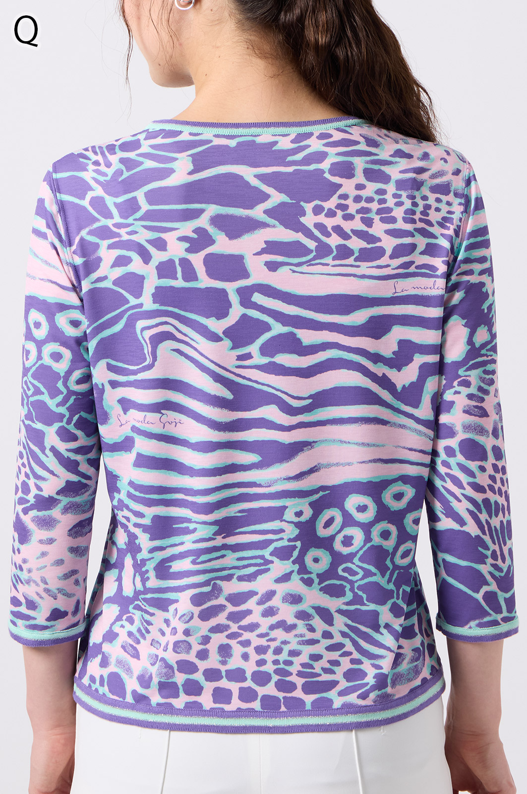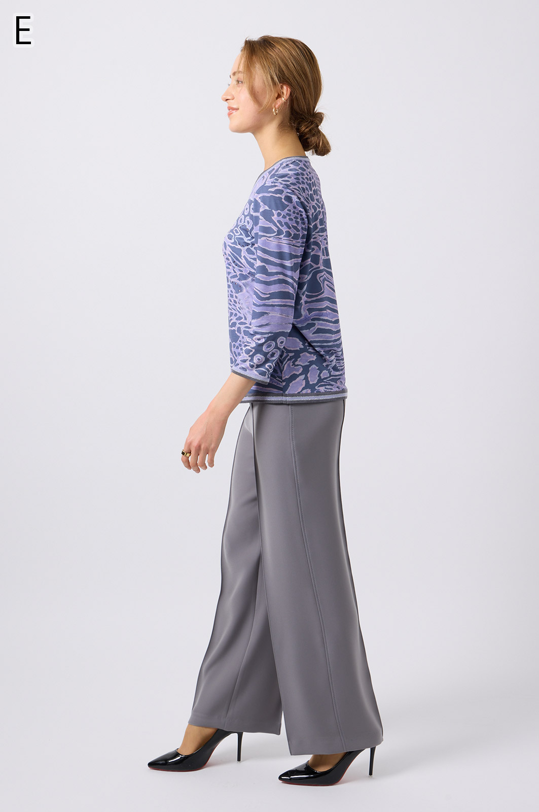 なめらかな素材感が魅力のアニマル柄トップス。すっきりした形と7分袖で着まわしやすく、首元や袖、すそに細ボーダーがアクセント。
