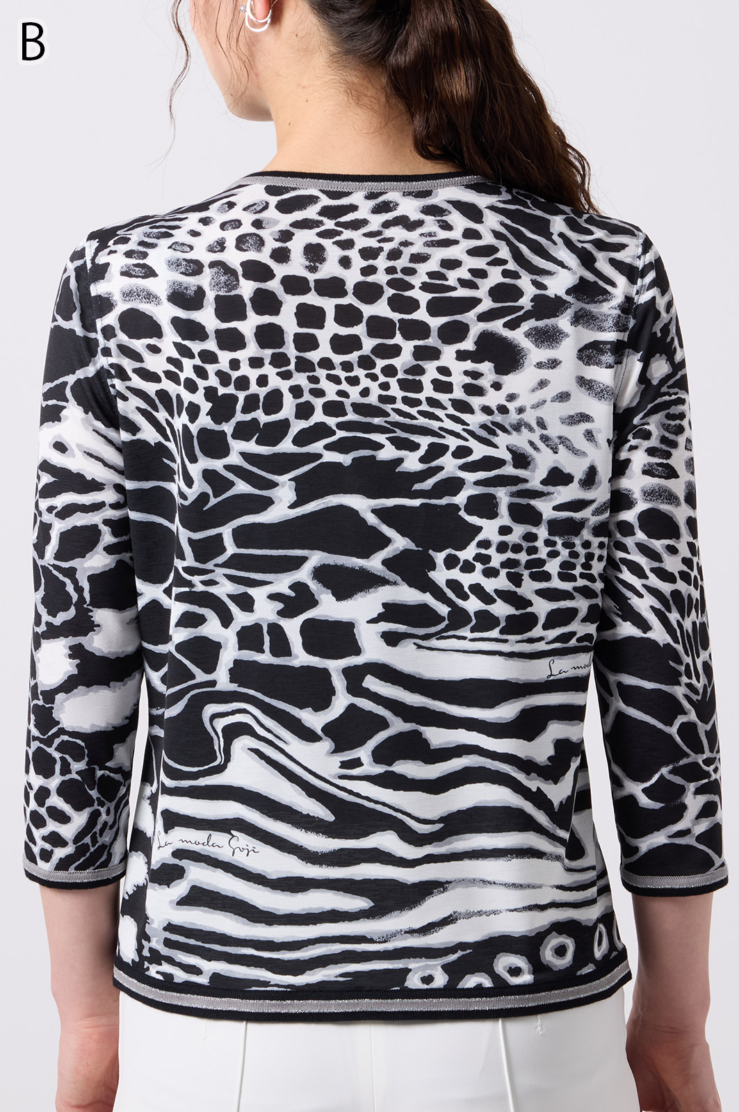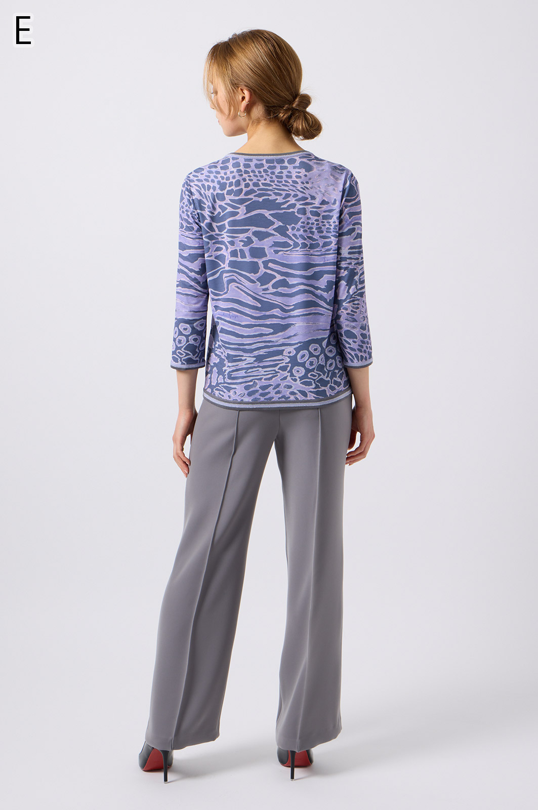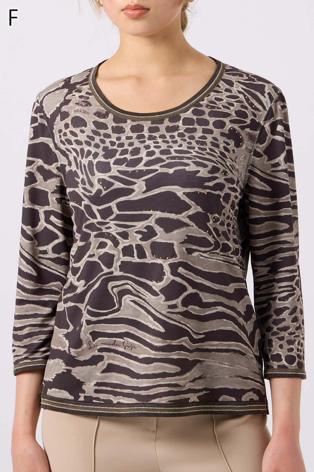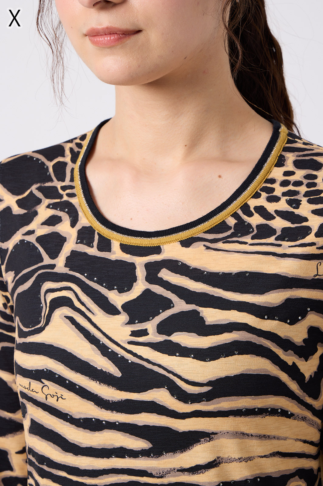 なめらかな素材感が魅力のアニマル柄トップス。すっきりした形と7分袖で着まわしやすく、首元や袖、すそに細ボーダーがアクセント。