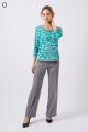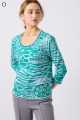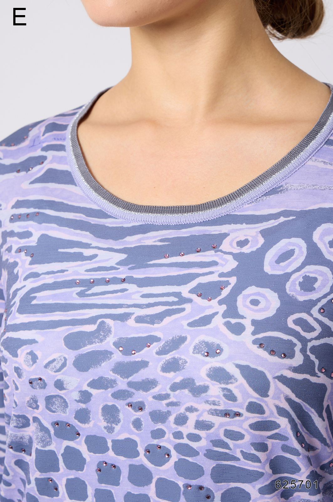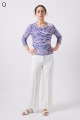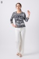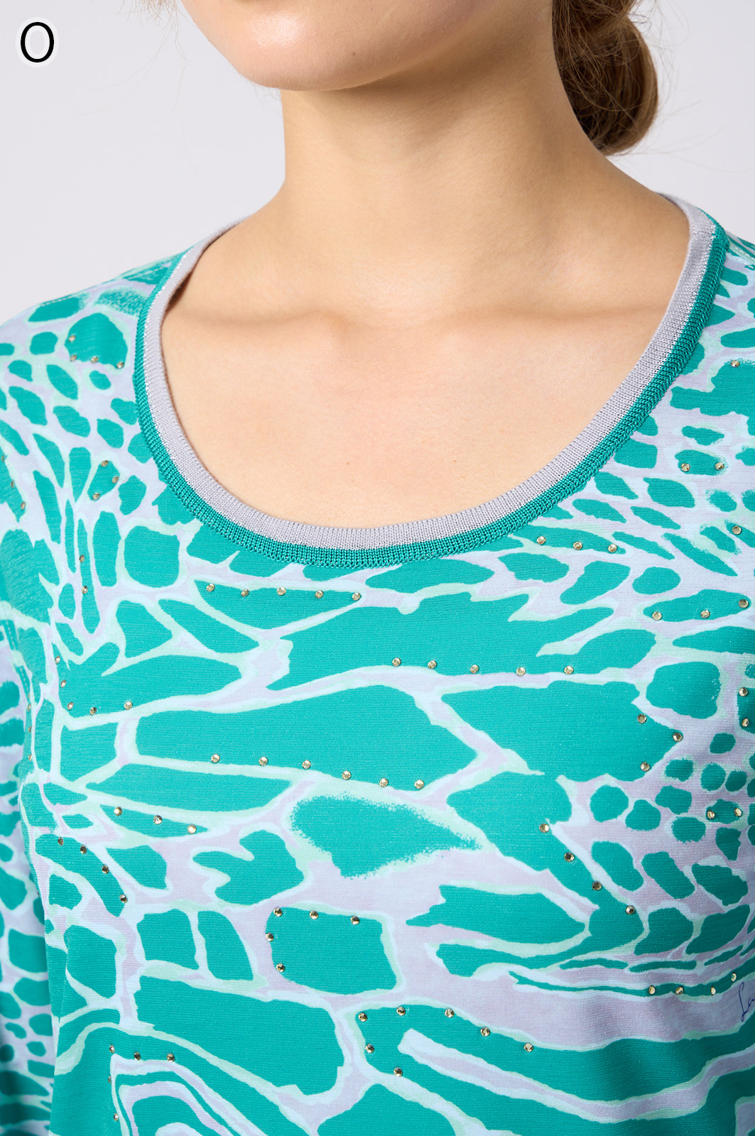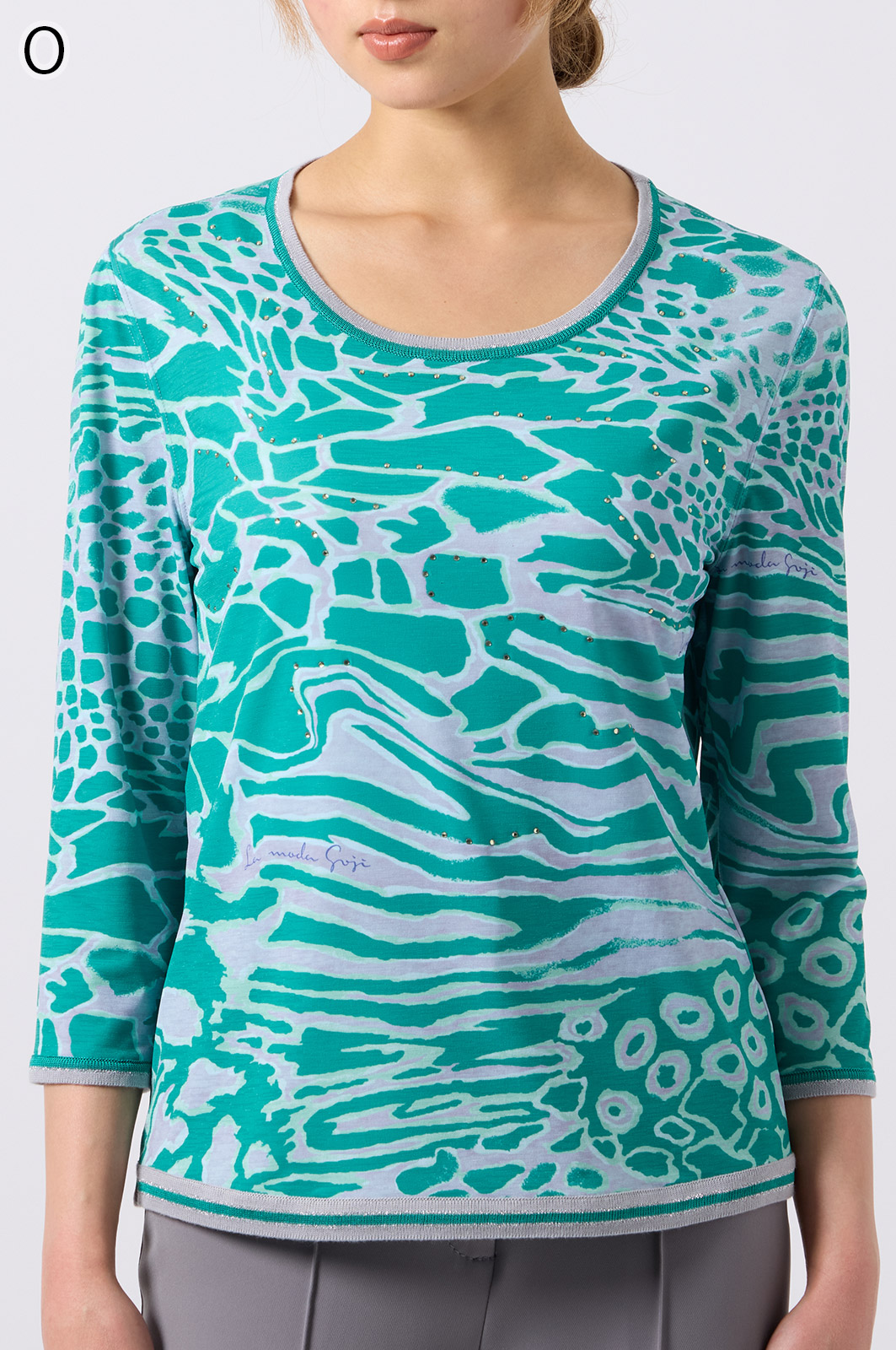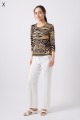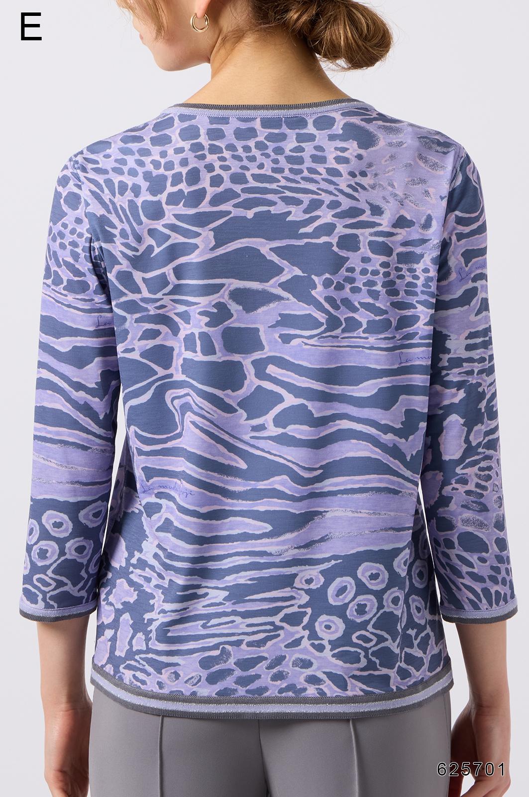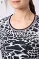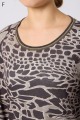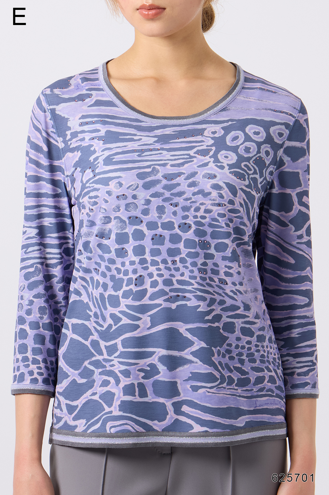 なめらかな素材感が魅力のアニマル柄トップス。すっきりした形と7分袖で着まわしやすく、首元や袖、すそに細ボーダーがアクセント。