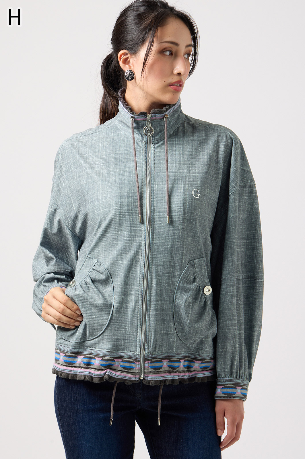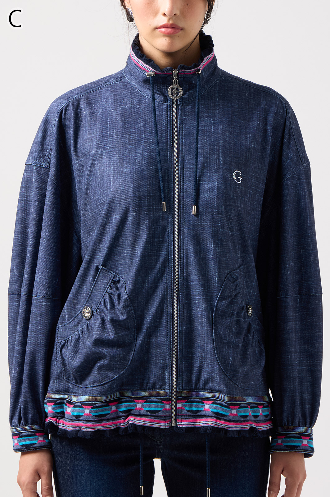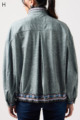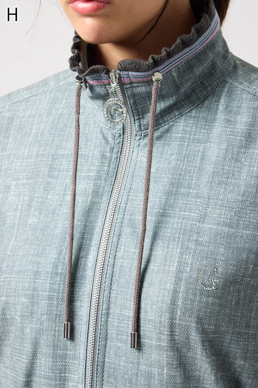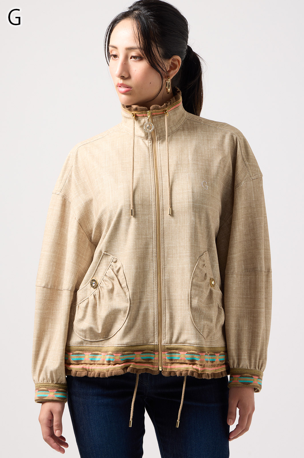 ストレッチのきいたデニム風素材を使ったブルゾン。フリルがアクセントになり、背中の裏地にはチェーン柄やロゴ、サーバルキャットの楽しいプリント入り。