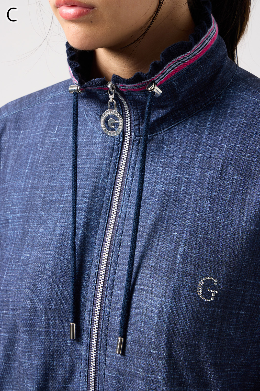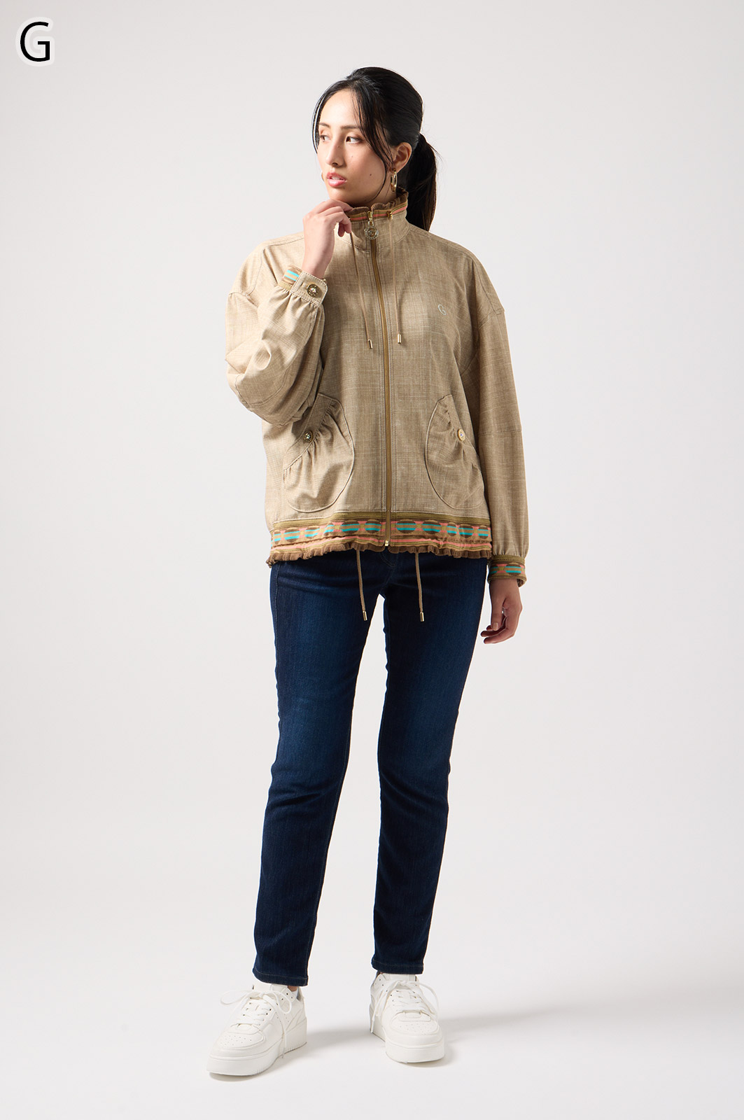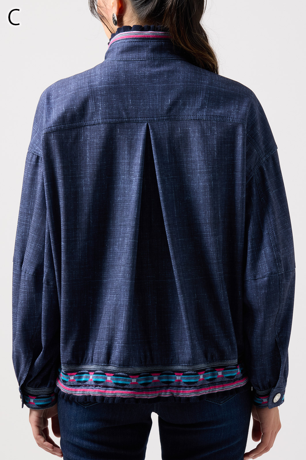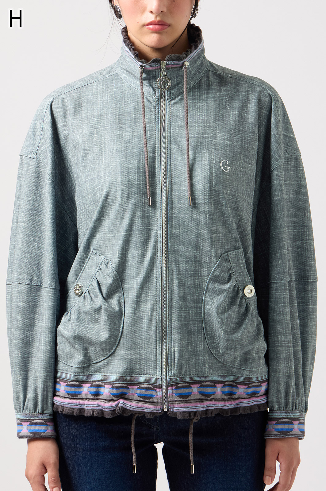 ストレッチのきいたデニム風素材を使ったブルゾン。フリルがアクセントになり、背中の裏地にはチェーン柄やロゴ、サーバルキャットの楽しいプリント入り。