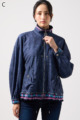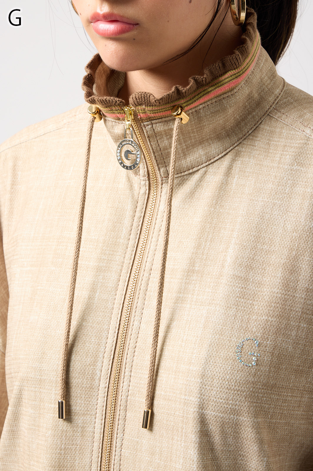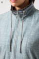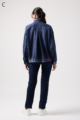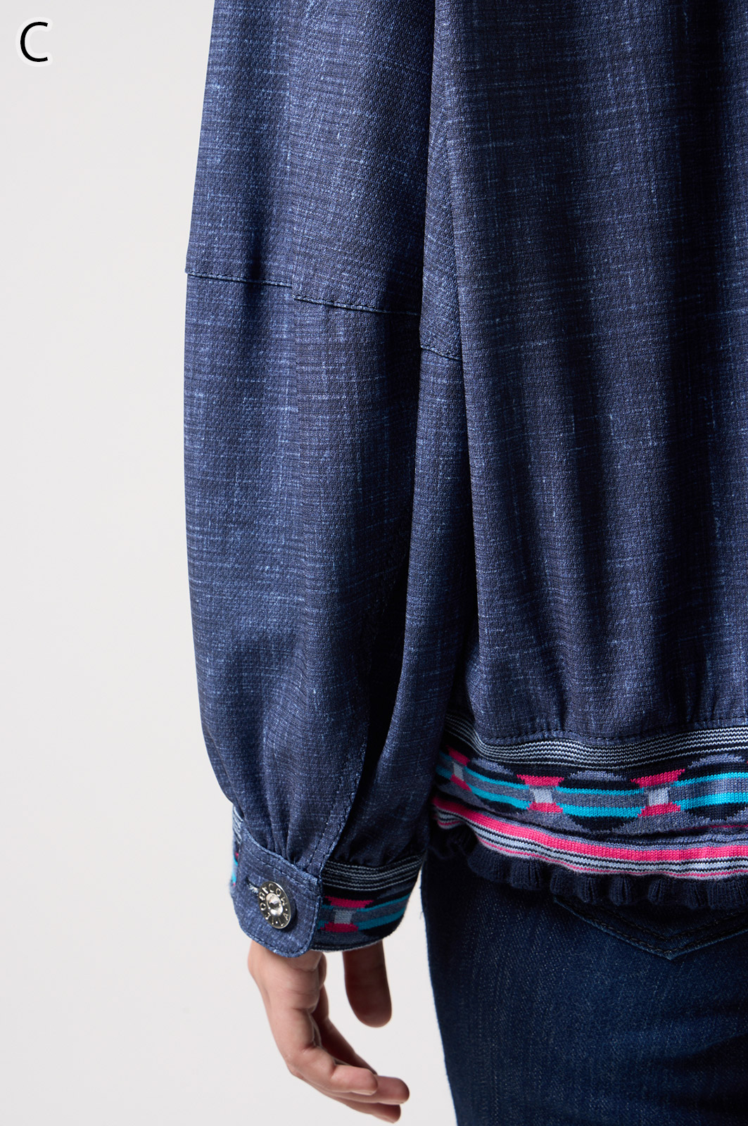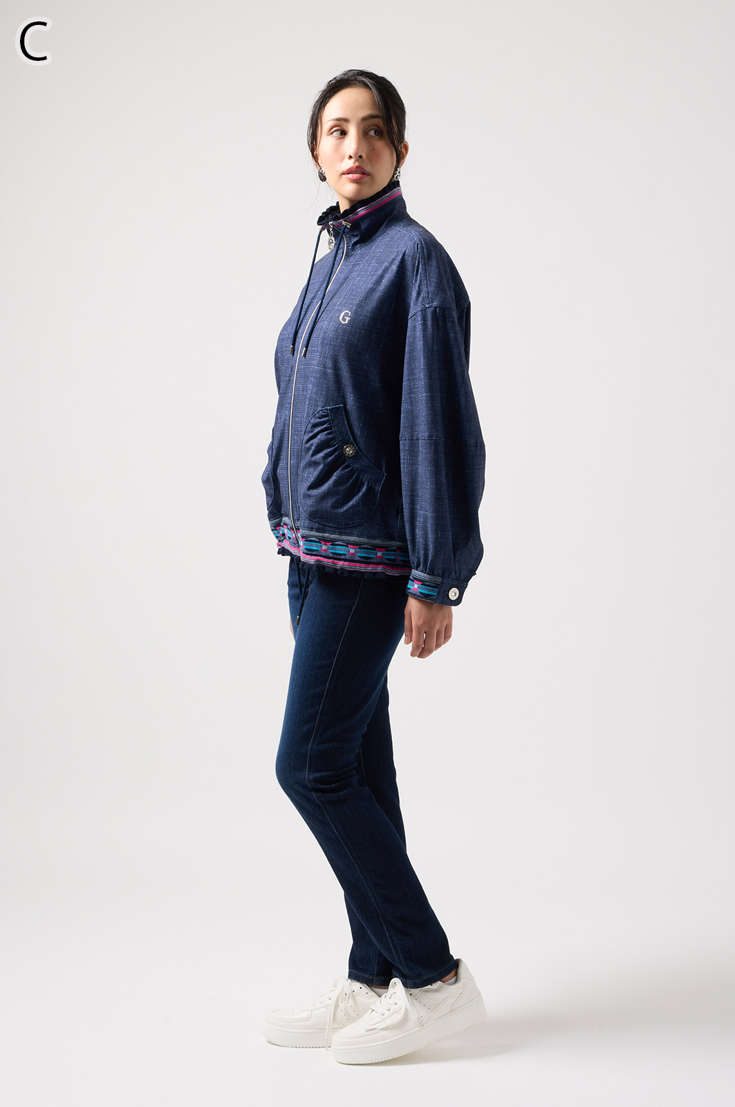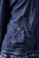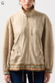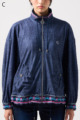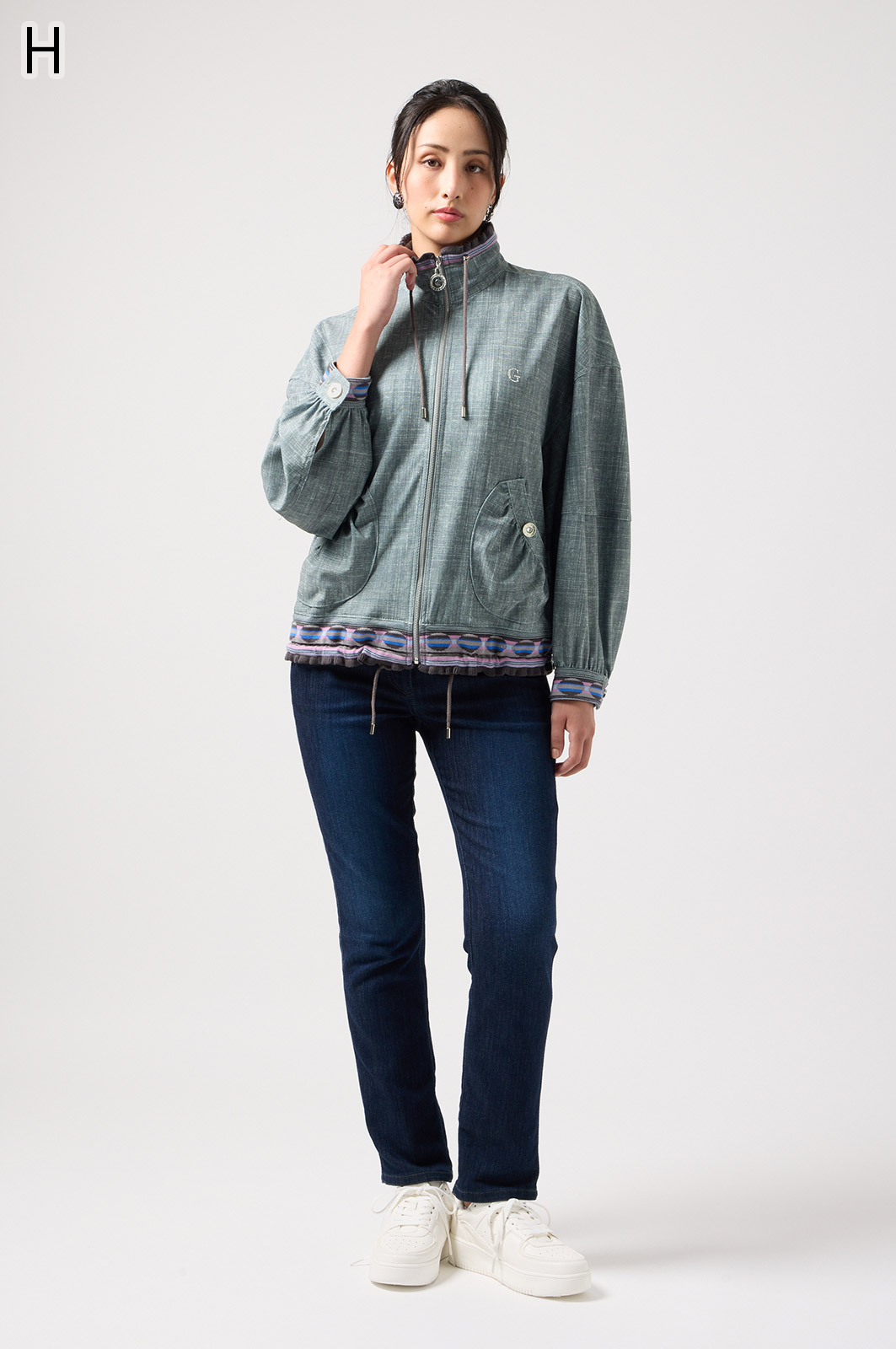 ストレッチのきいたデニム風素材を使ったブルゾン。フリルがアクセントになり、背中の裏地にはチェーン柄やロゴ、サーバルキャットの楽しいプリント入り。