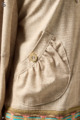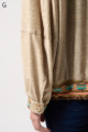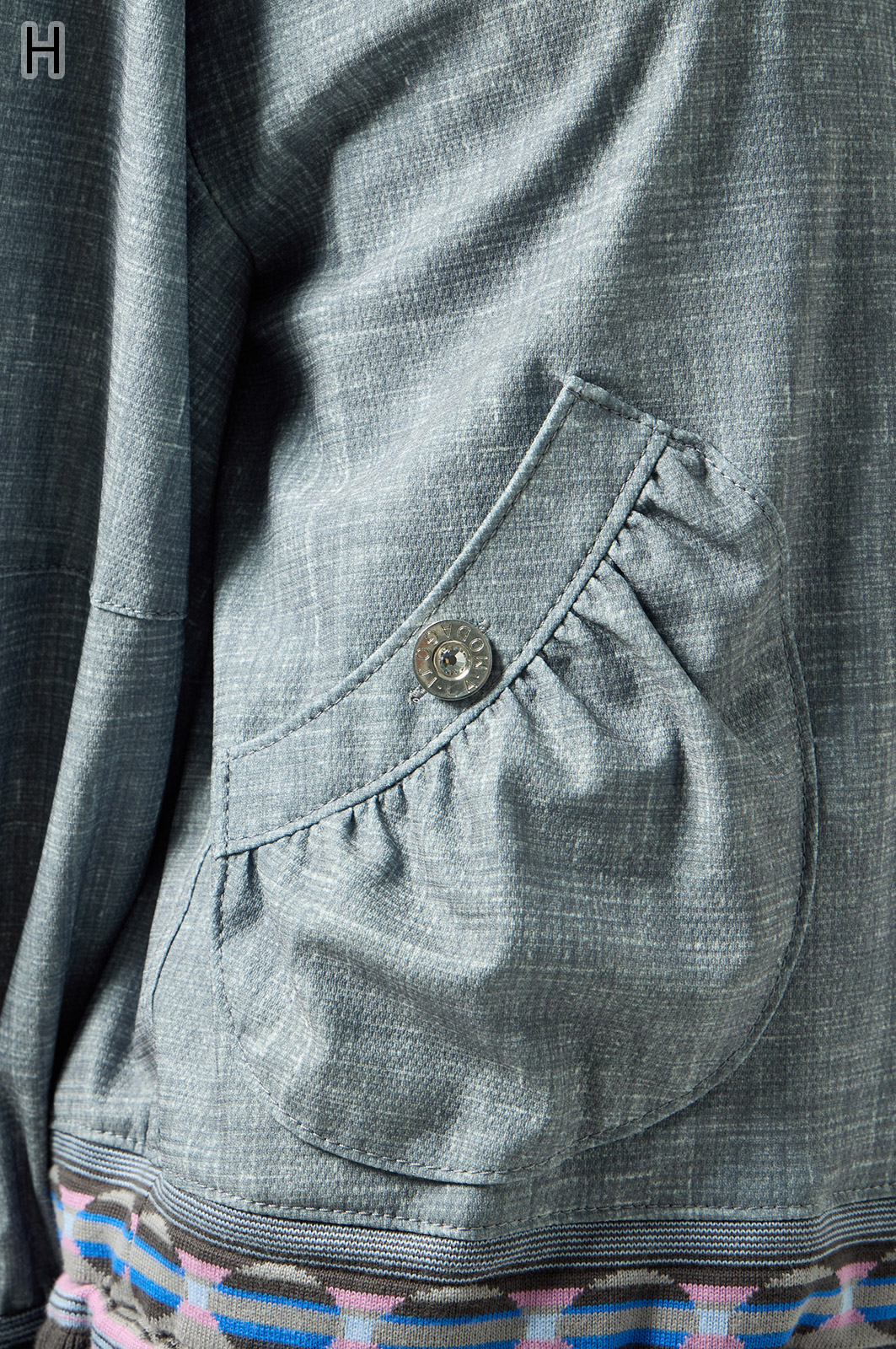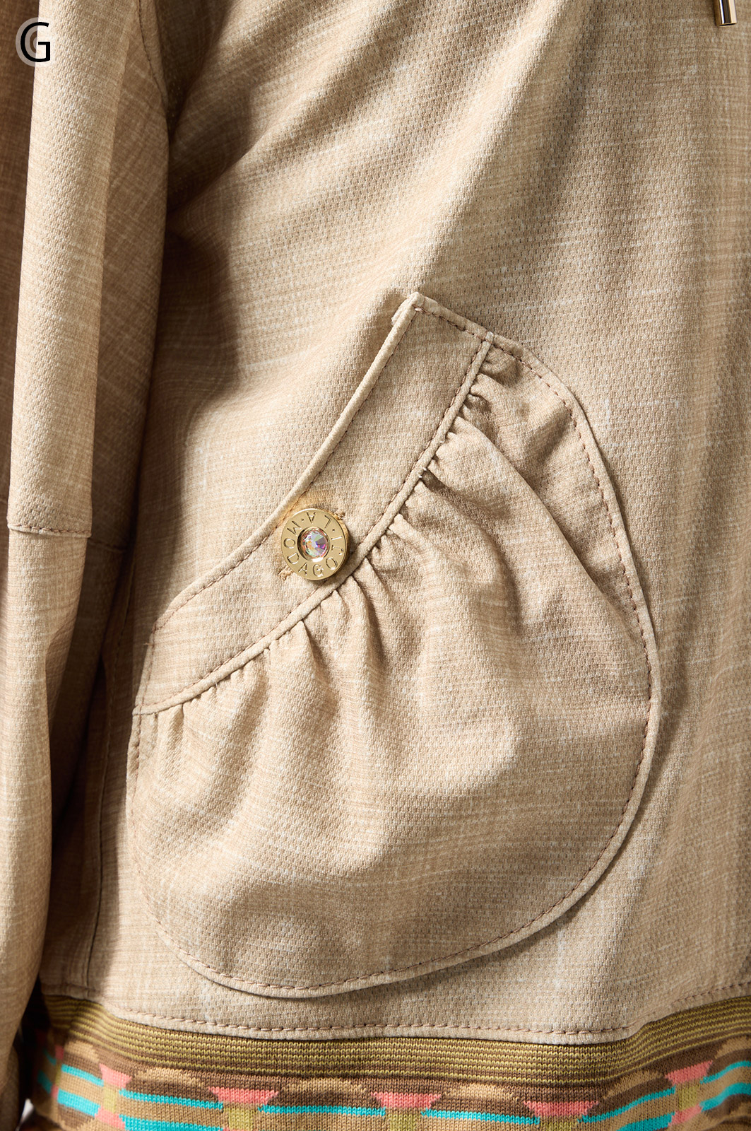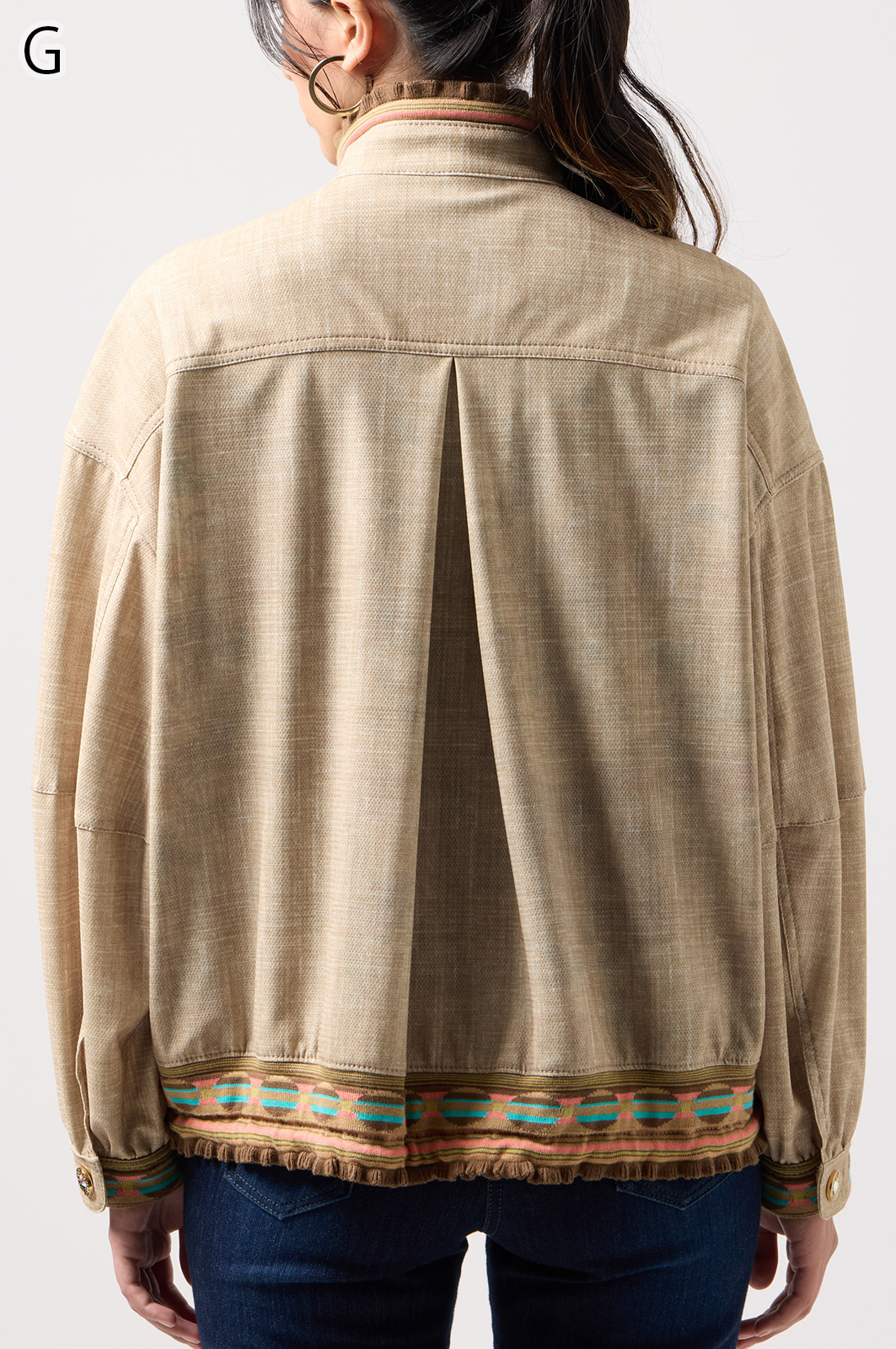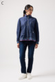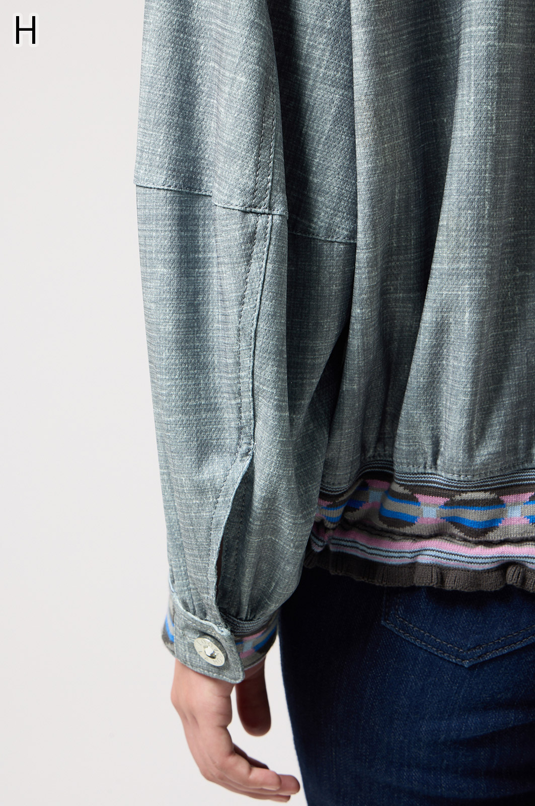 ストレッチのきいたデニム風素材を使ったブルゾン。フリルがアクセントになり、背中の裏地にはチェーン柄やロゴ、サーバルキャットの楽しいプリント入り。