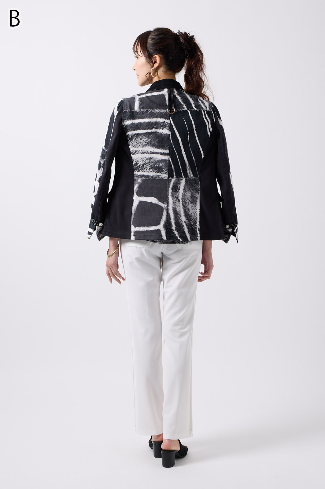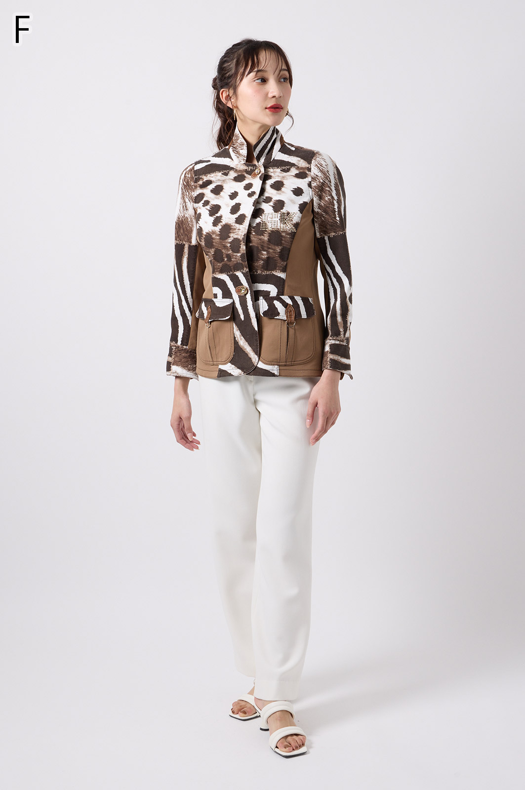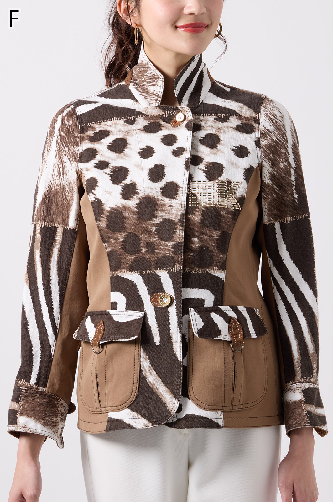 動物をイメージしたユニークなプリントが目を引くジャケット。やわらかな綿素材と、ほどよく伸びる生地を組み合わせているから、見た目だけじゃなく着心地もばっちりです。