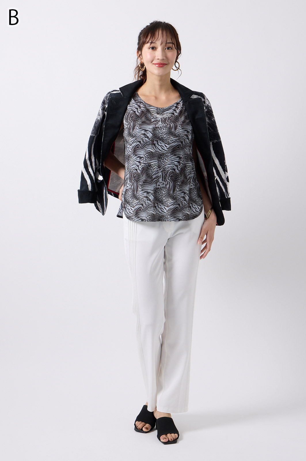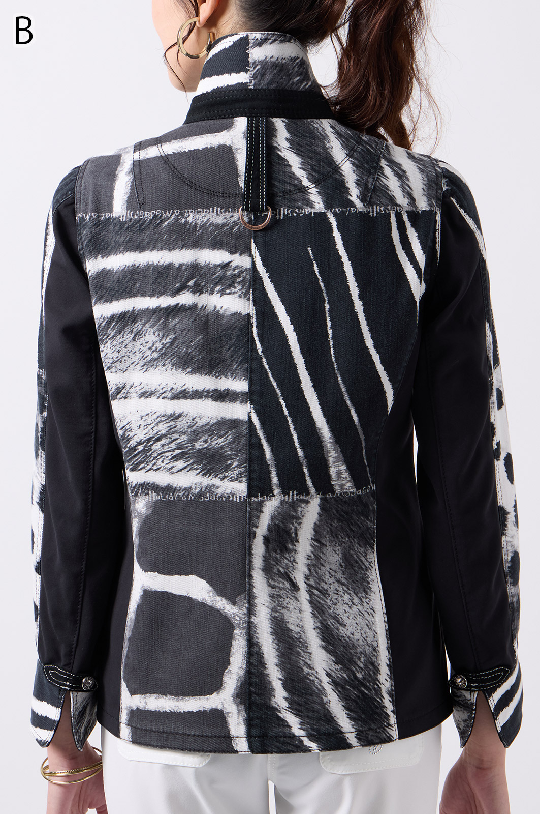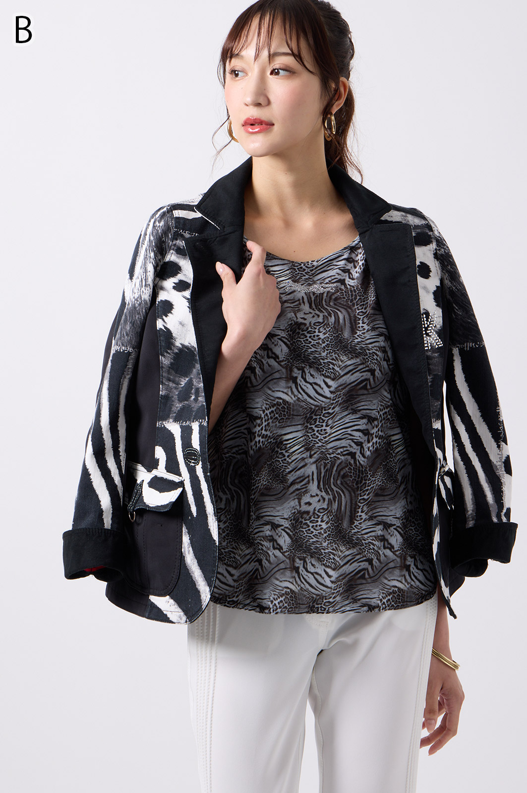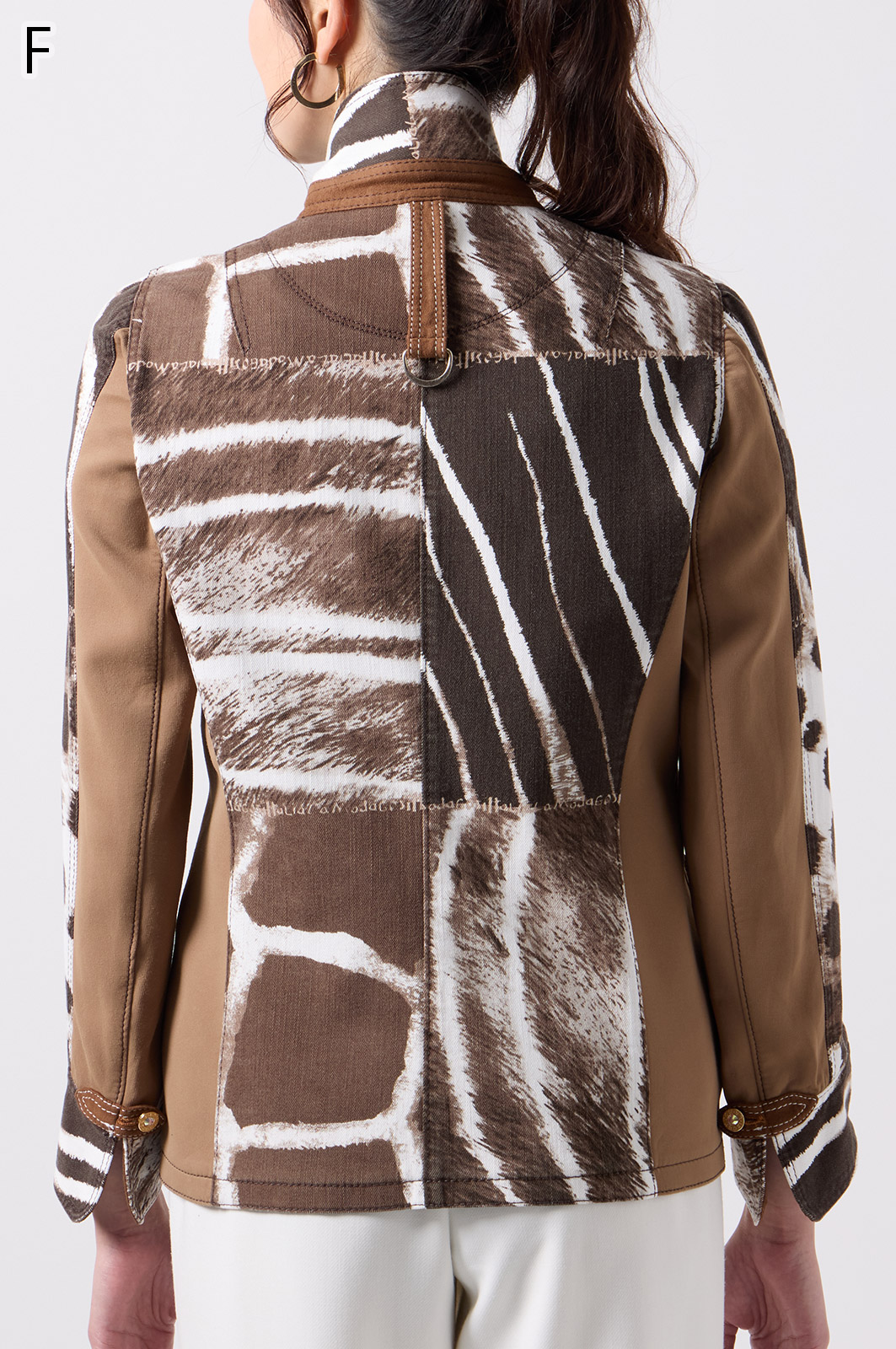 動物をイメージしたユニークなプリントが目を引くジャケット。やわらかな綿素材と、ほどよく伸びる生地を組み合わせているから、見た目だけじゃなく着心地もばっちりです。