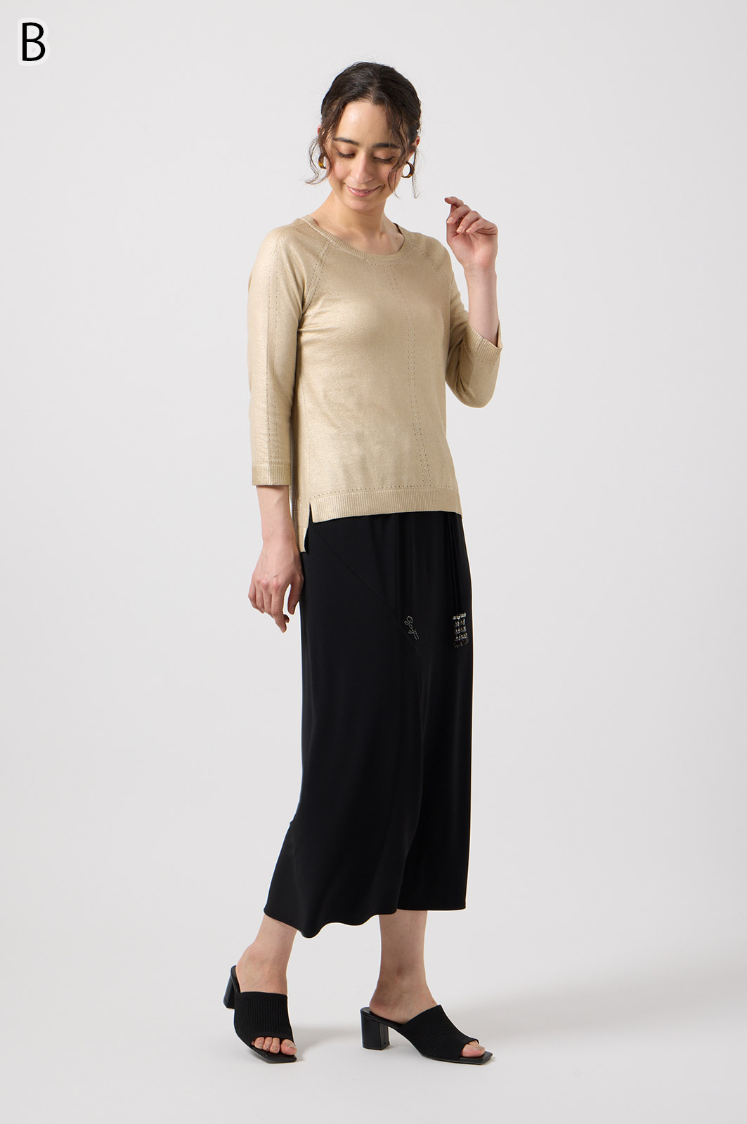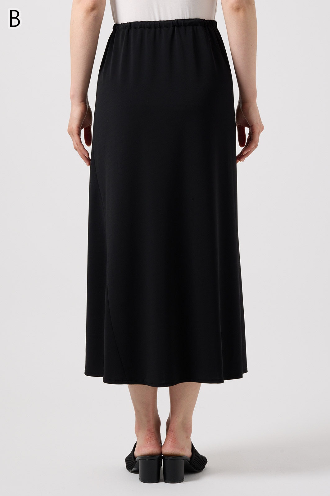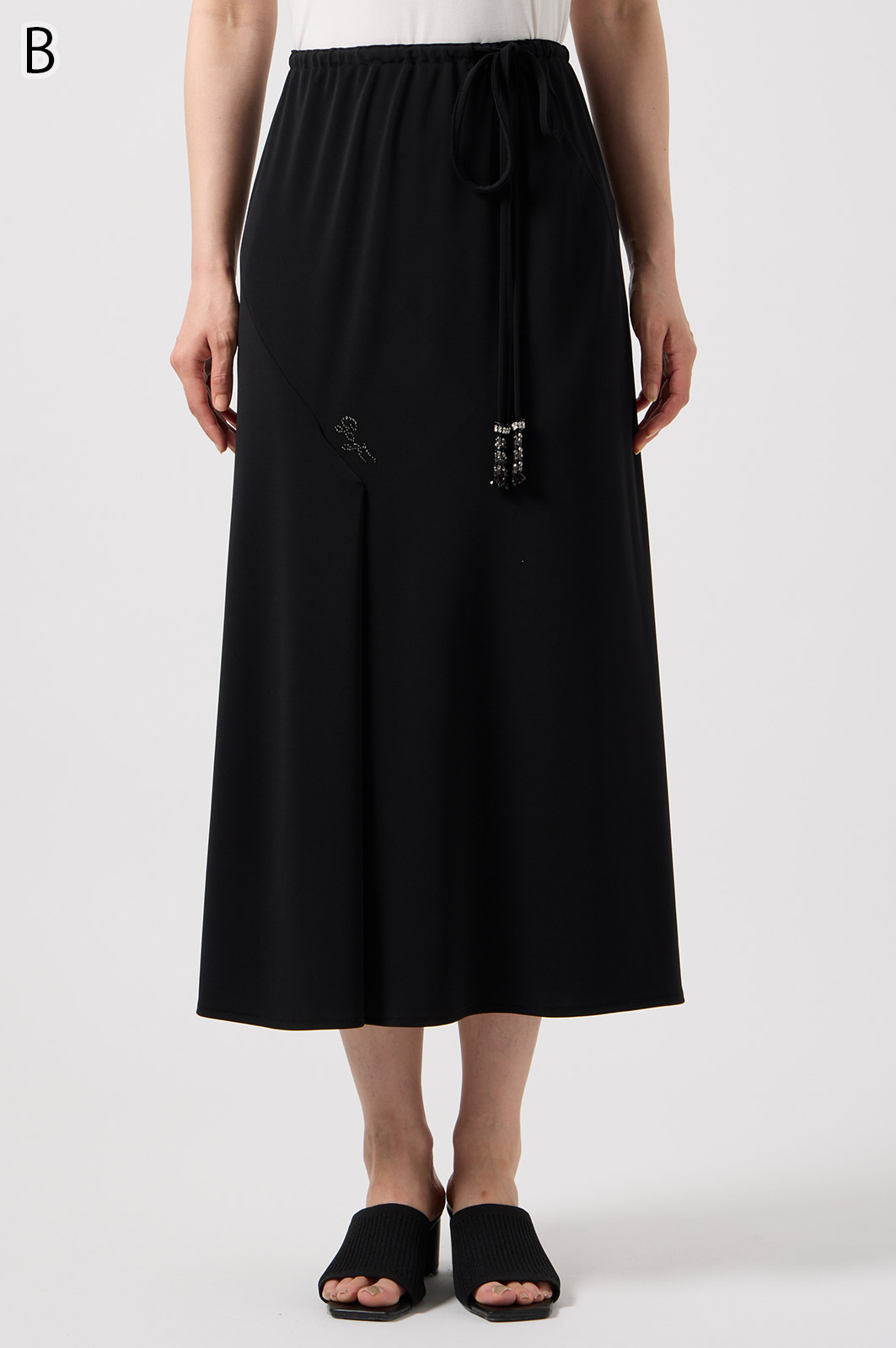 やわらかくてきれいなドレープが出る軽やか素材のスカート。たっぷり広がるフレアシルエットが上品で、ウエストはゴム仕様でラクちん。共布のリボンにはビーズ付きで、さりげないアクセントに♪