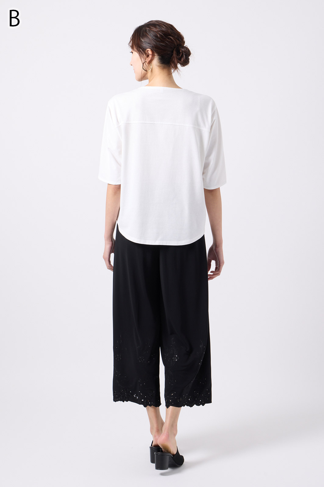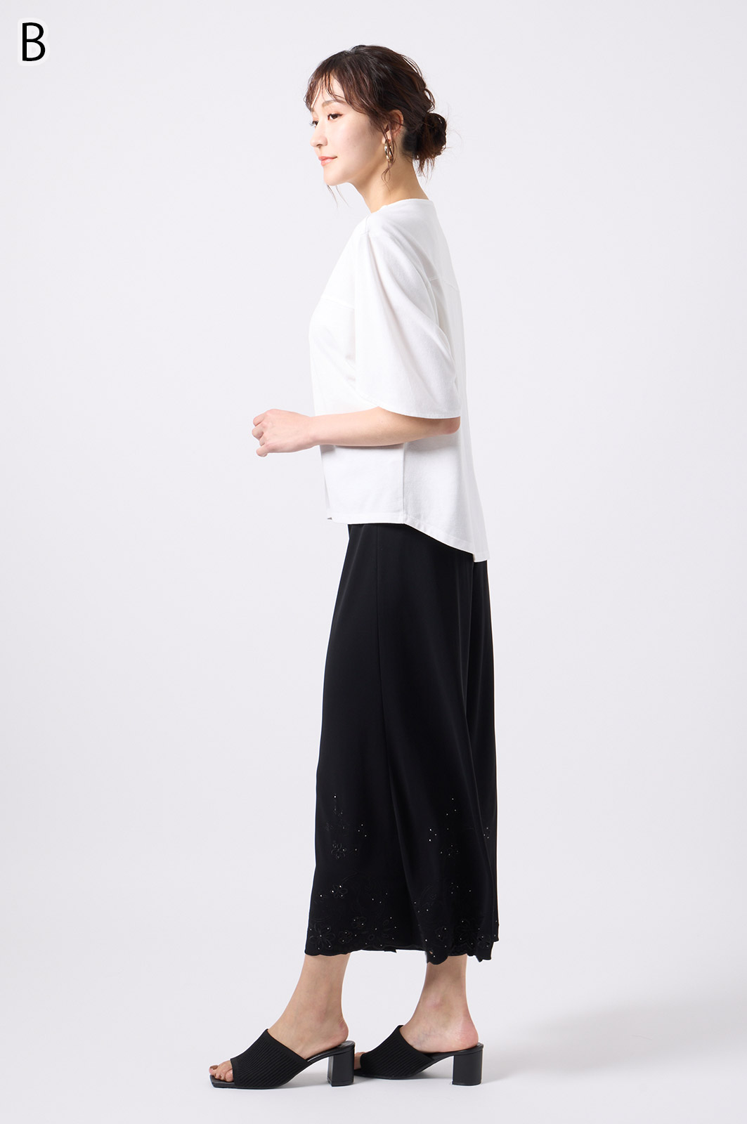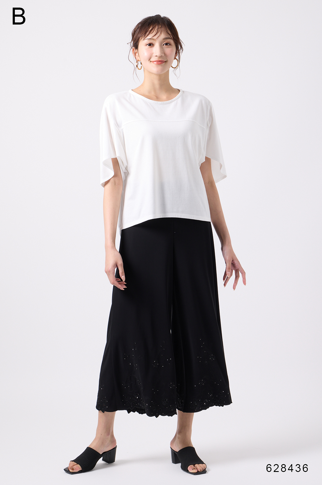 さらっとした肌ざわりで、動くたびにやわらかく揺れる軽やかな生地感。暑い季節にも心地よく着られて、見た目にも上品な印象を与えてくれます。