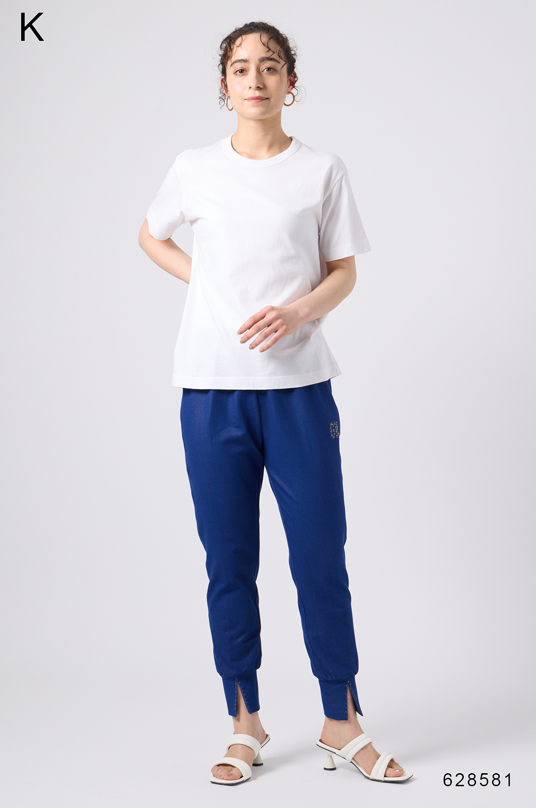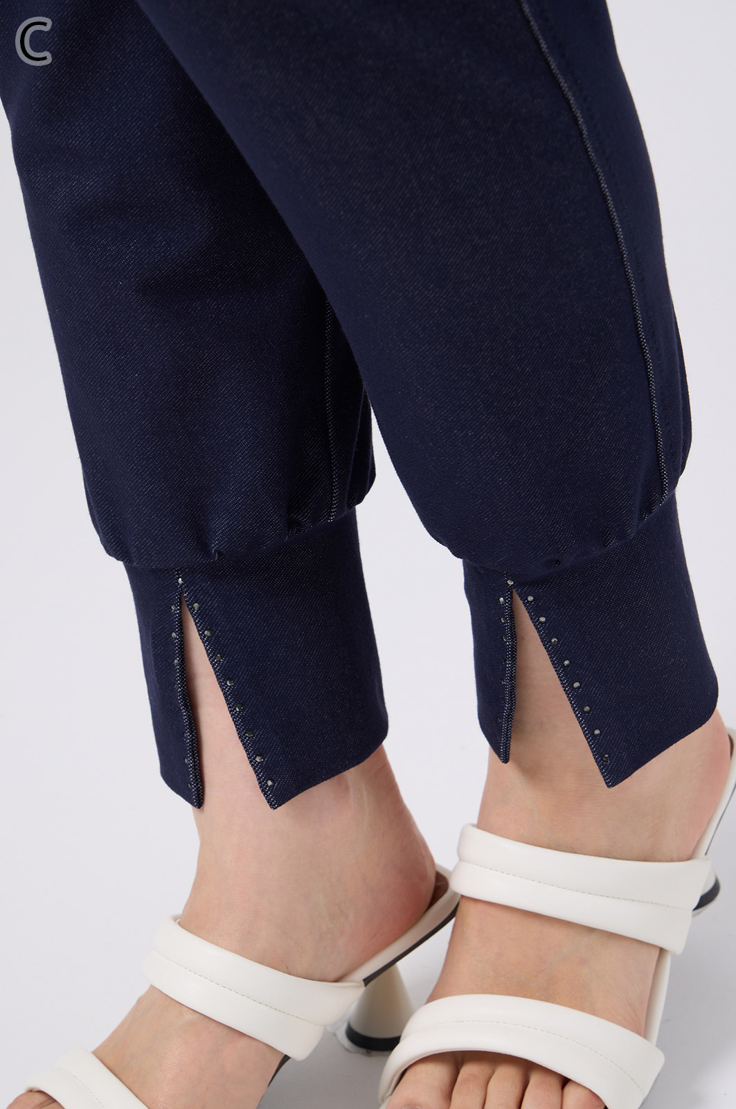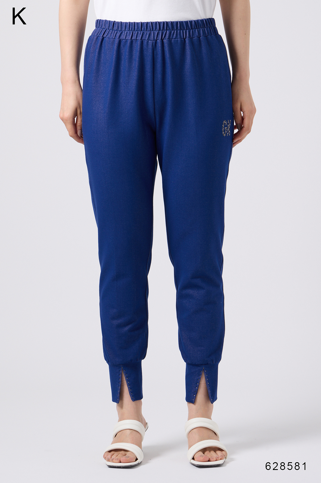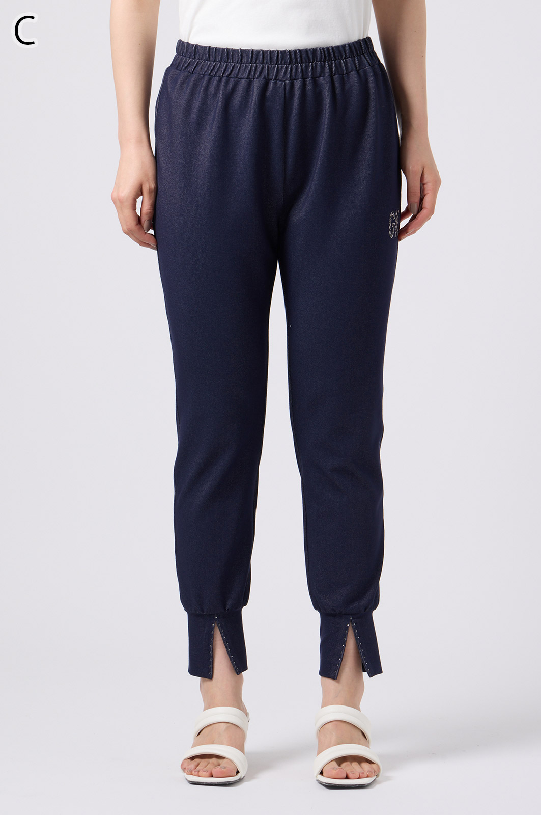 デニム風のやわらかストレッチ素材ではき心地ラクちん。ウエストはゴム仕様で着脱も簡単。裾のスリット入りデザインが足首をきれいに見せて、軽やかな印象をプラスします。