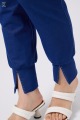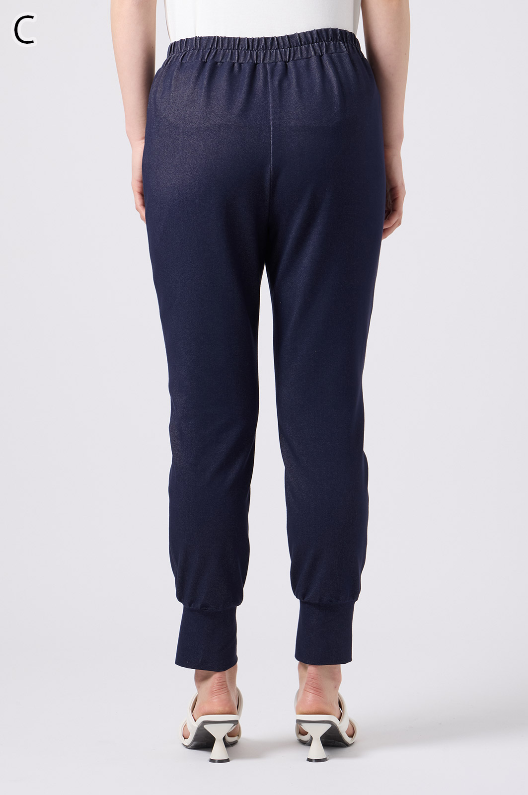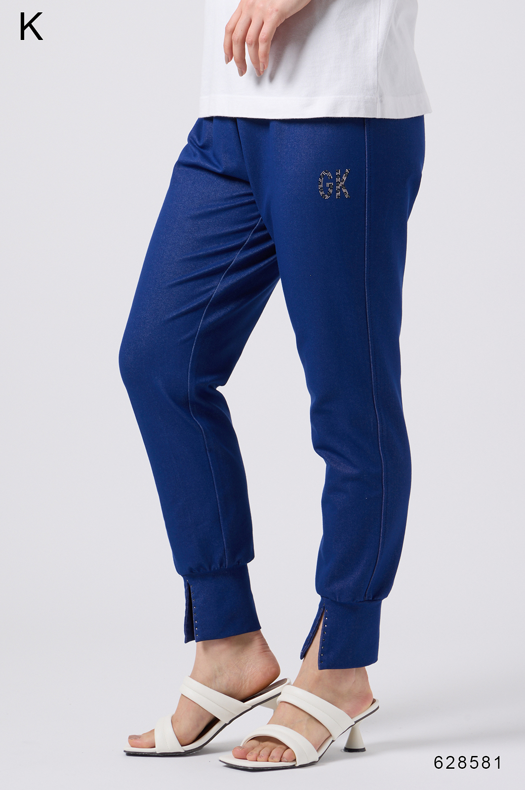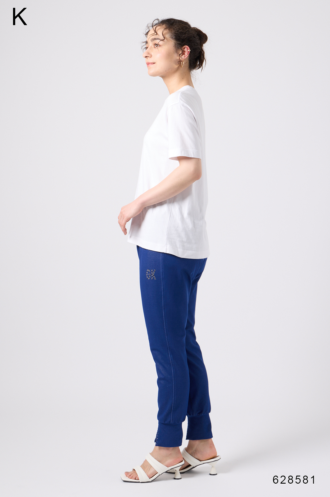 デニム風のやわらかストレッチ素材ではき心地ラクちん。ウエストはゴム仕様で着脱も簡単。裾のスリット入りデザインが足首をきれいに見せて、軽やかな印象をプラスします。