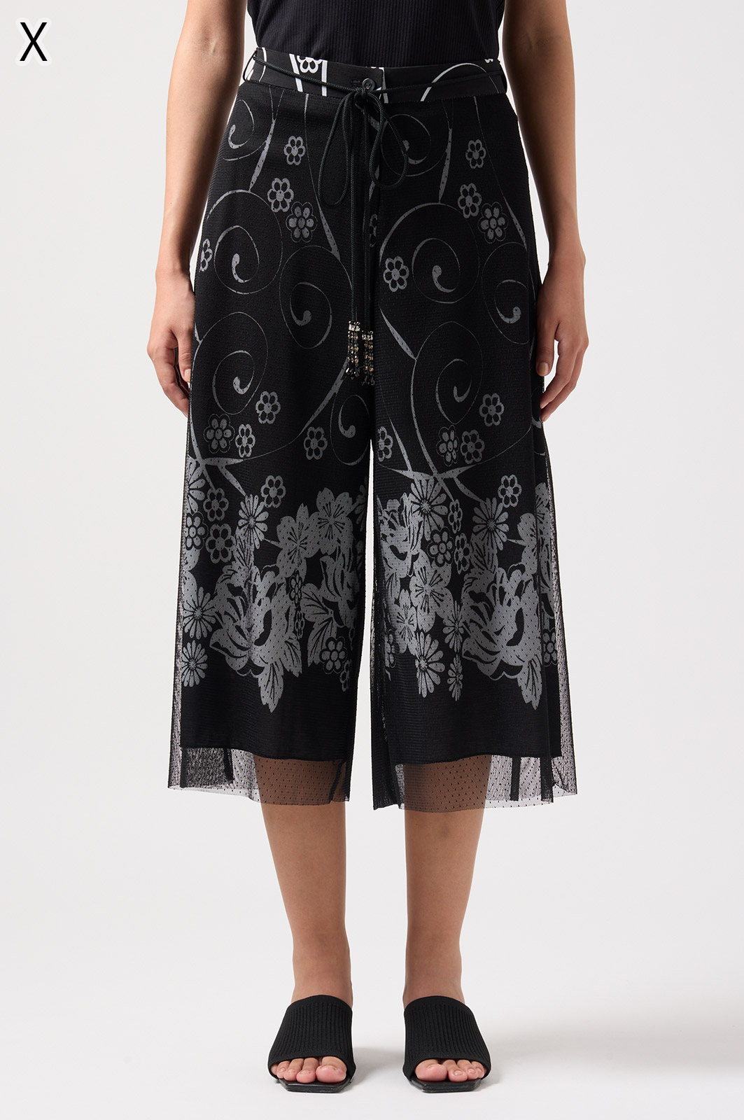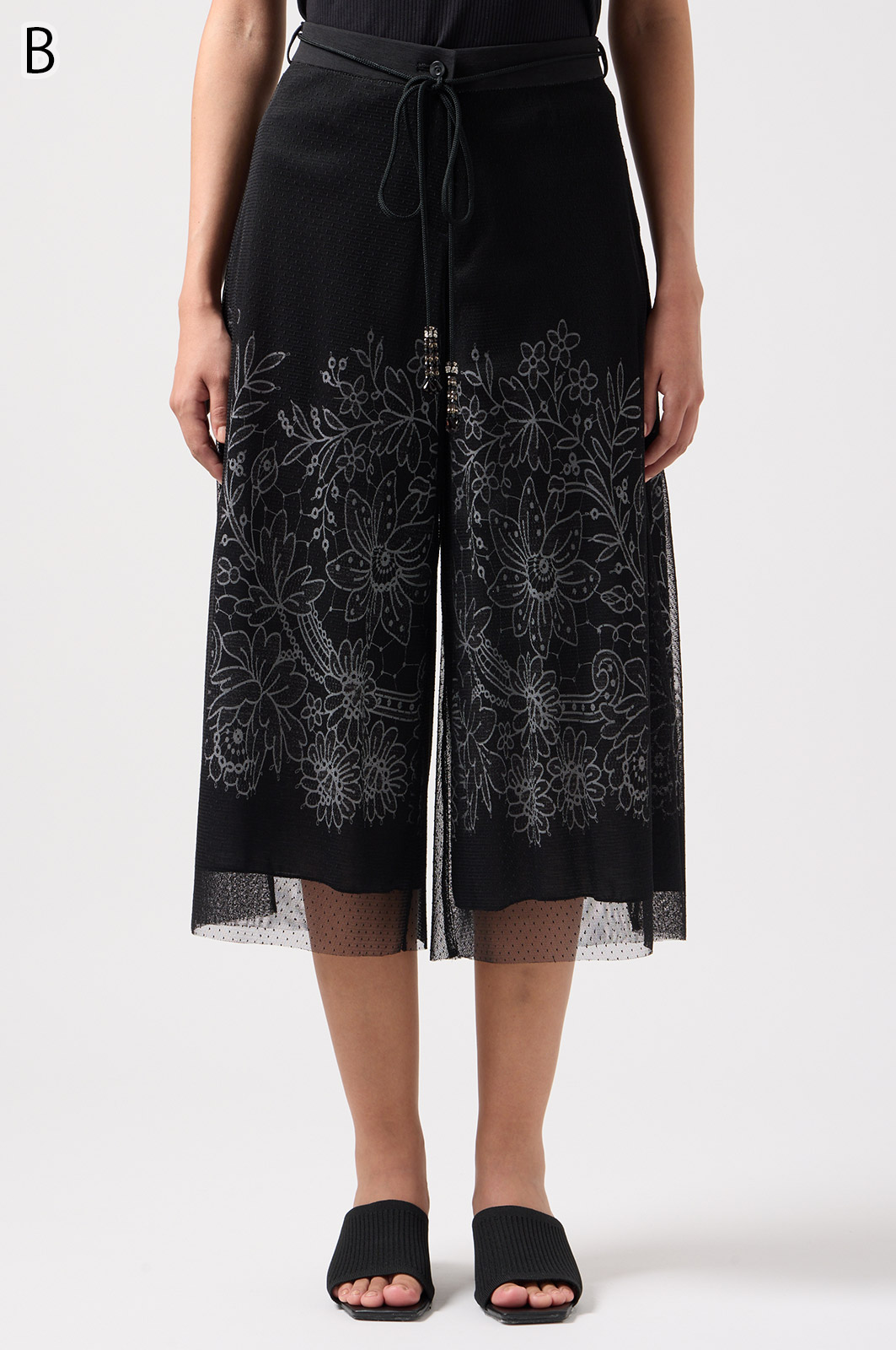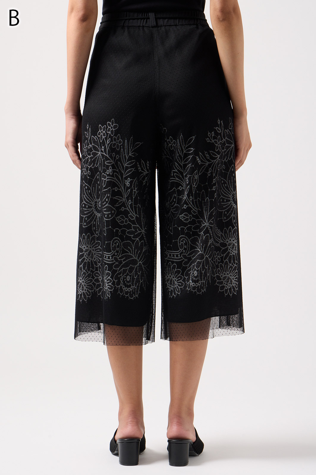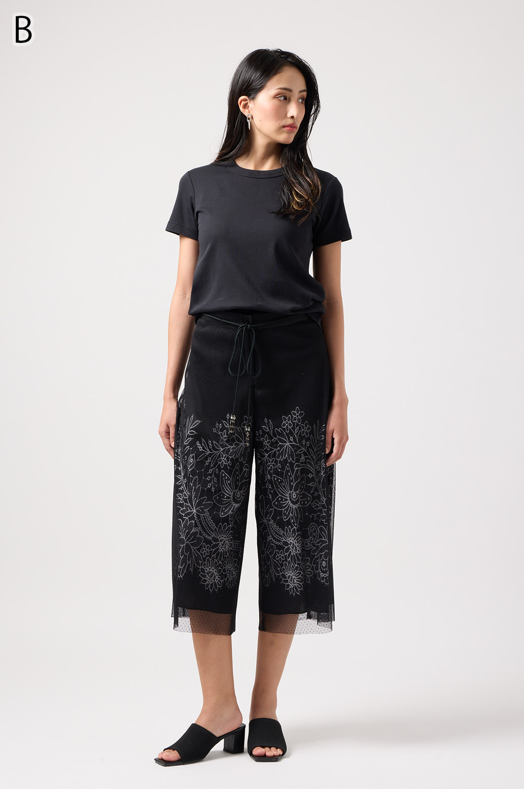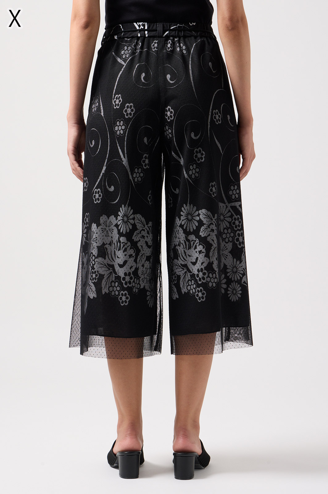 なめらかに揺れるパンツに、透け感のあるドットメッシュを重ねた上品デザイン。内側の白プリントがほんのり透けて華やかさを演出。ウエストの飾り紐付きベルト付き