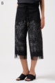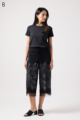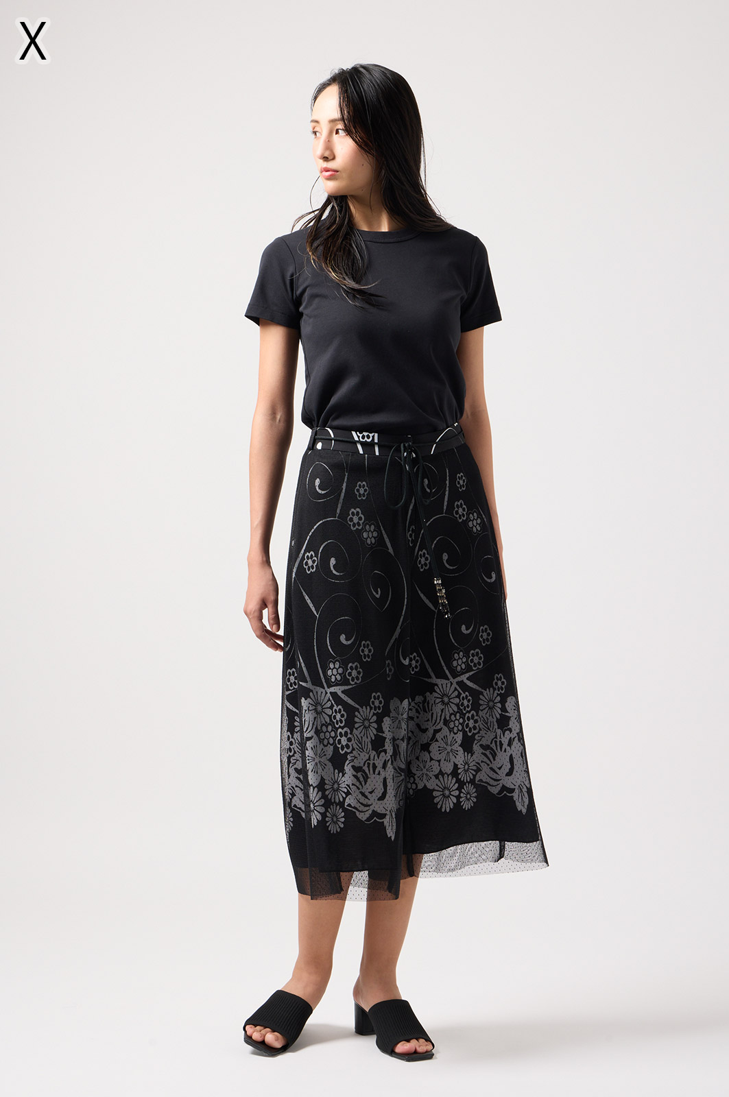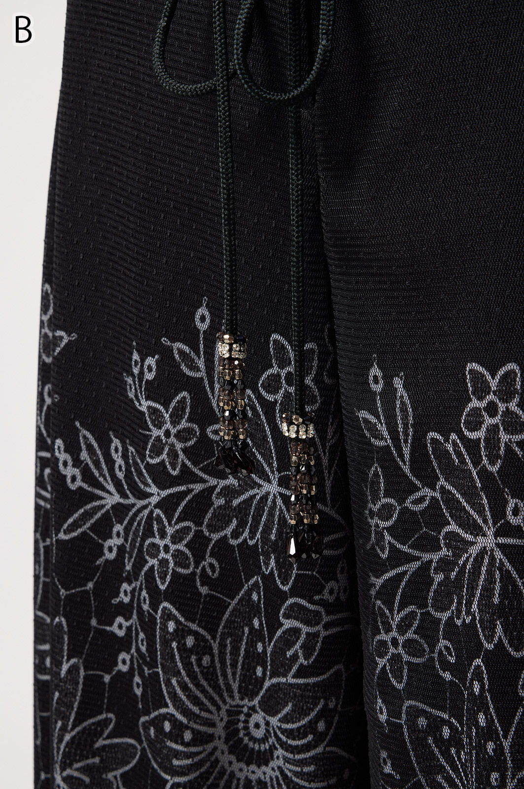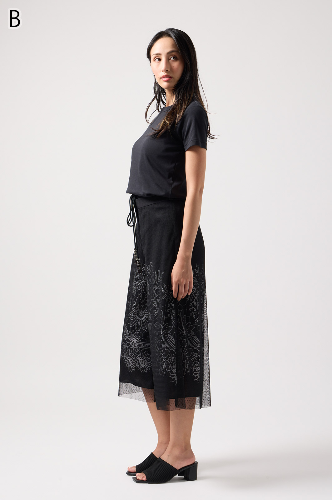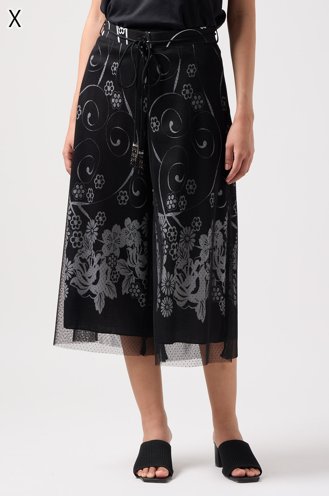 なめらかに揺れるパンツに、透け感のあるドットメッシュを重ねた上品デザイン。内側の白プリントがほんのり透けて華やかさを演出。ウエストの飾り紐付きベルト付き