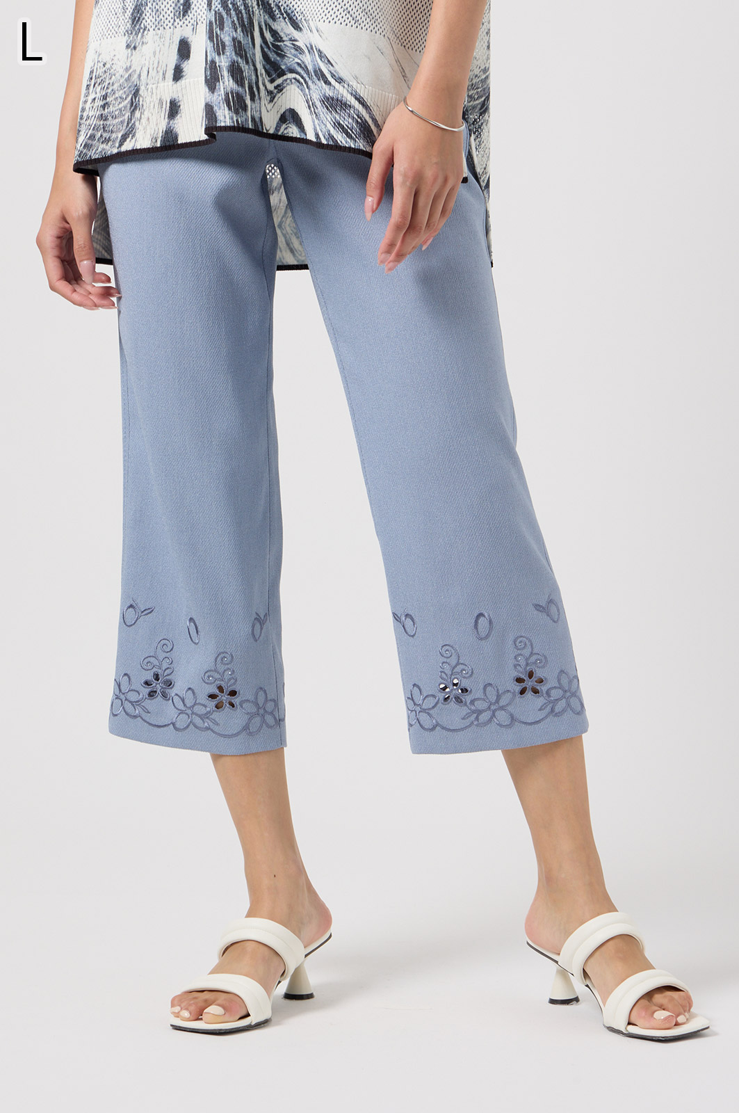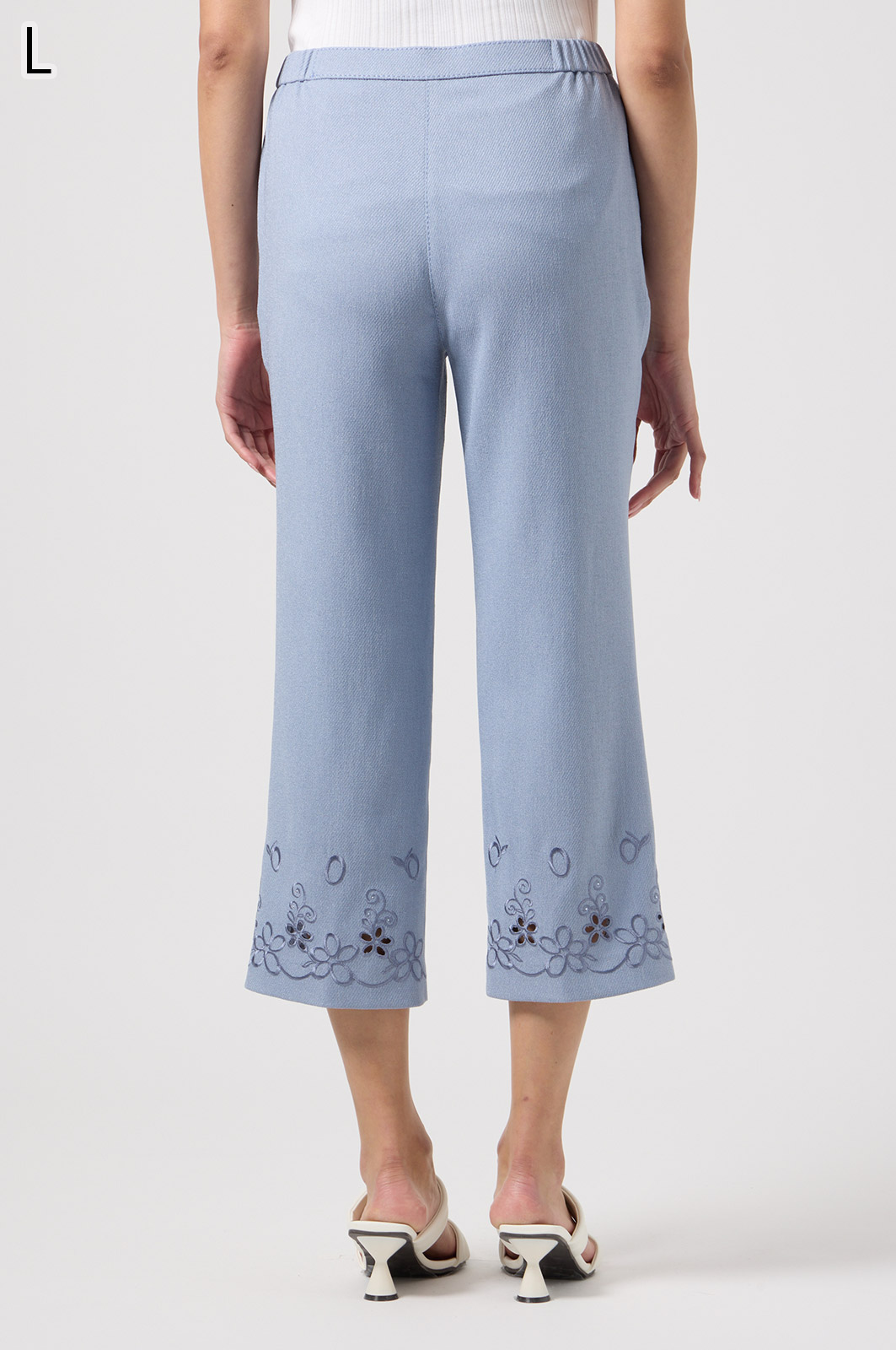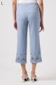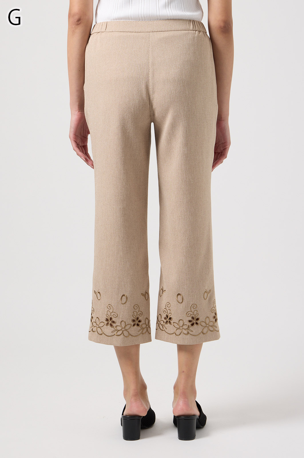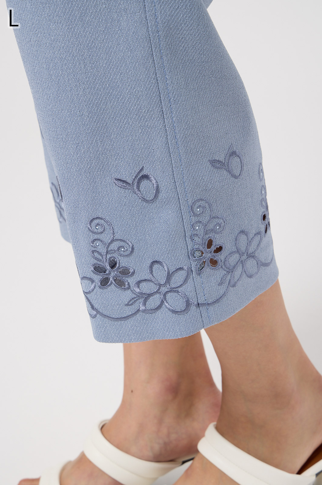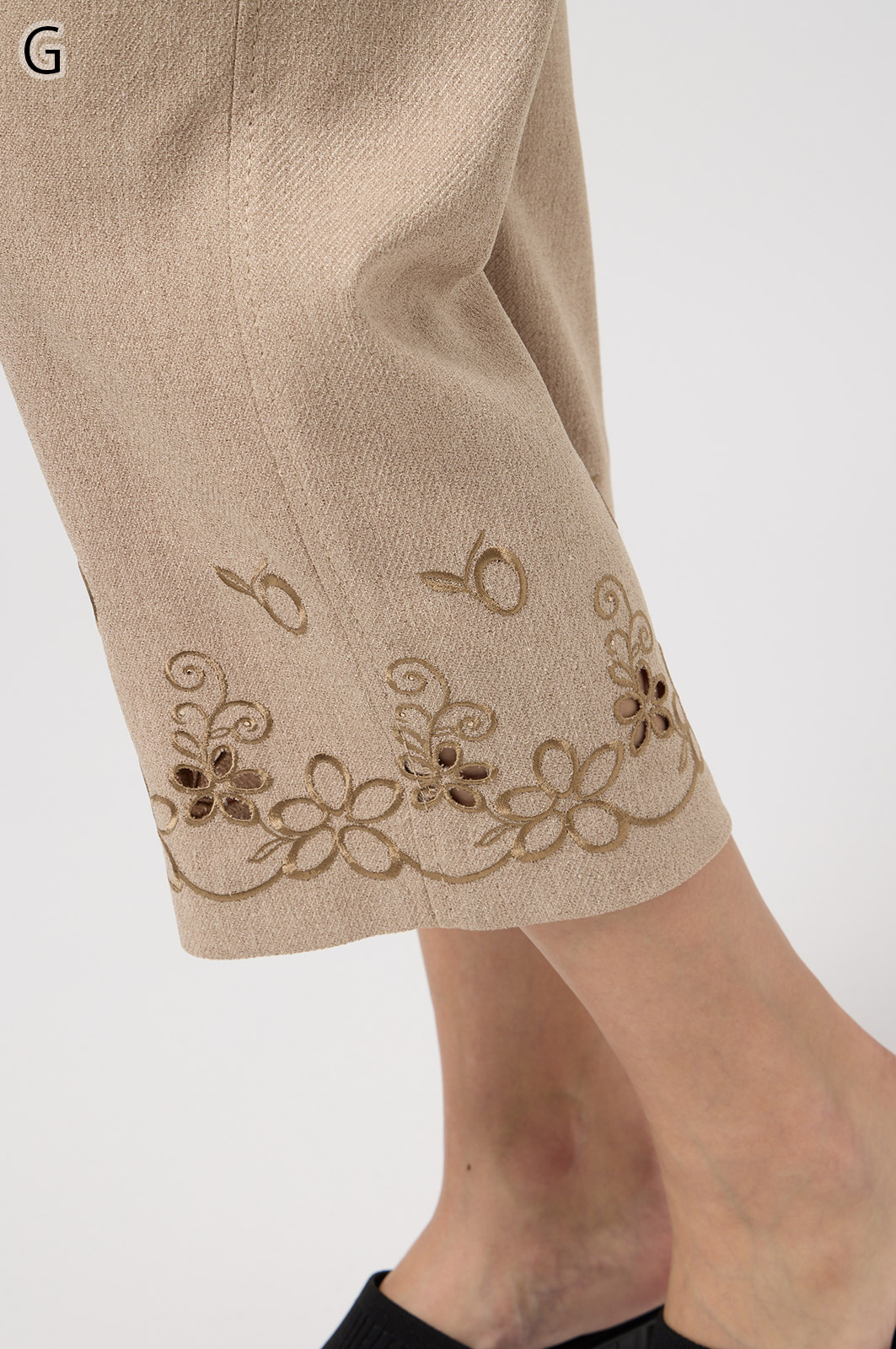 軽くて動きやすいストレッチ素材を使用。麻のような風合いなのにシワになりにくく、お手入れも簡単。花の刺しゅうが上品な8分丈パンツです。
