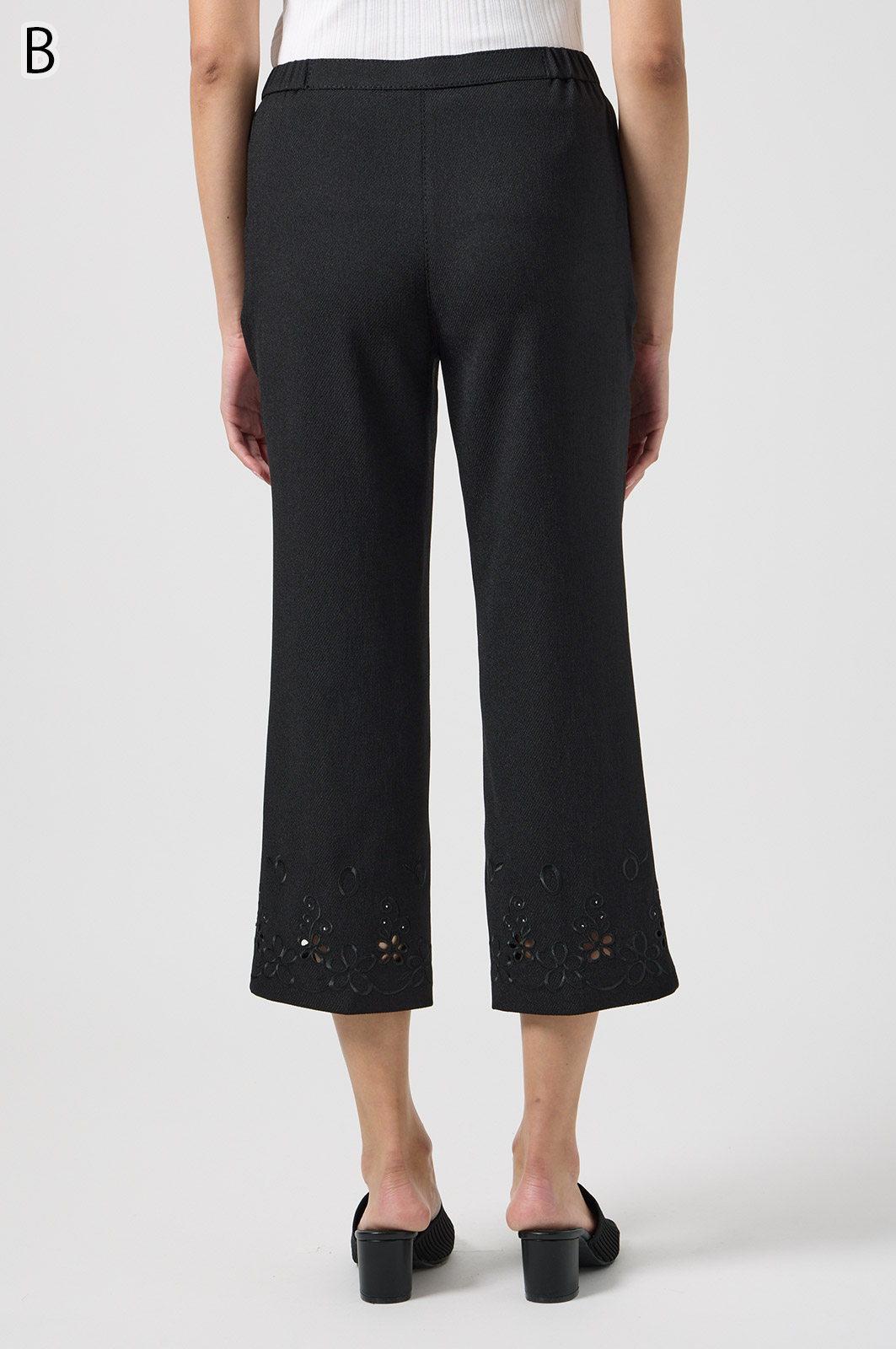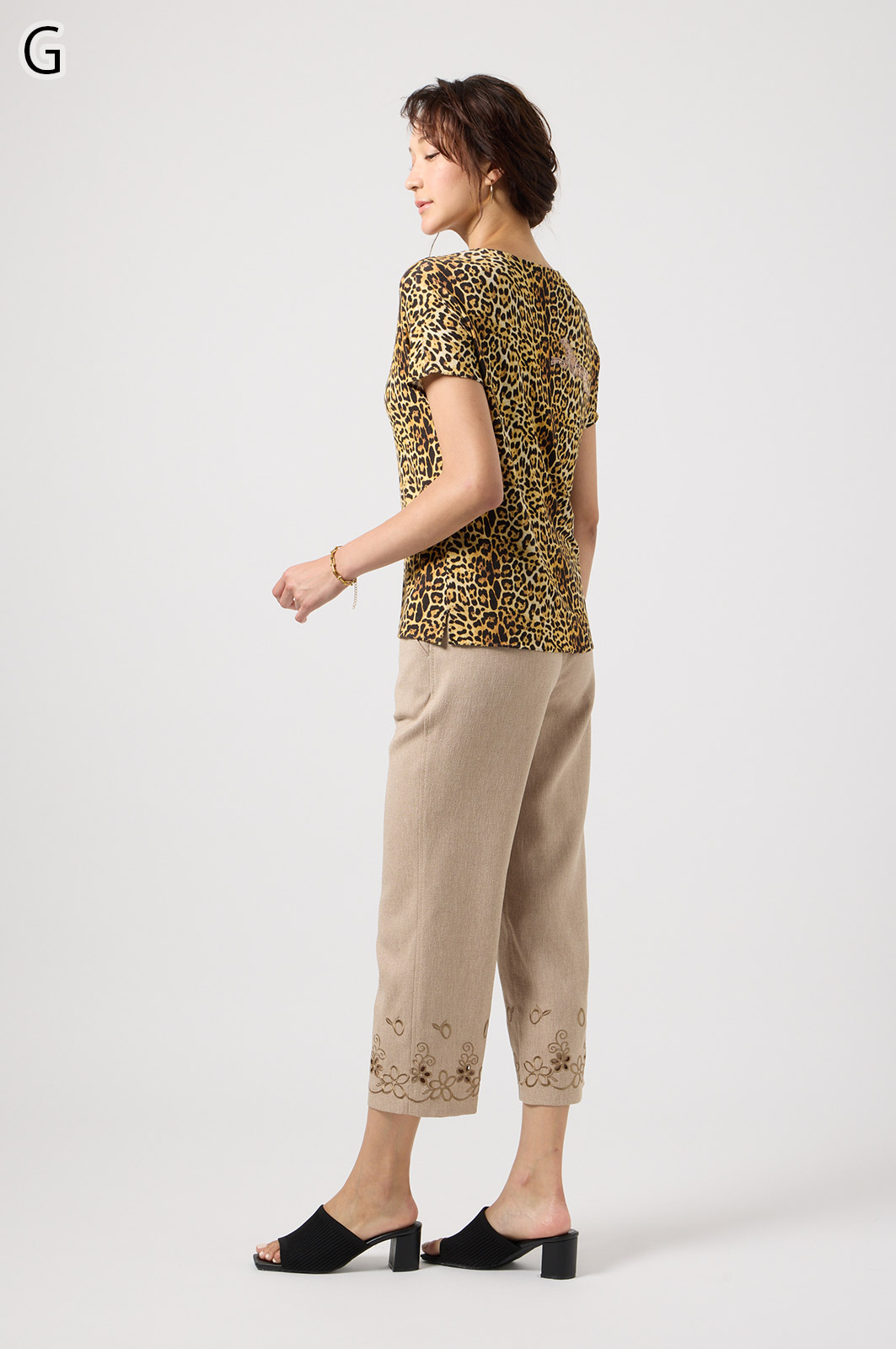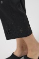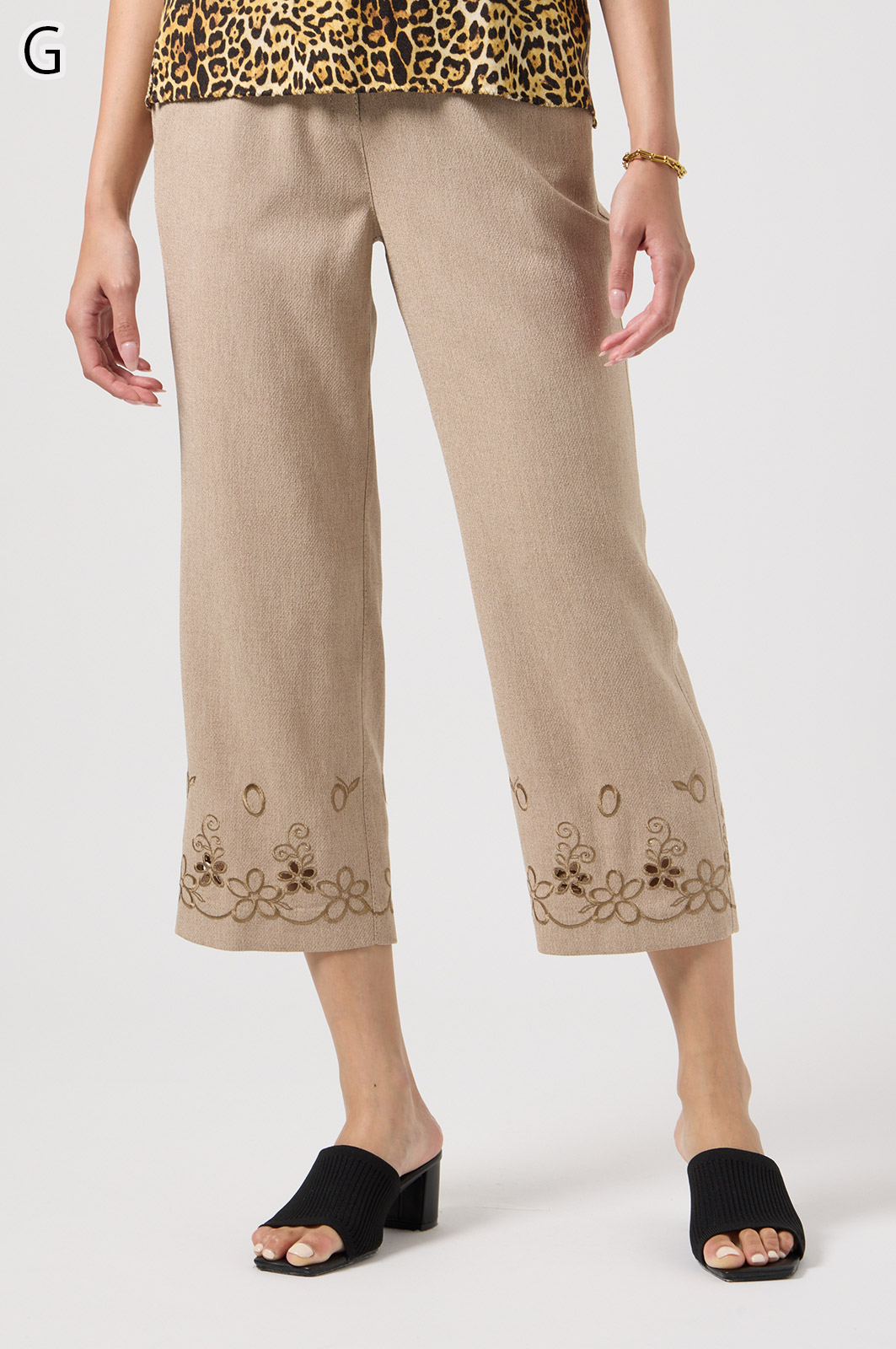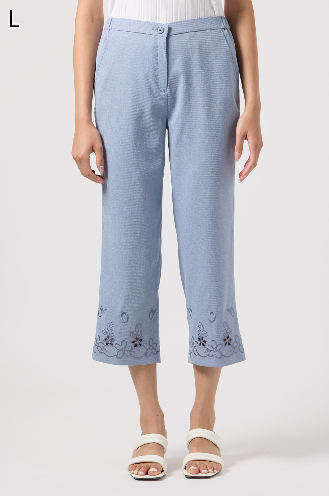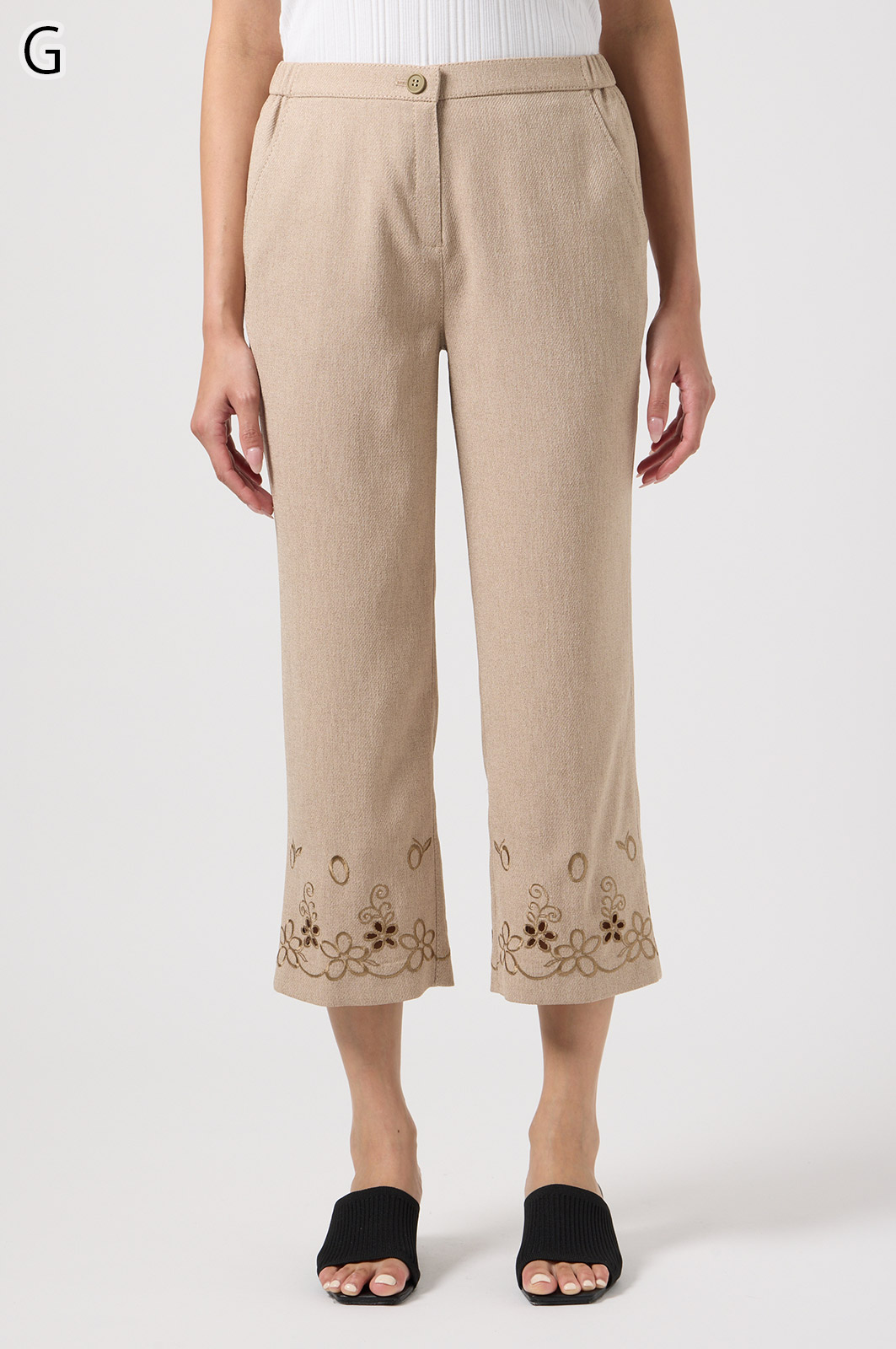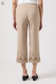 軽くて動きやすいストレッチ素材を使用。麻のような風合いなのにシワになりにくく、お手入れも簡単。花の刺しゅうが上品な8分丈パンツです。
