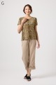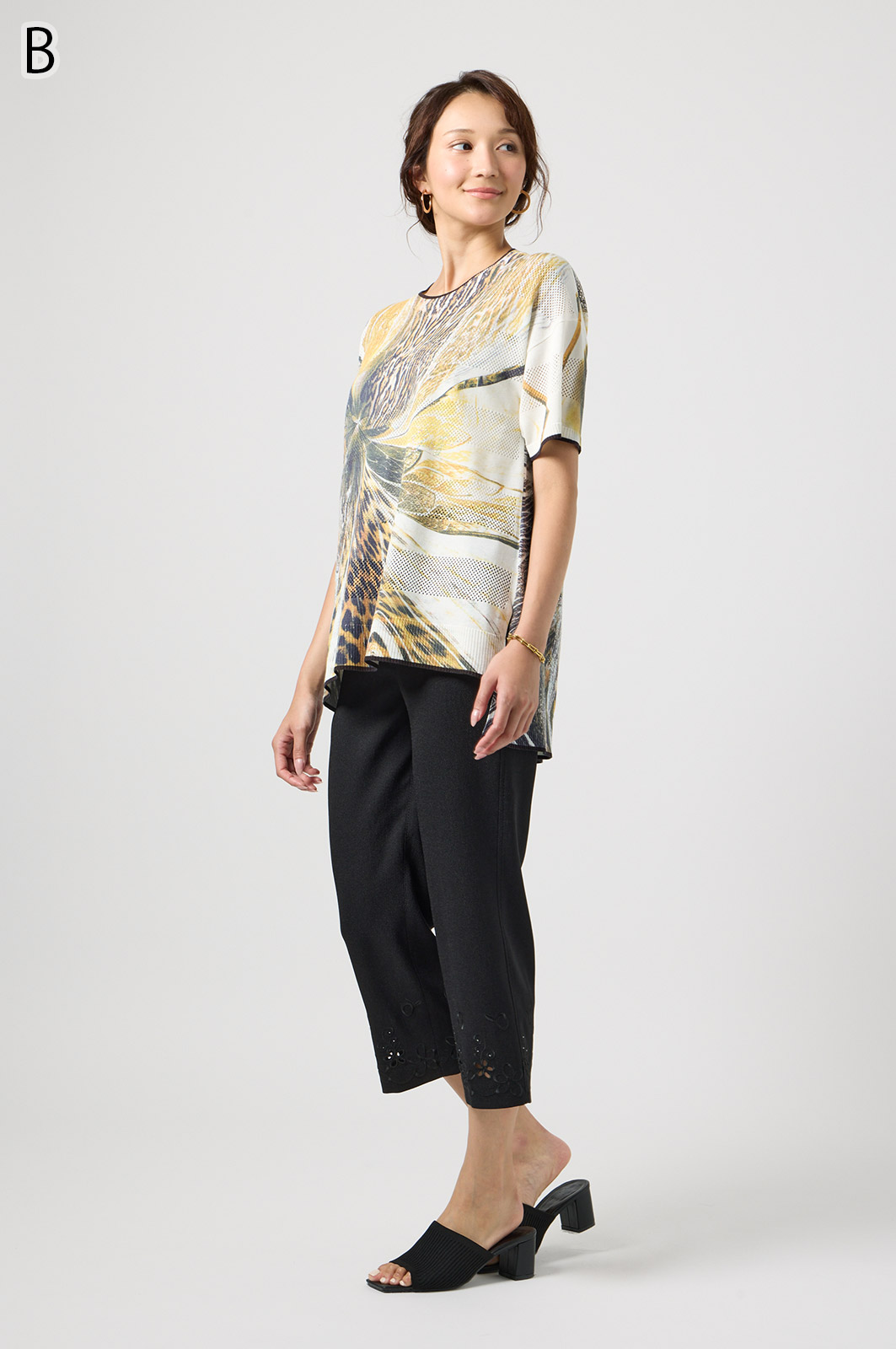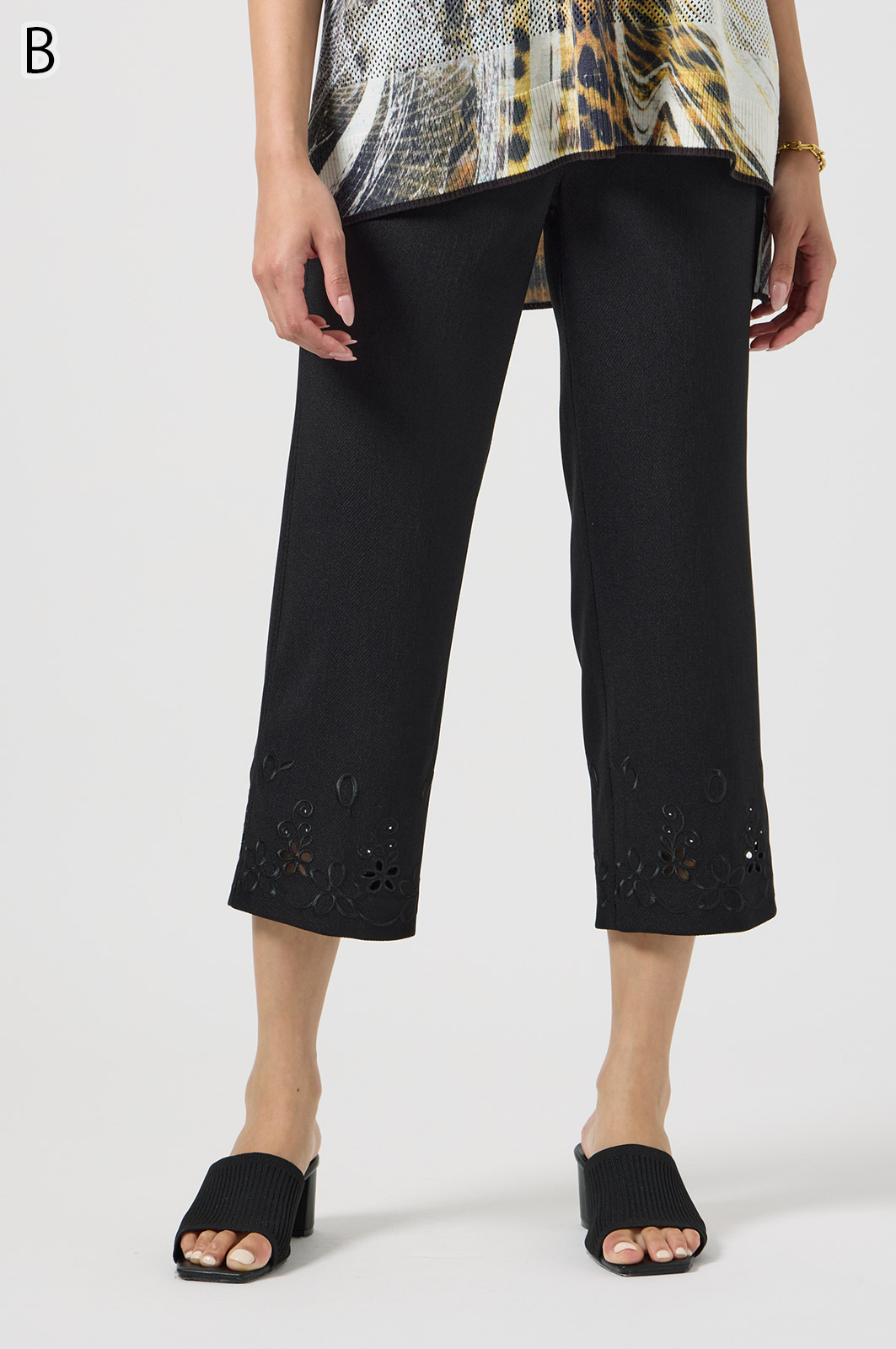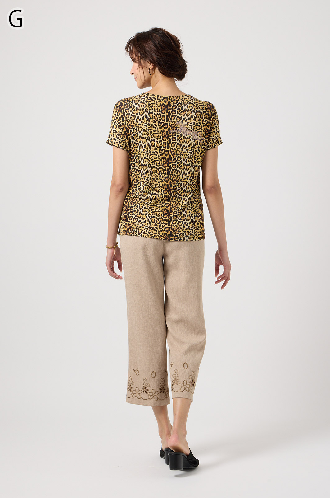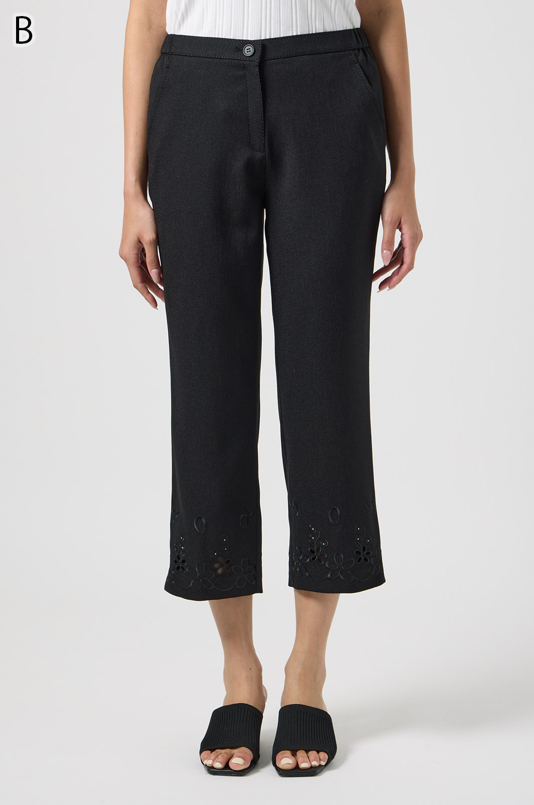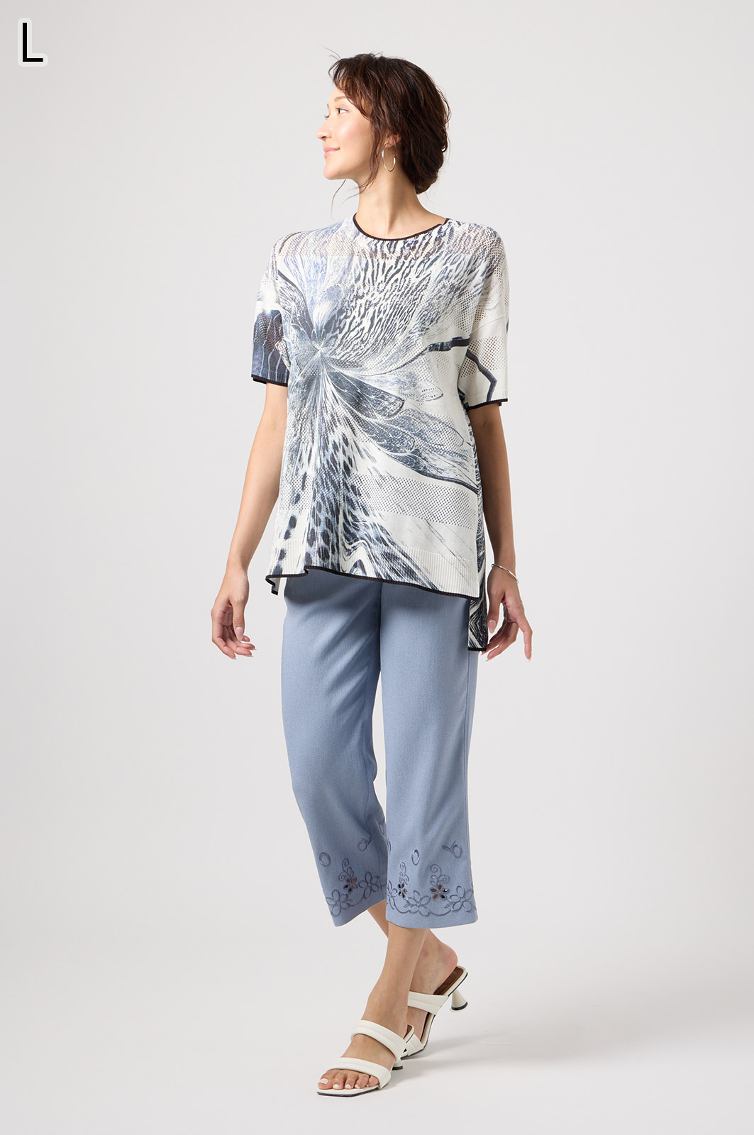 軽くて動きやすいストレッチ素材を使用。麻のような風合いなのにシワになりにくく、お手入れも簡単。花の刺しゅうが上品な8分丈パンツです。