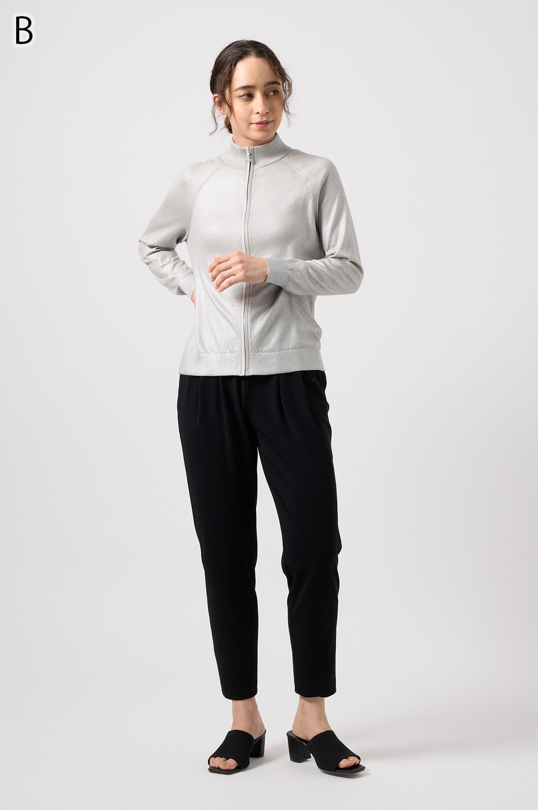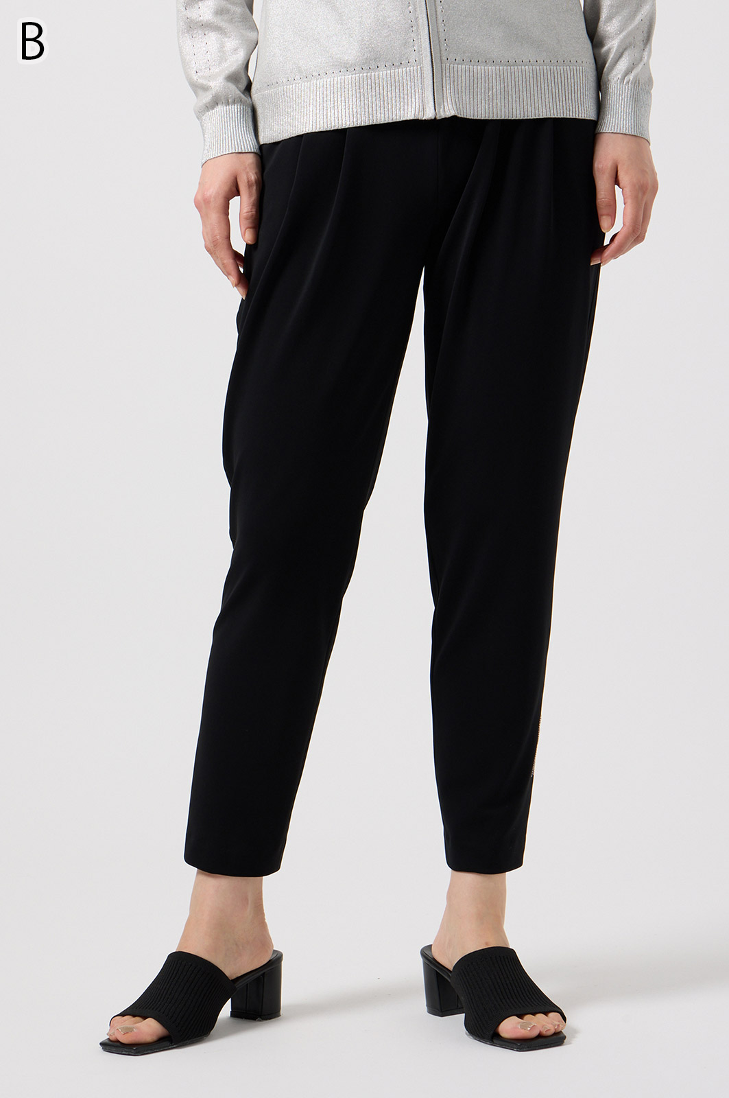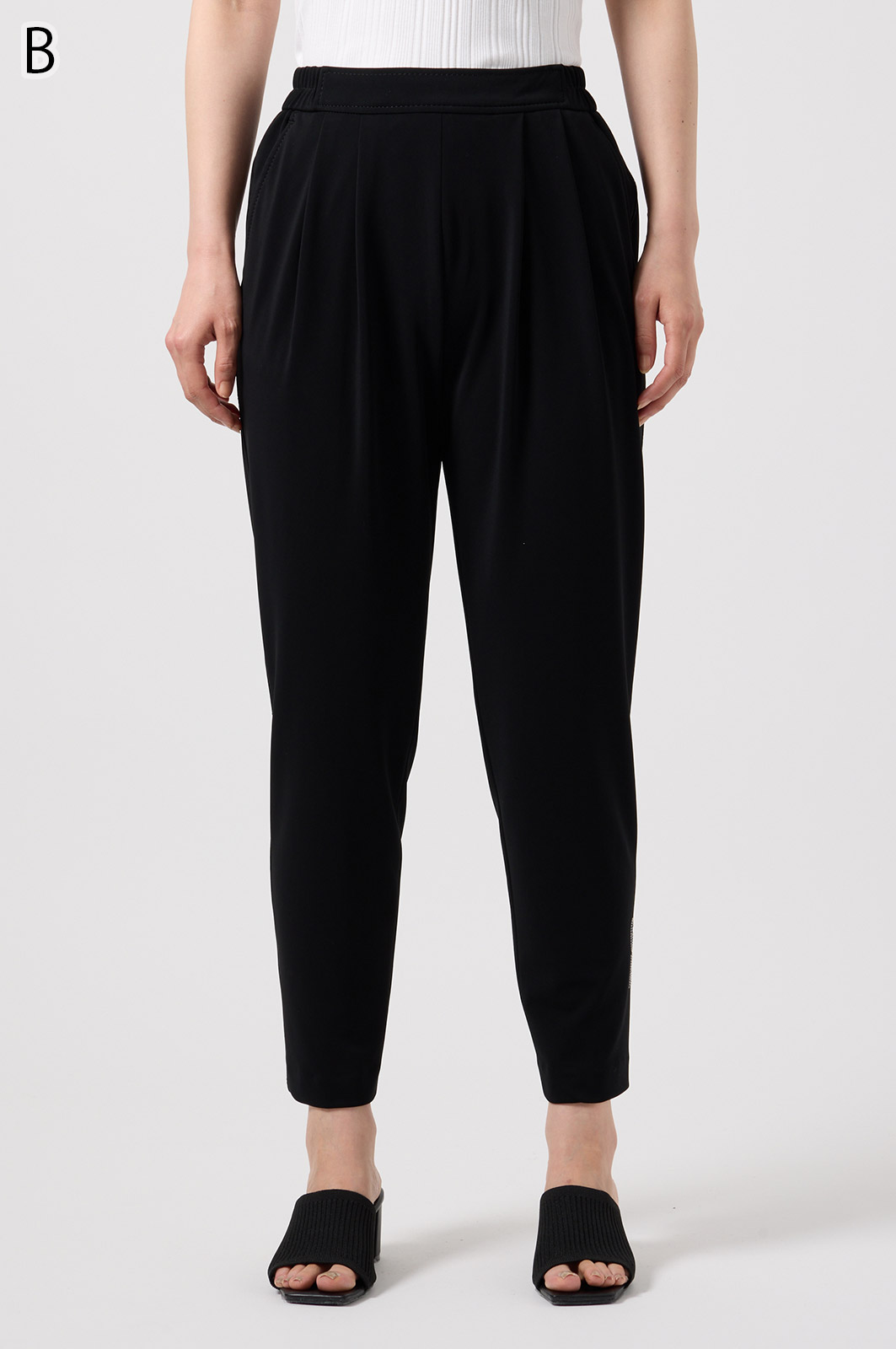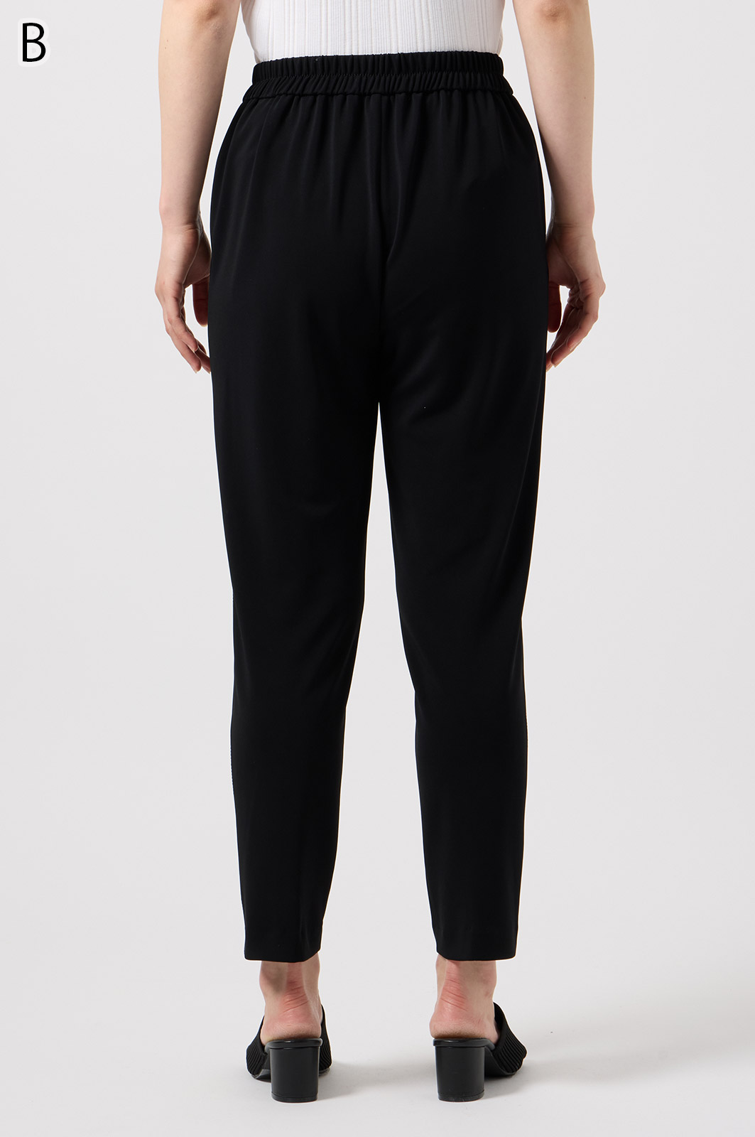 肌ざわりがなめらかで少しツヤのある素材を使い、きれいなシルエットが出る上品な落ち感。ウエストはゴム仕様で、すっきり細めのシルエットが楽しめる楽ちんツータックパンツです。