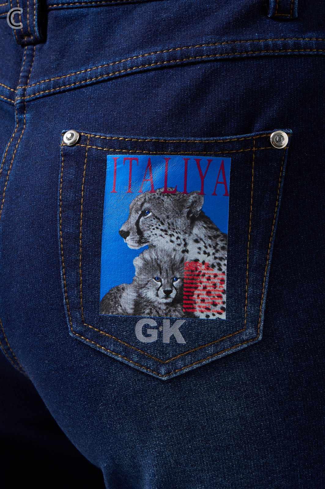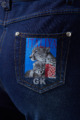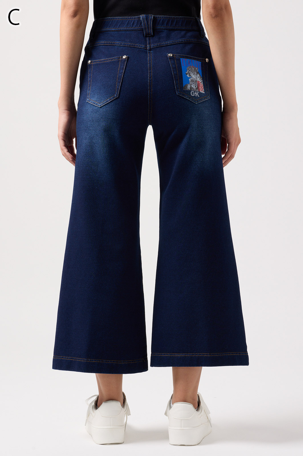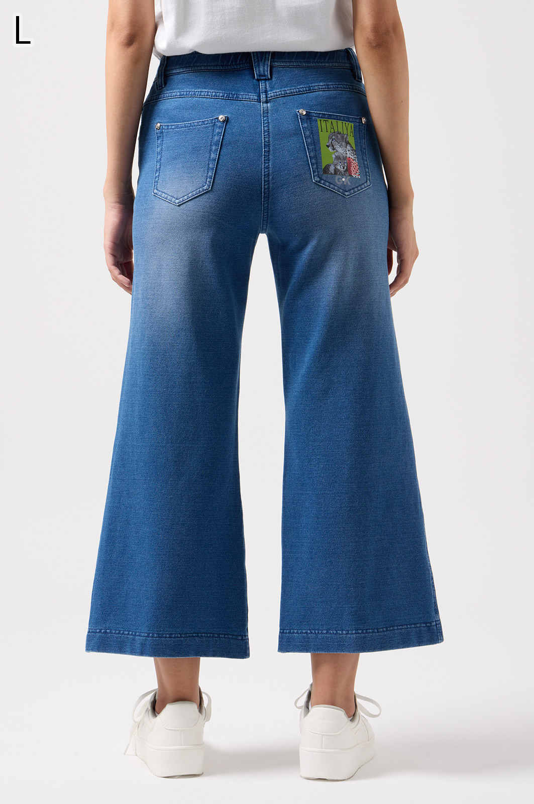 ラクにはけるウエストゴム仕様のバギーパンツ。やわらかい裏パイル素材で肌ざわりも◎。デニム風のインディゴカラーに、オリジナルプリントがさりげないアクセントに♪