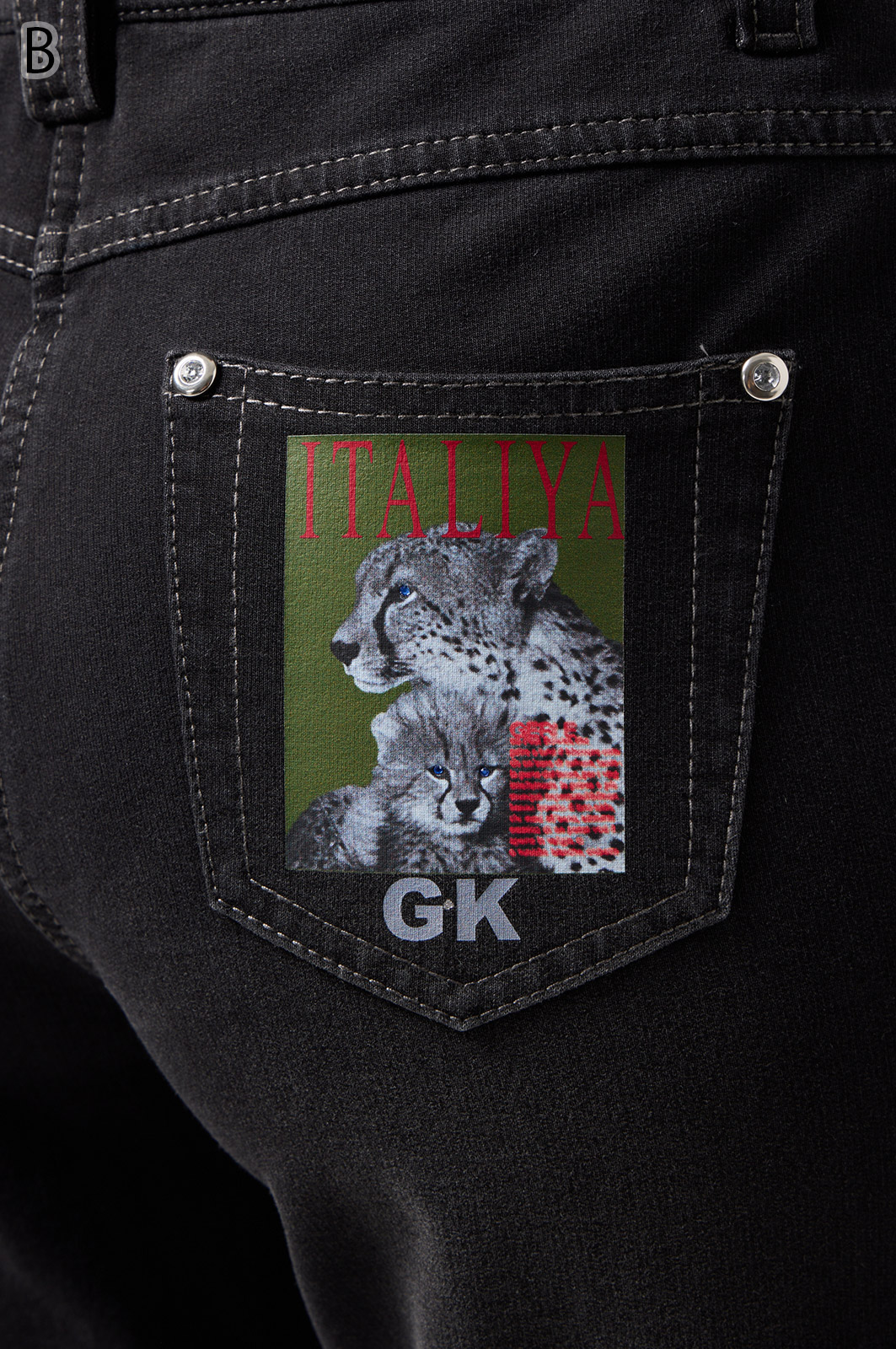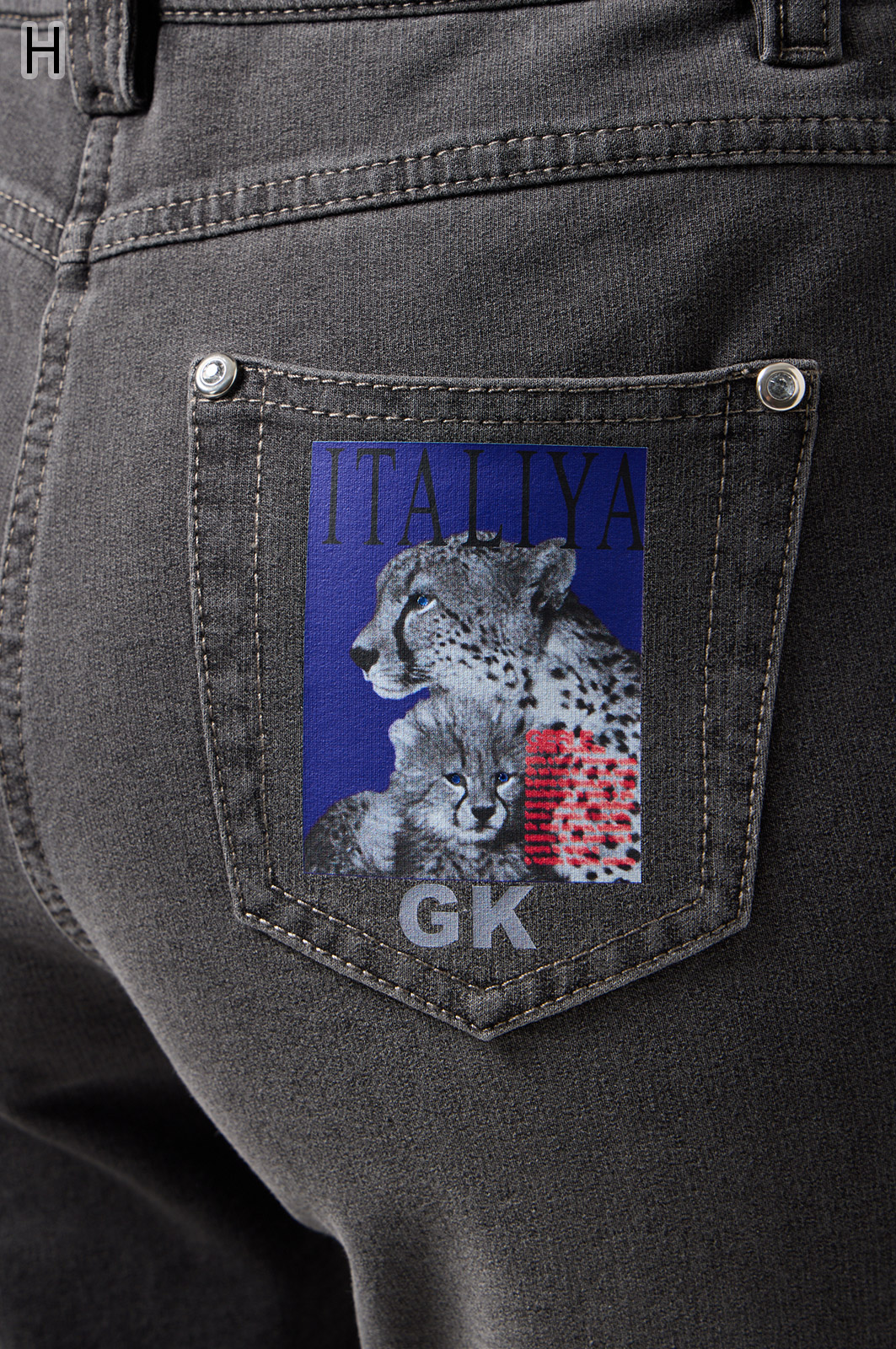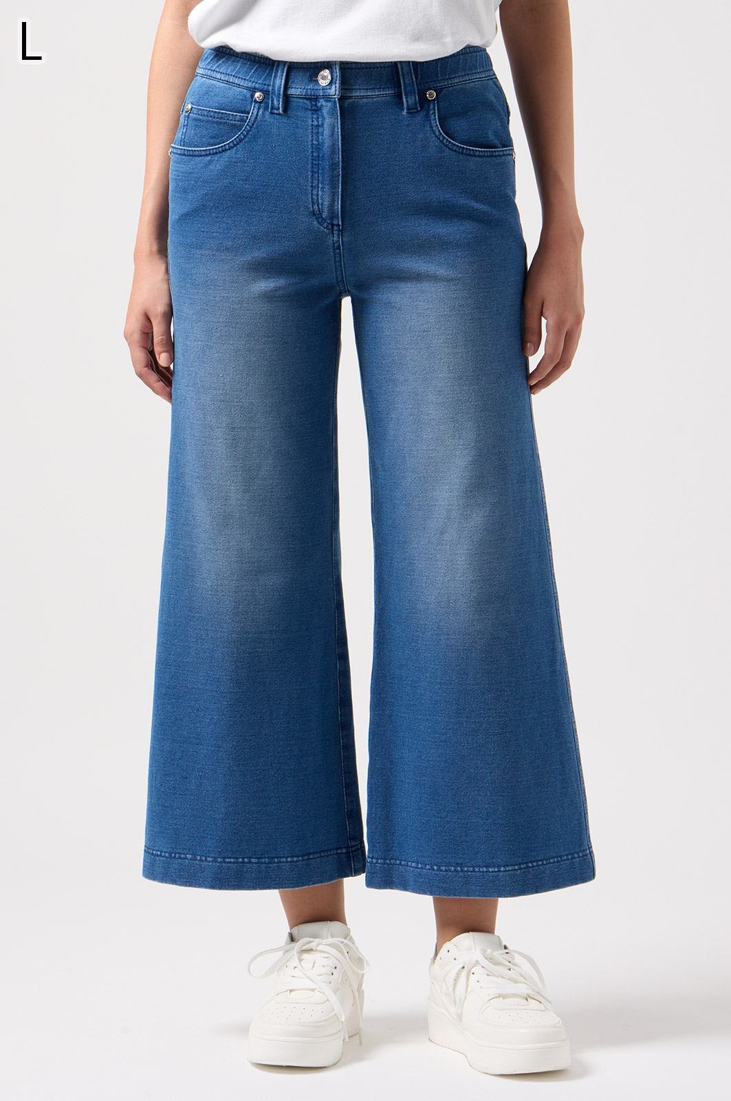 ラクにはけるウエストゴム仕様のバギーパンツ。やわらかい裏パイル素材で肌ざわりも◎。デニム風のインディゴカラーに、オリジナルプリントがさりげないアクセントに♪