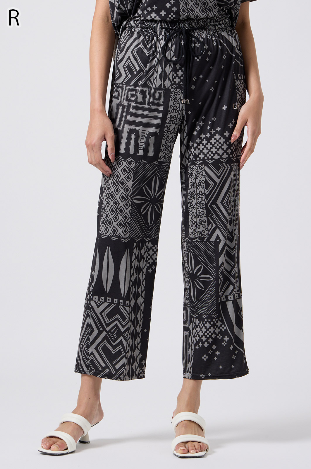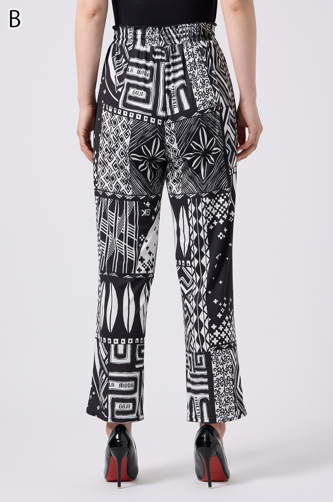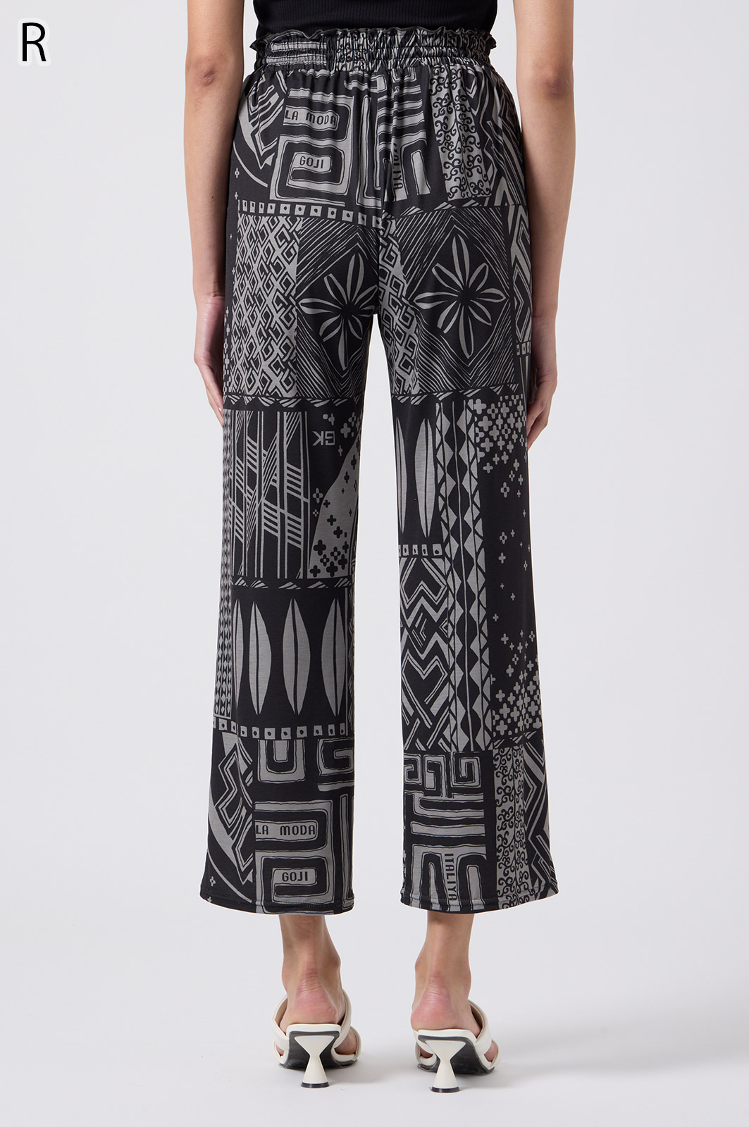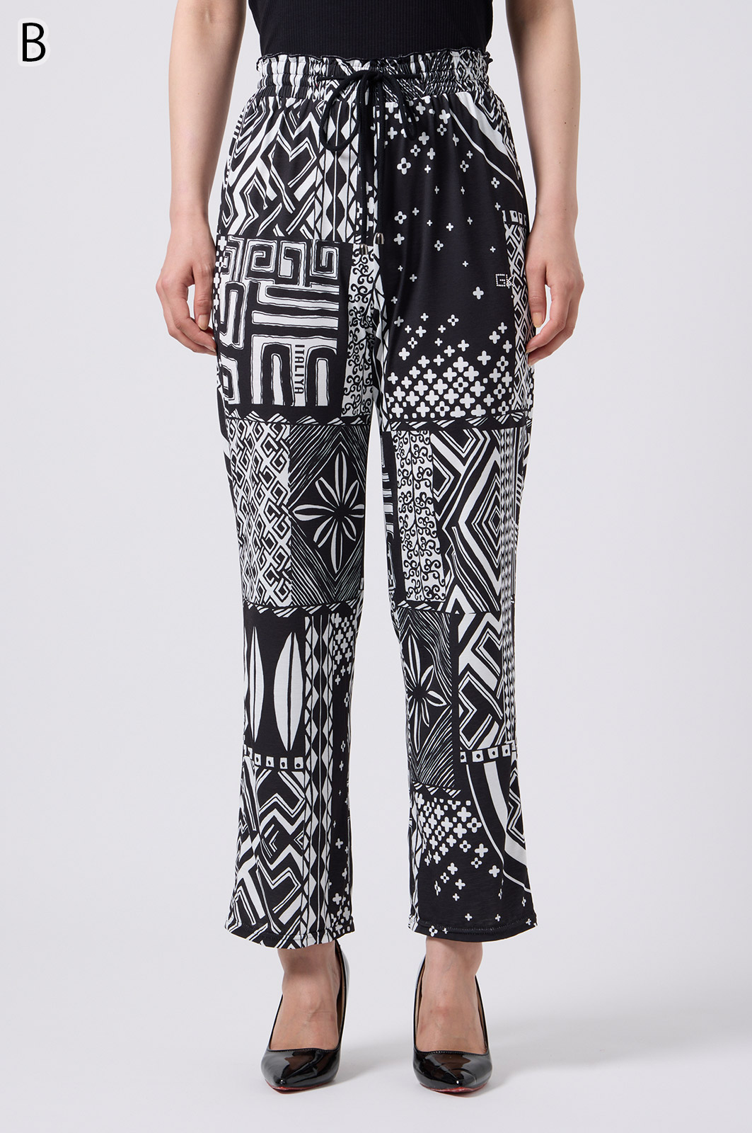 大胆な柄とロゴが目を引く、伊太利屋オリジナルプリントのパンツ。ウエストはギャザー入りのゴム仕様&ひも付きでおしゃれにフィット。すっきり見えるストレートラインで、ラクさと美しさを両立♪