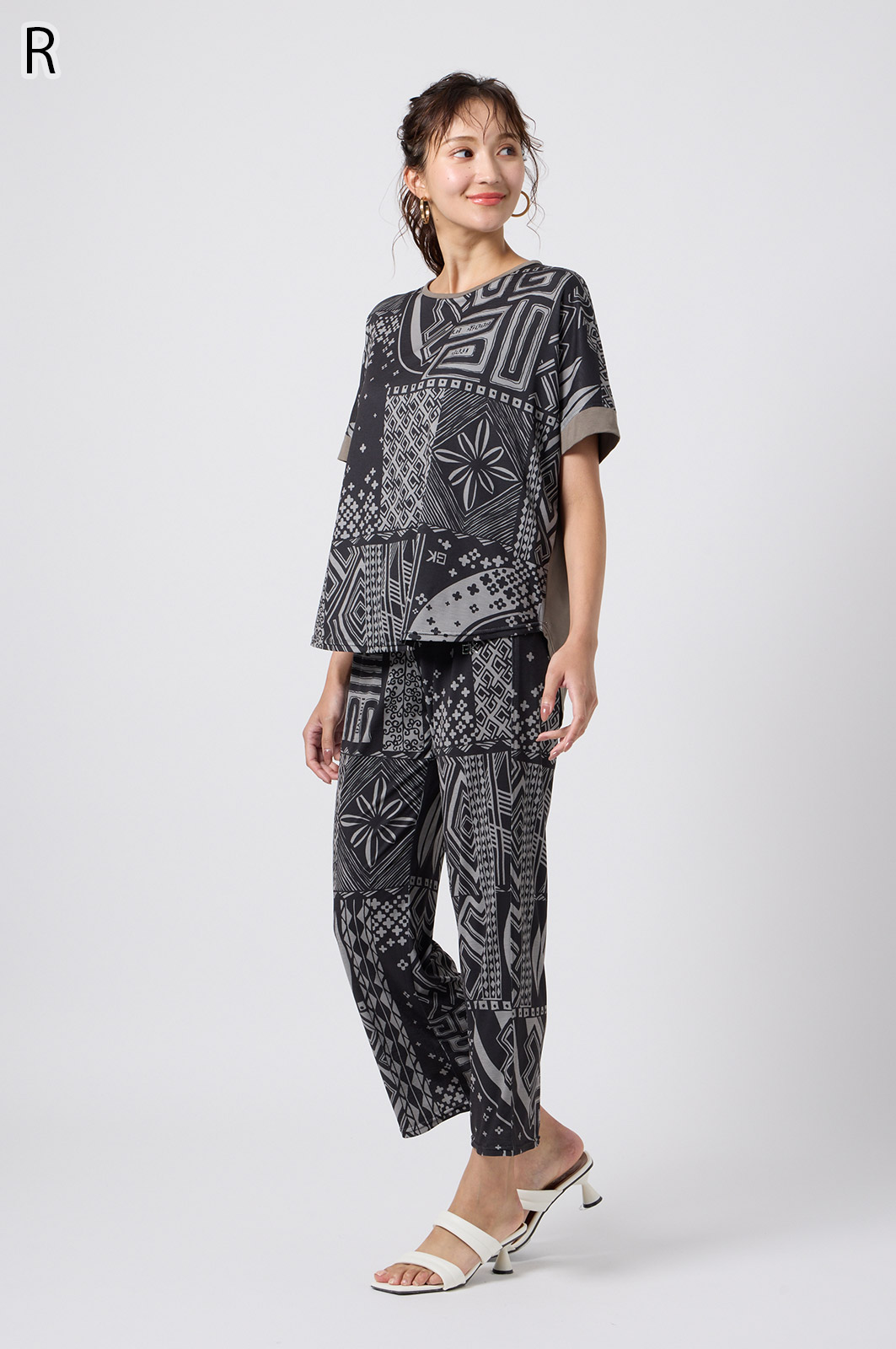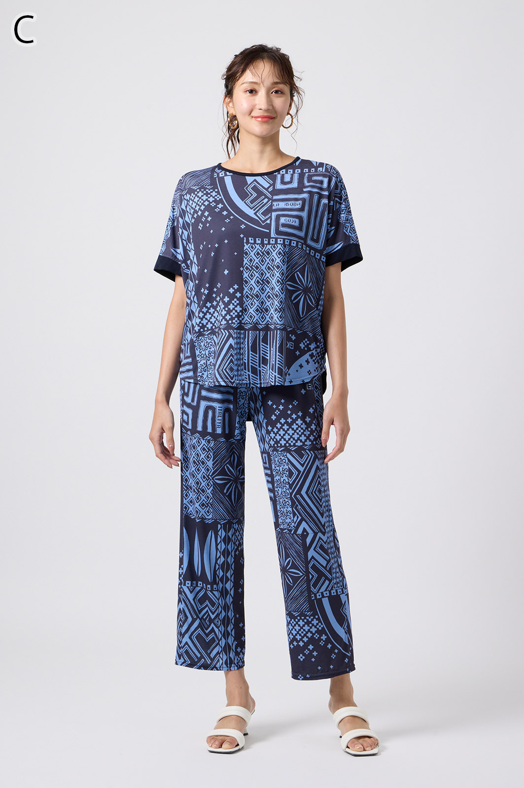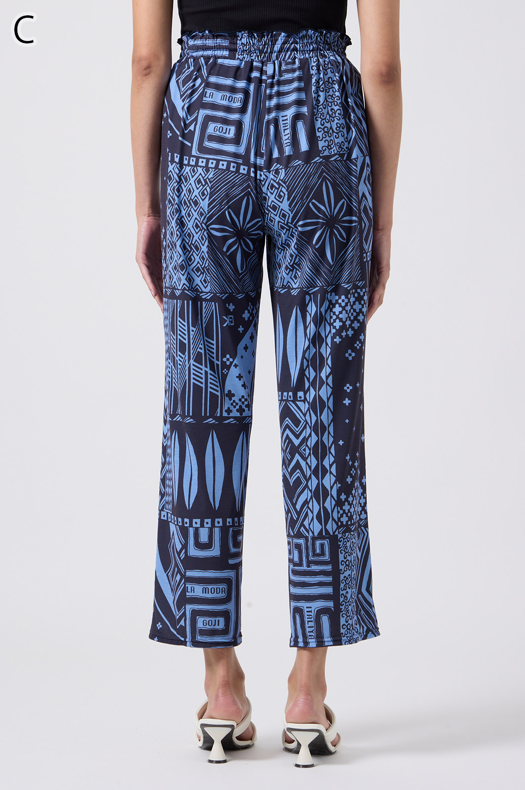 大胆な柄とロゴが目を引く、伊太利屋オリジナルプリントのパンツ。ウエストはギャザー入りのゴム仕様&ひも付きでおしゃれにフィット。すっきり見えるストレートラインで、ラクさと美しさを両立♪
