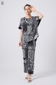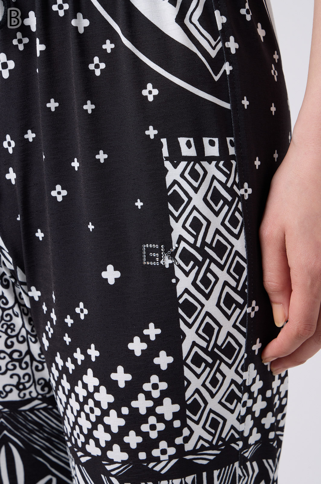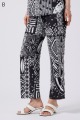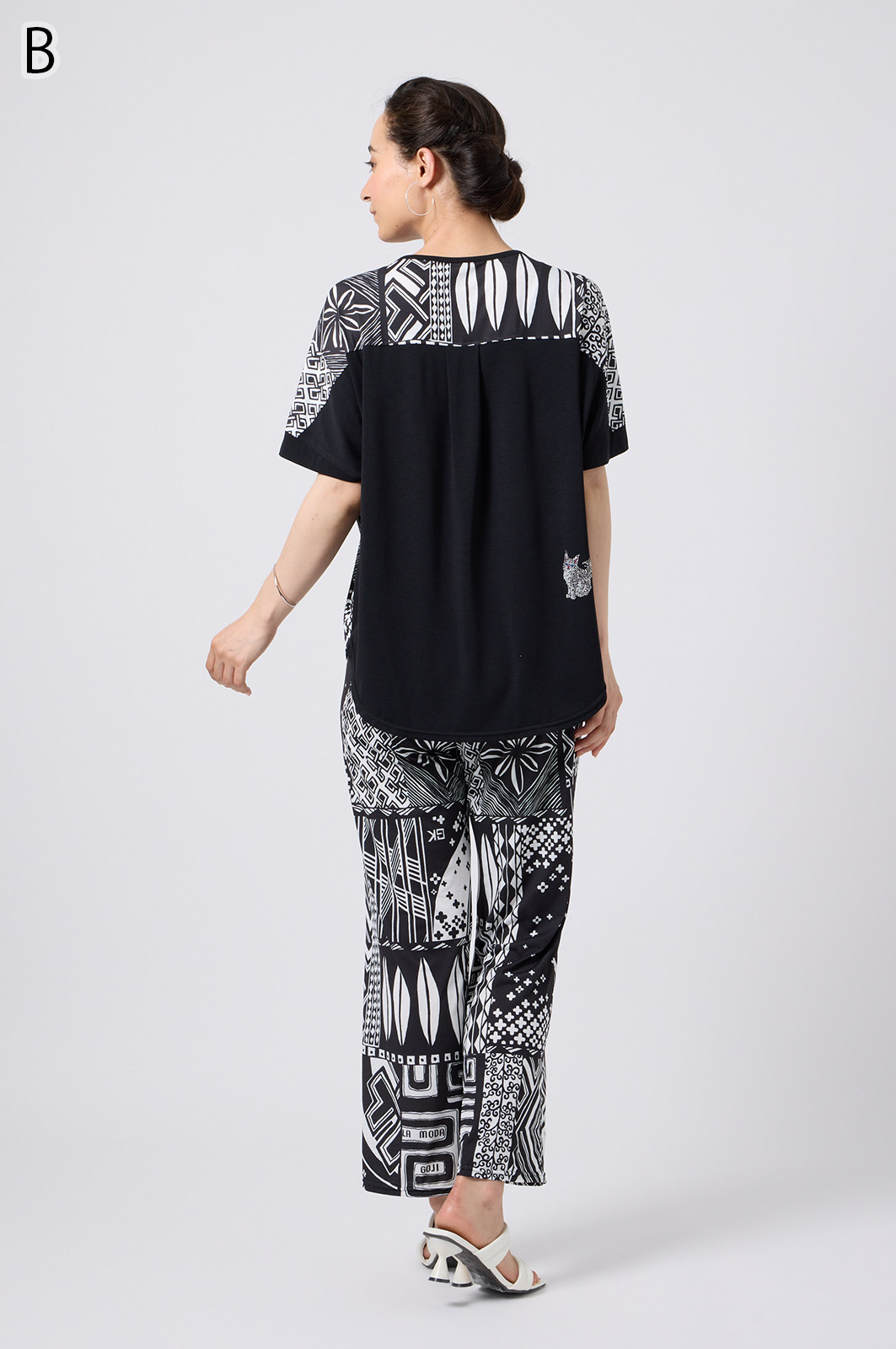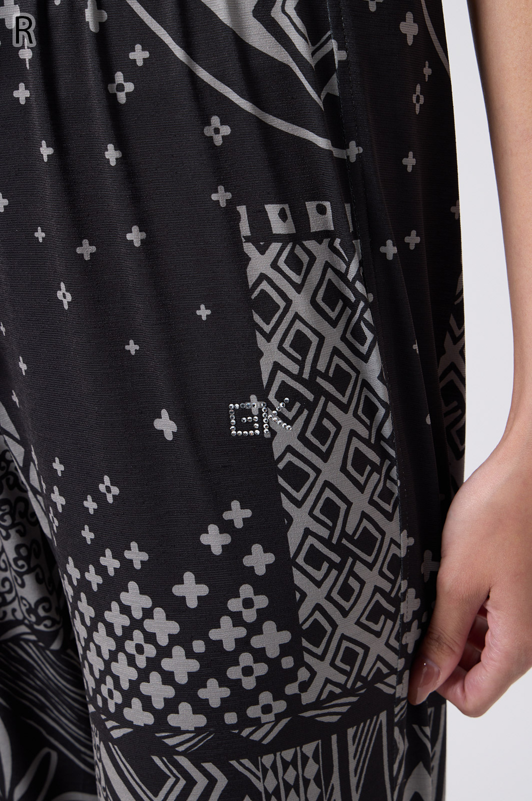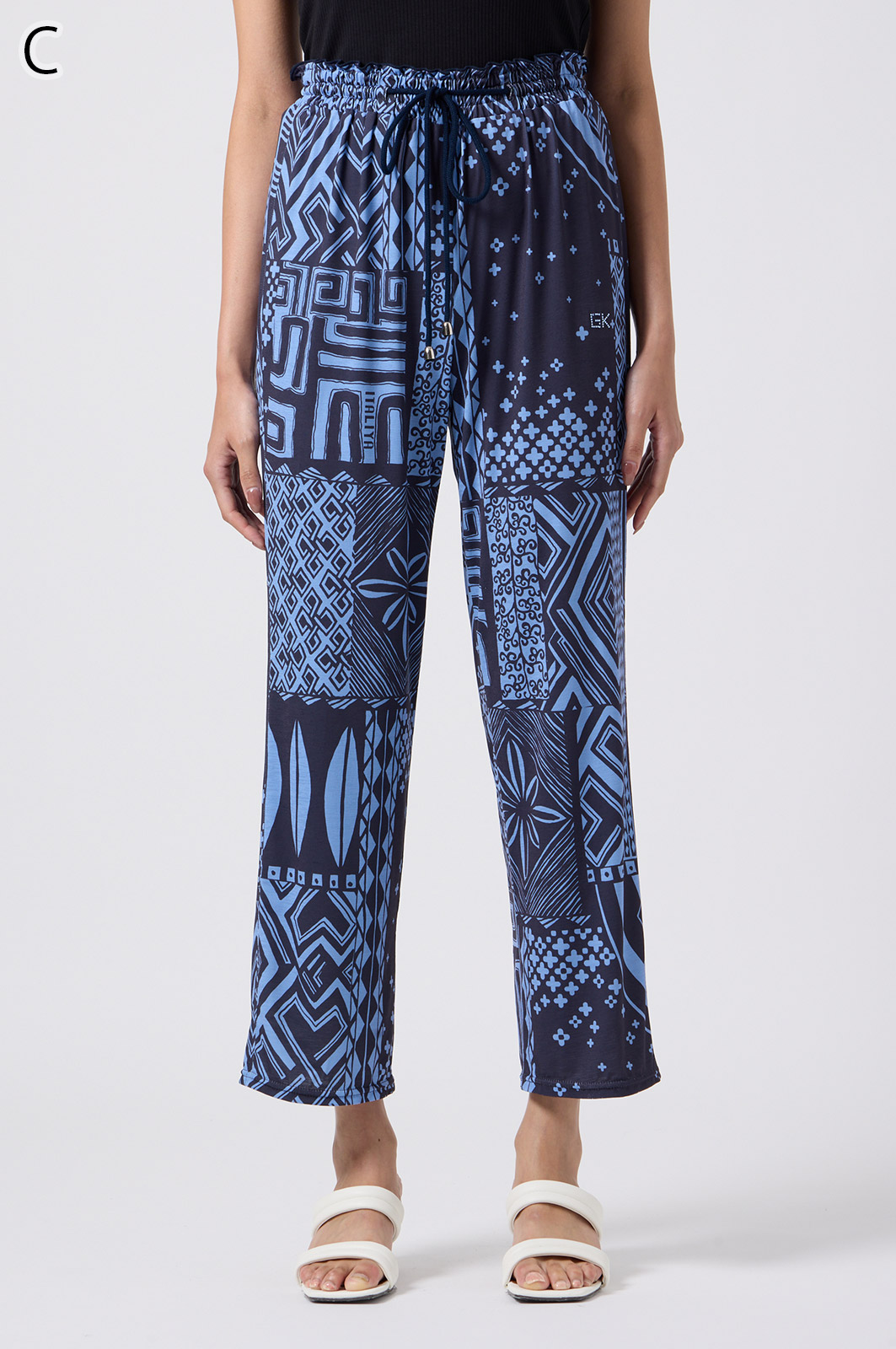 大胆な柄とロゴが目を引く、伊太利屋オリジナルプリントのパンツ。ウエストはギャザー入りのゴム仕様&ひも付きでおしゃれにフィット。すっきり見えるストレートラインで、ラクさと美しさを両立♪
