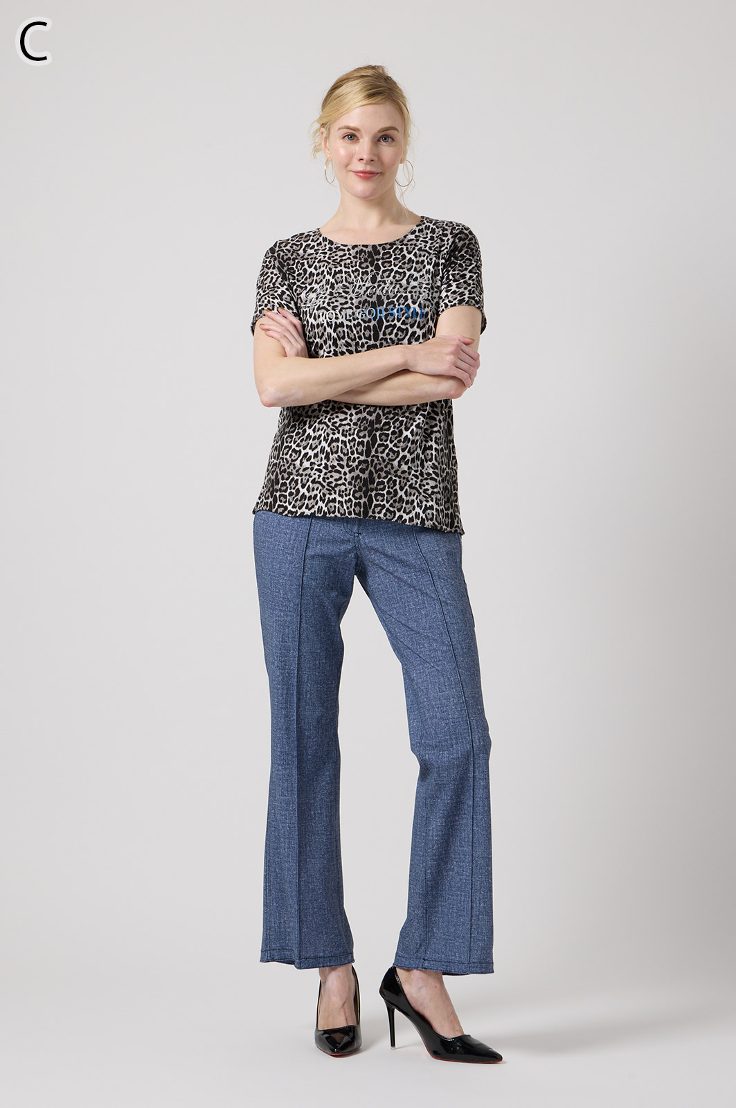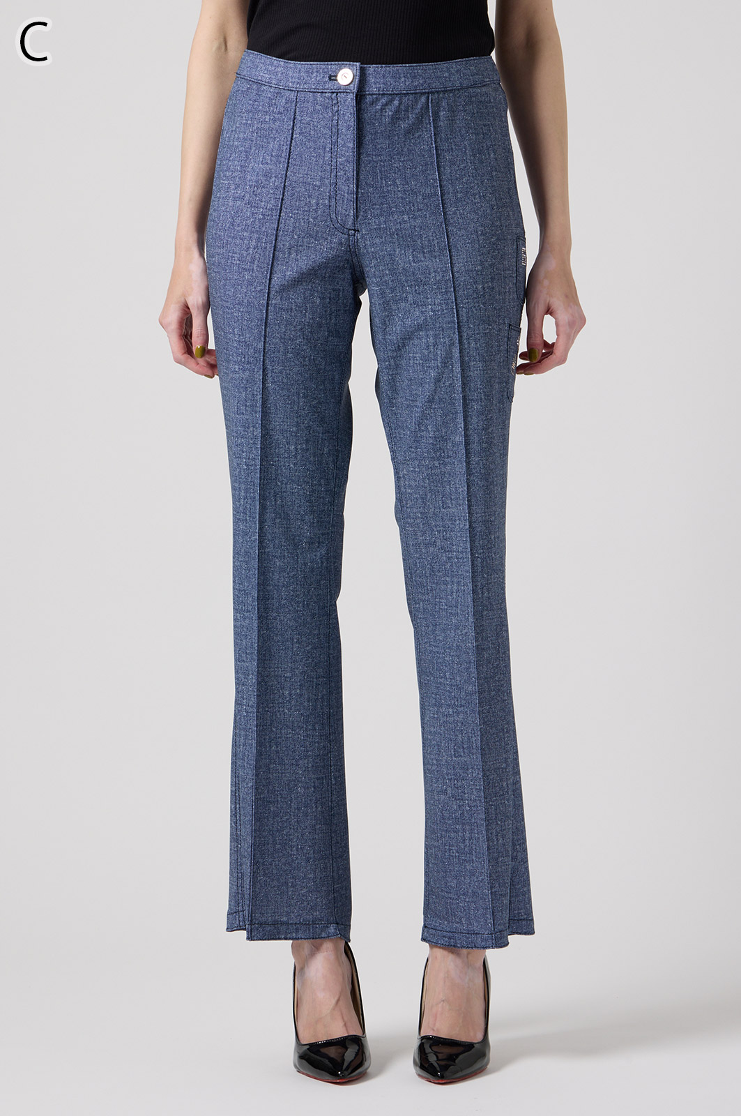 暑い日もさらっと快適!よく伸びるストレッチ素材に、デニム風プリントを合わせた軽やかパンツ。ウエストはゴム仕様でラクちん、前後のピンタックで脚長効果も◎。両脇ポケット付きで実用性もバッチリ♪
