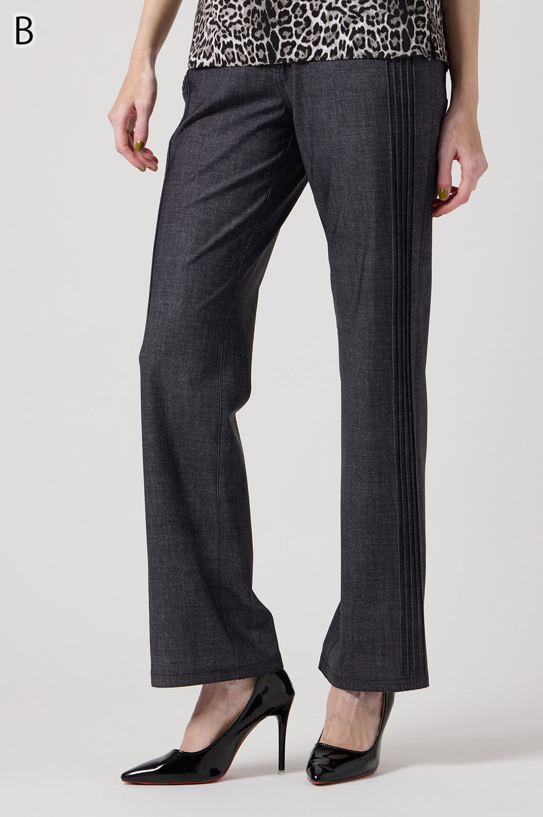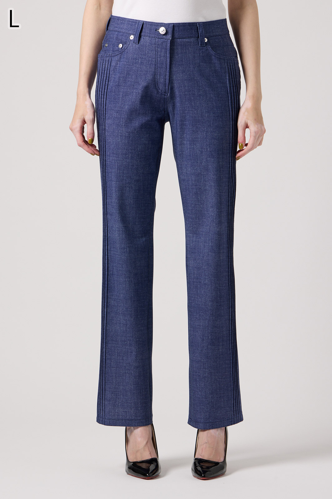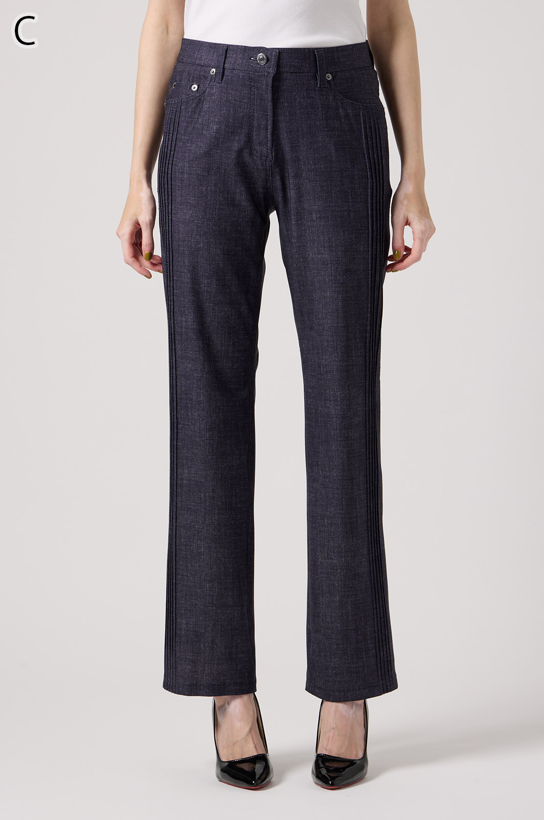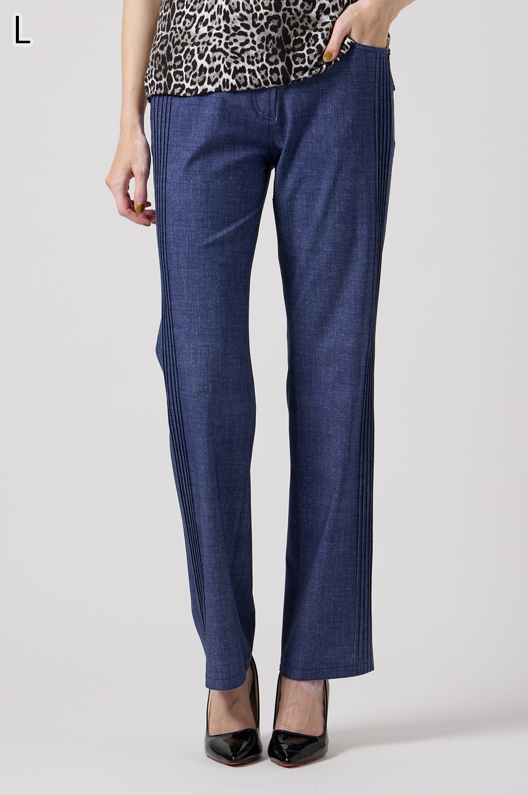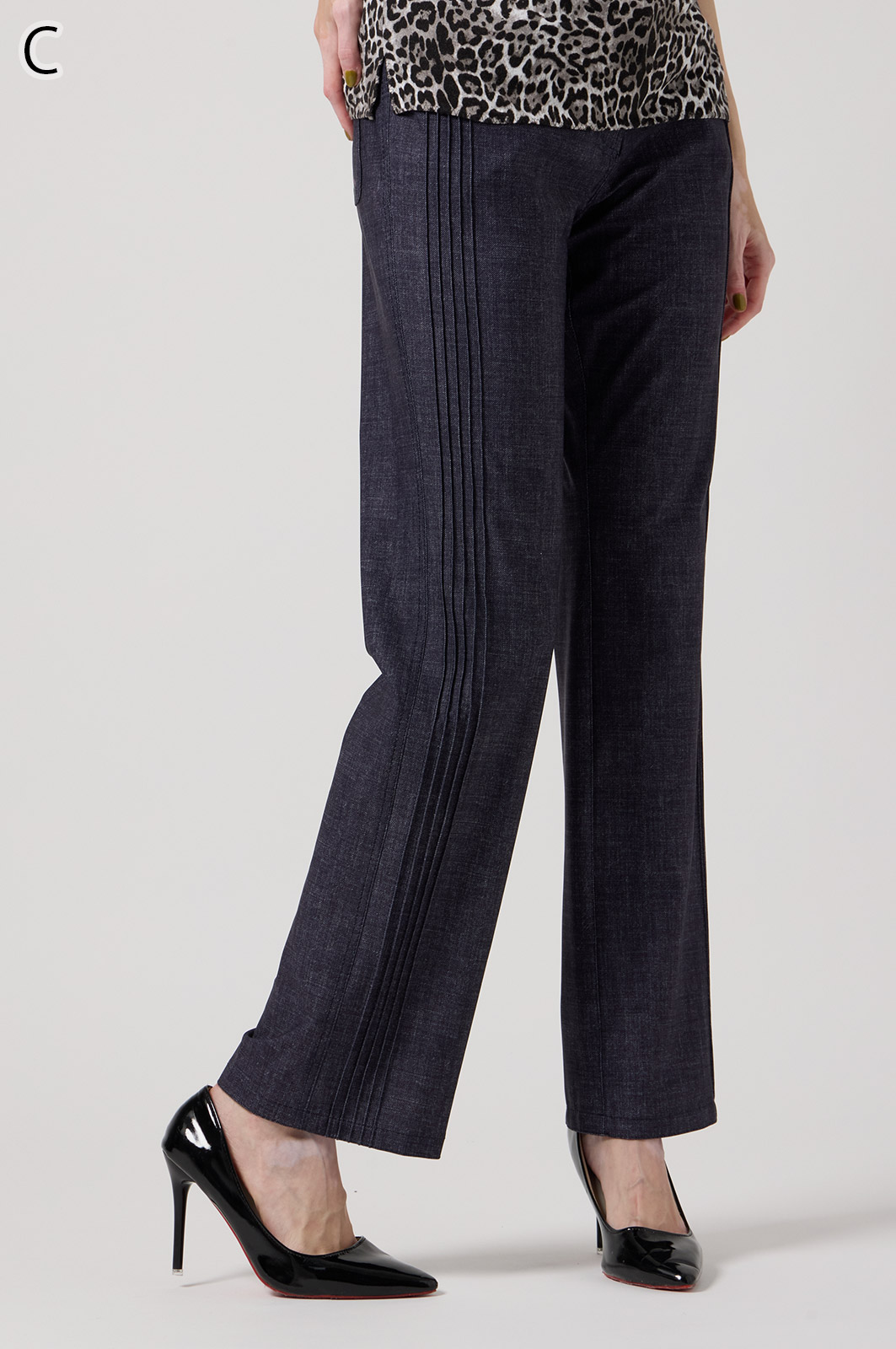 デニム風のプリントがおしゃれな、らくらく伸びる素材のパンツ。ウエストはゴム仕様で快適、サイドには5本の細かいタック入りでスッキリ見えも叶います。こだわりのオリジナルプリント加工で、さりげなく差がつく一本♪