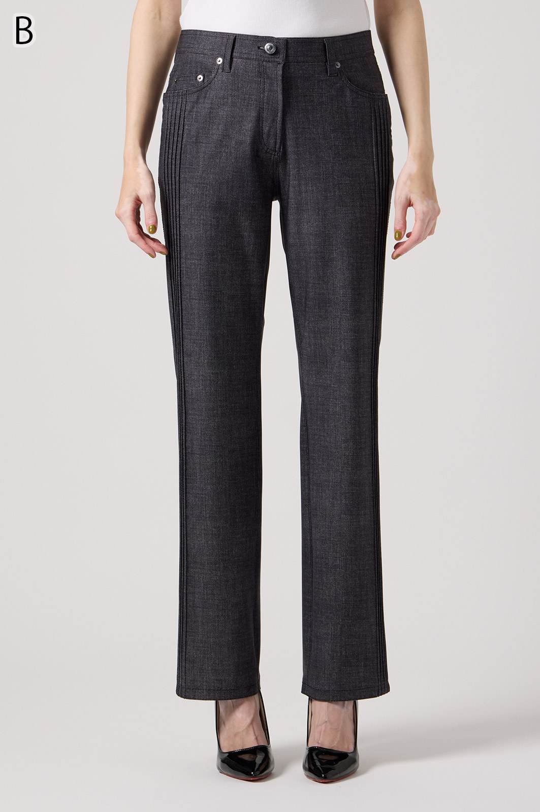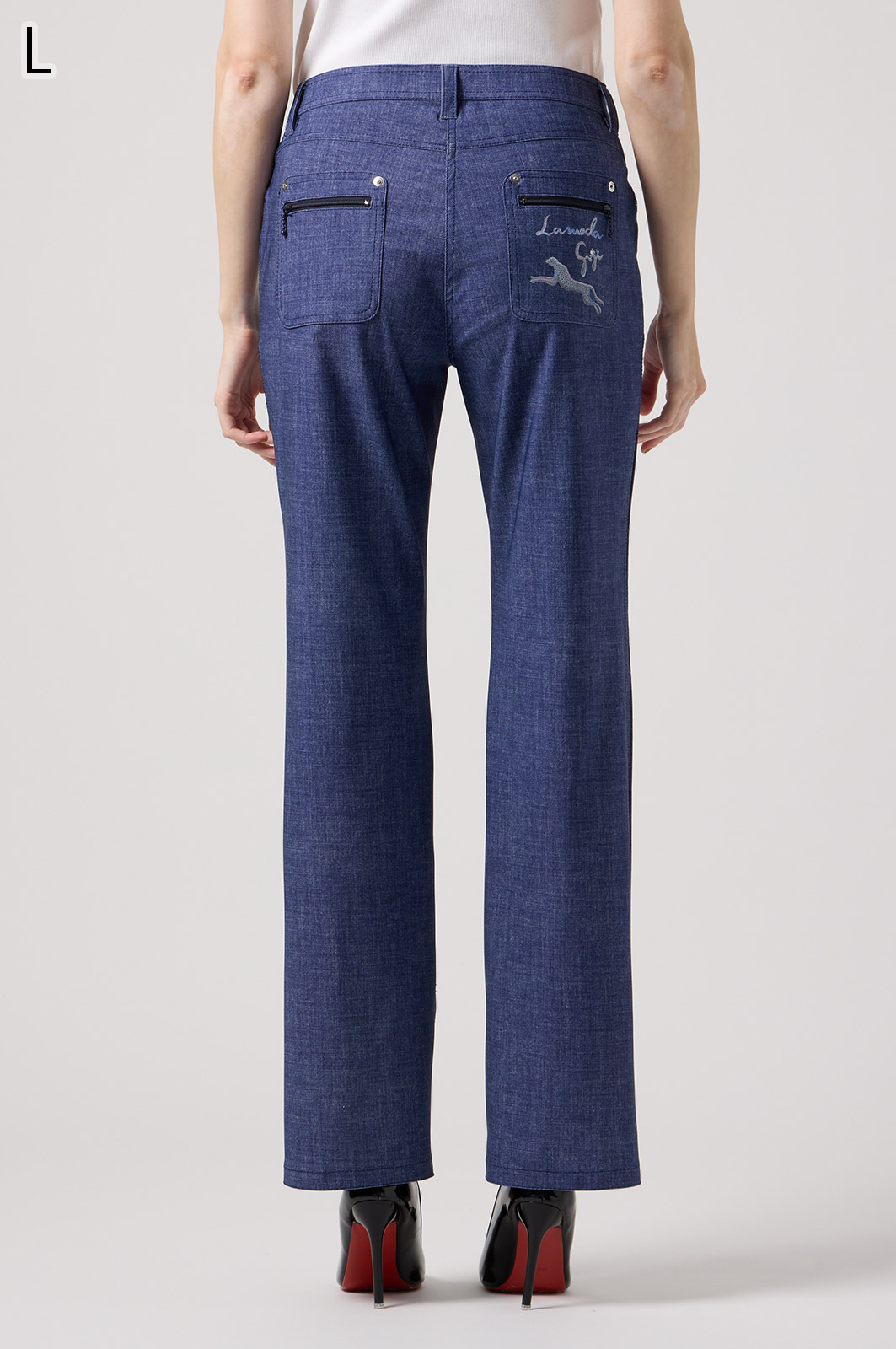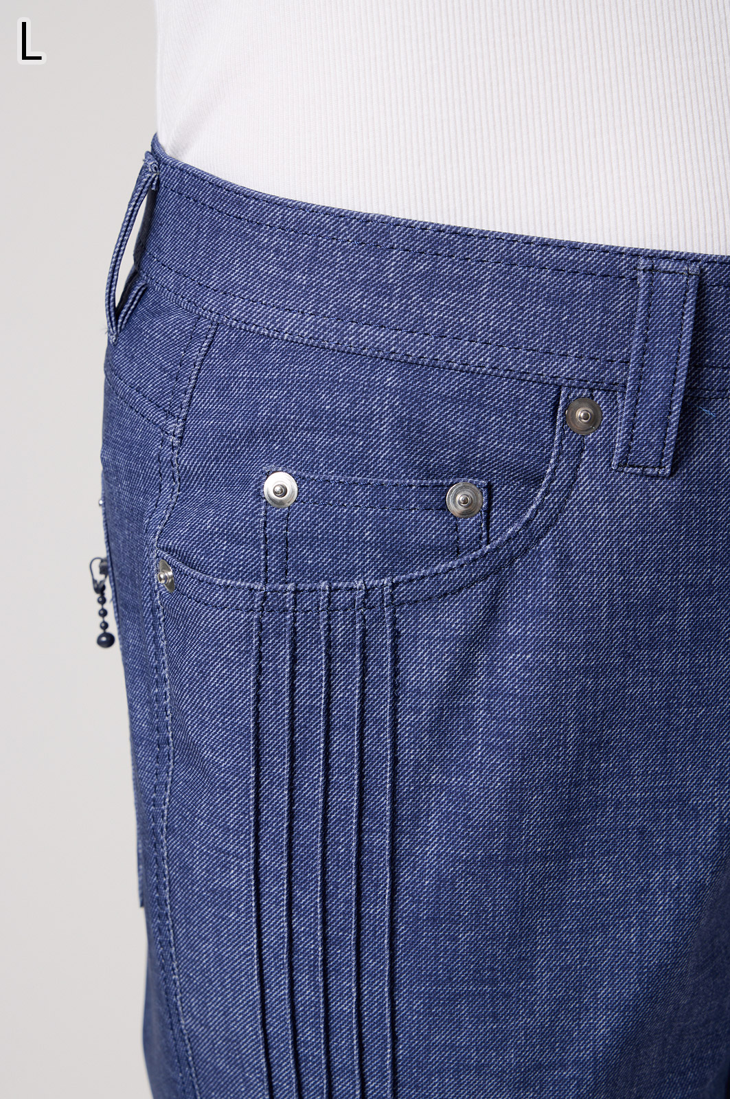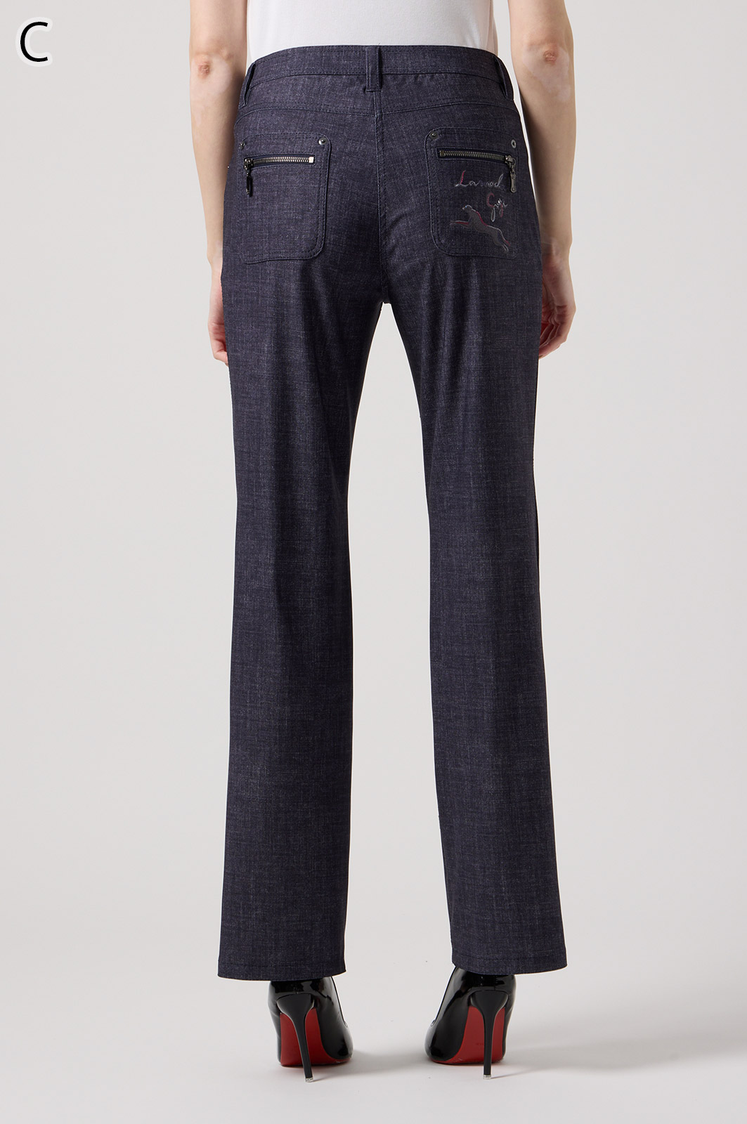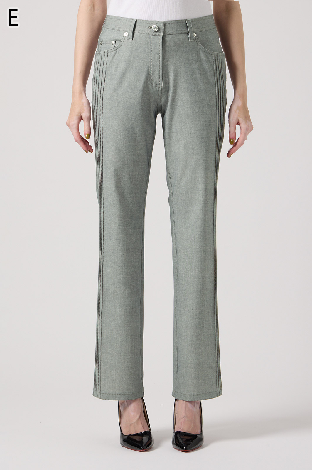デニム風のプリントがおしゃれな、らくらく伸びる素材のパンツ。ウエストはゴム仕様で快適、サイドには5本の細かいタック入りでスッキリ見えも叶います。こだわりのオリジナルプリント加工で、さりげなく差がつく一本♪