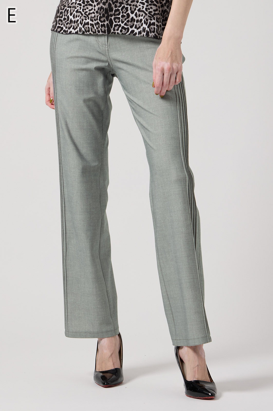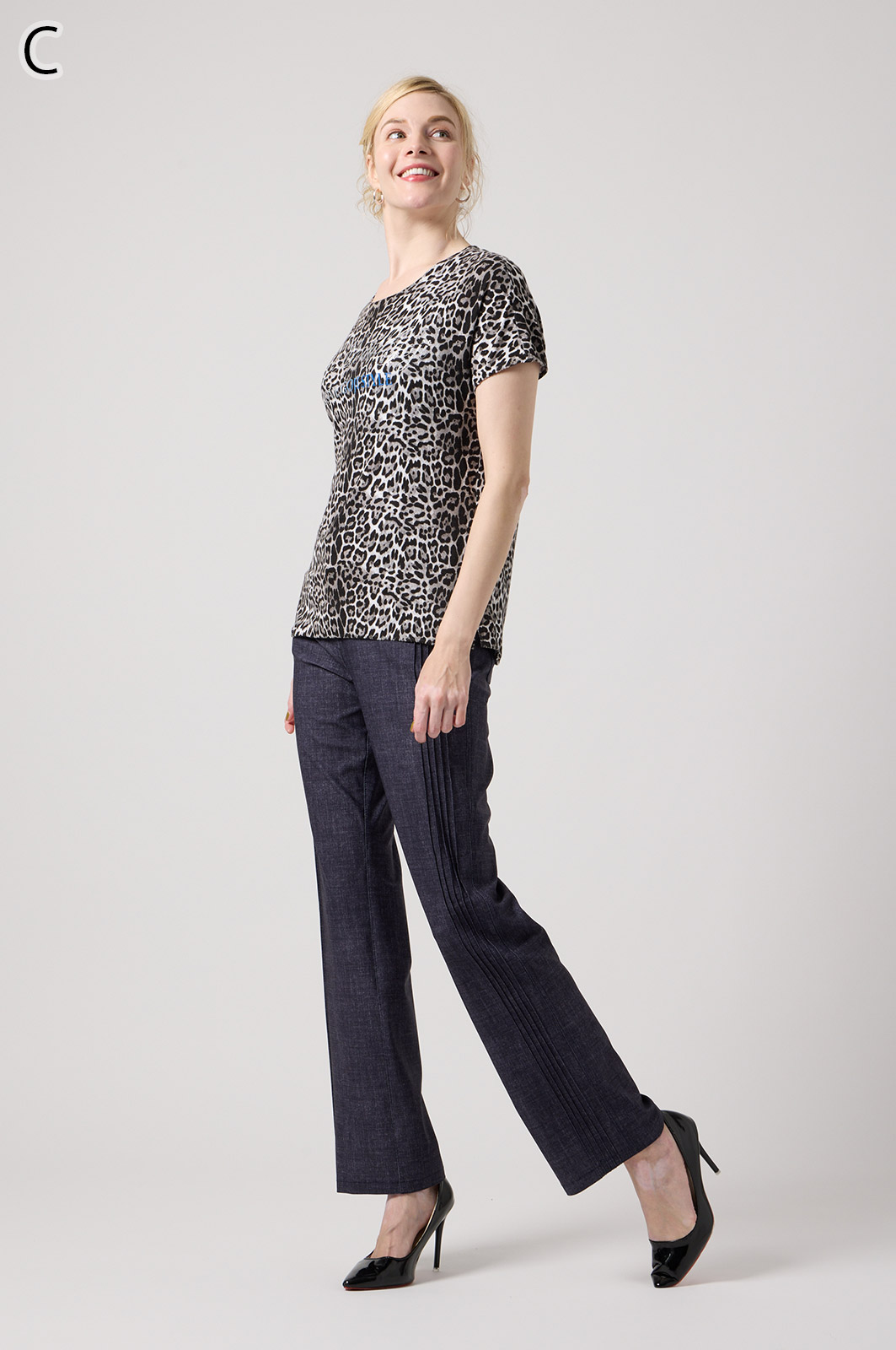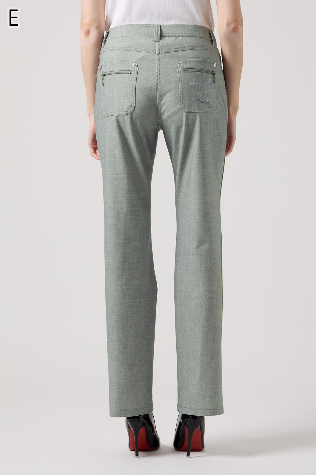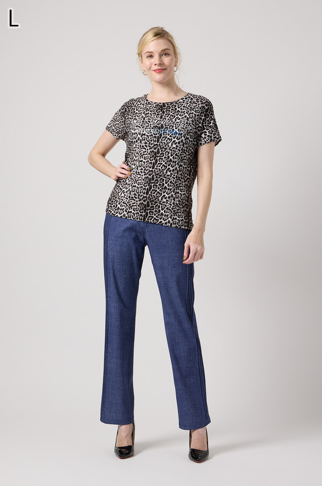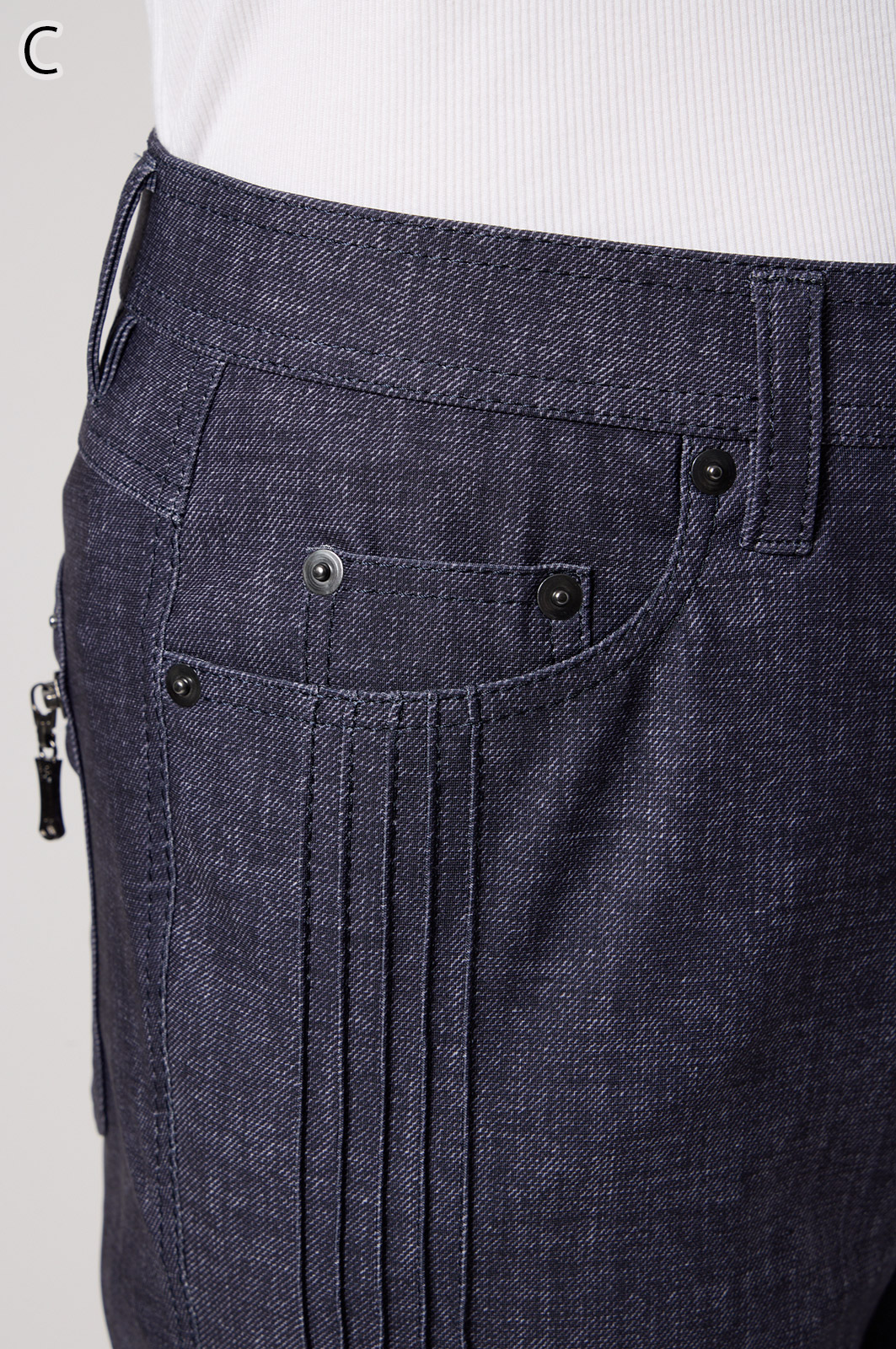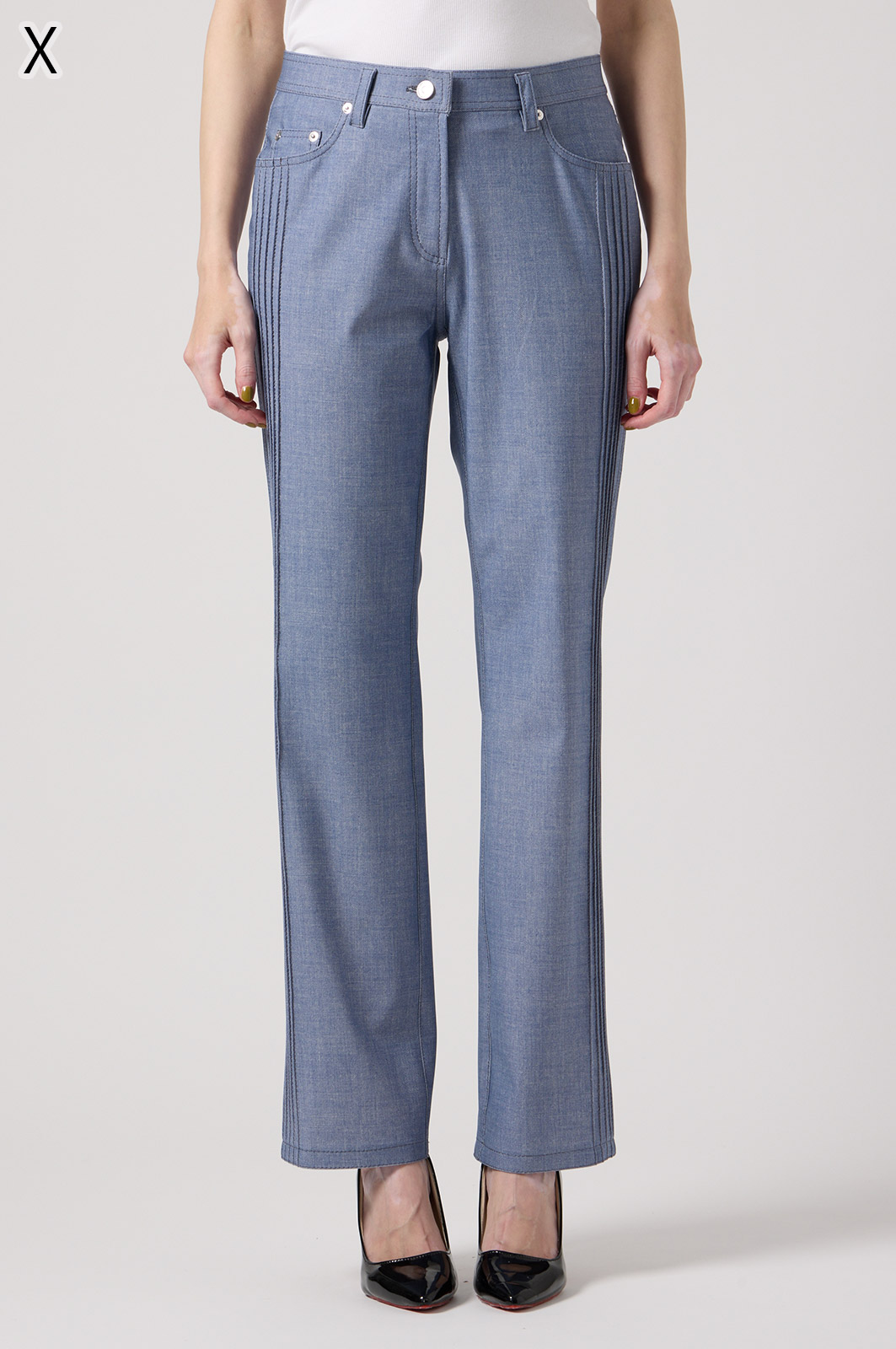 デニム風のプリントがおしゃれな、らくらく伸びる素材のパンツ。ウエストはゴム仕様で快適、サイドには5本の細かいタック入りでスッキリ見えも叶います。こだわりのオリジナルプリント加工で、さりげなく差がつく一本♪