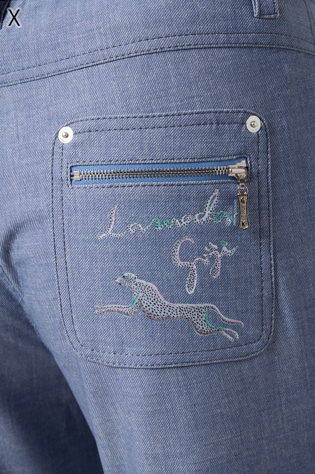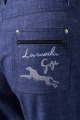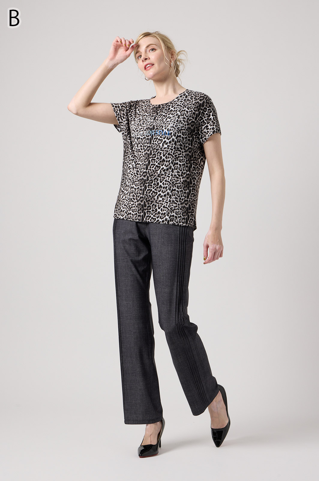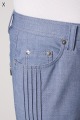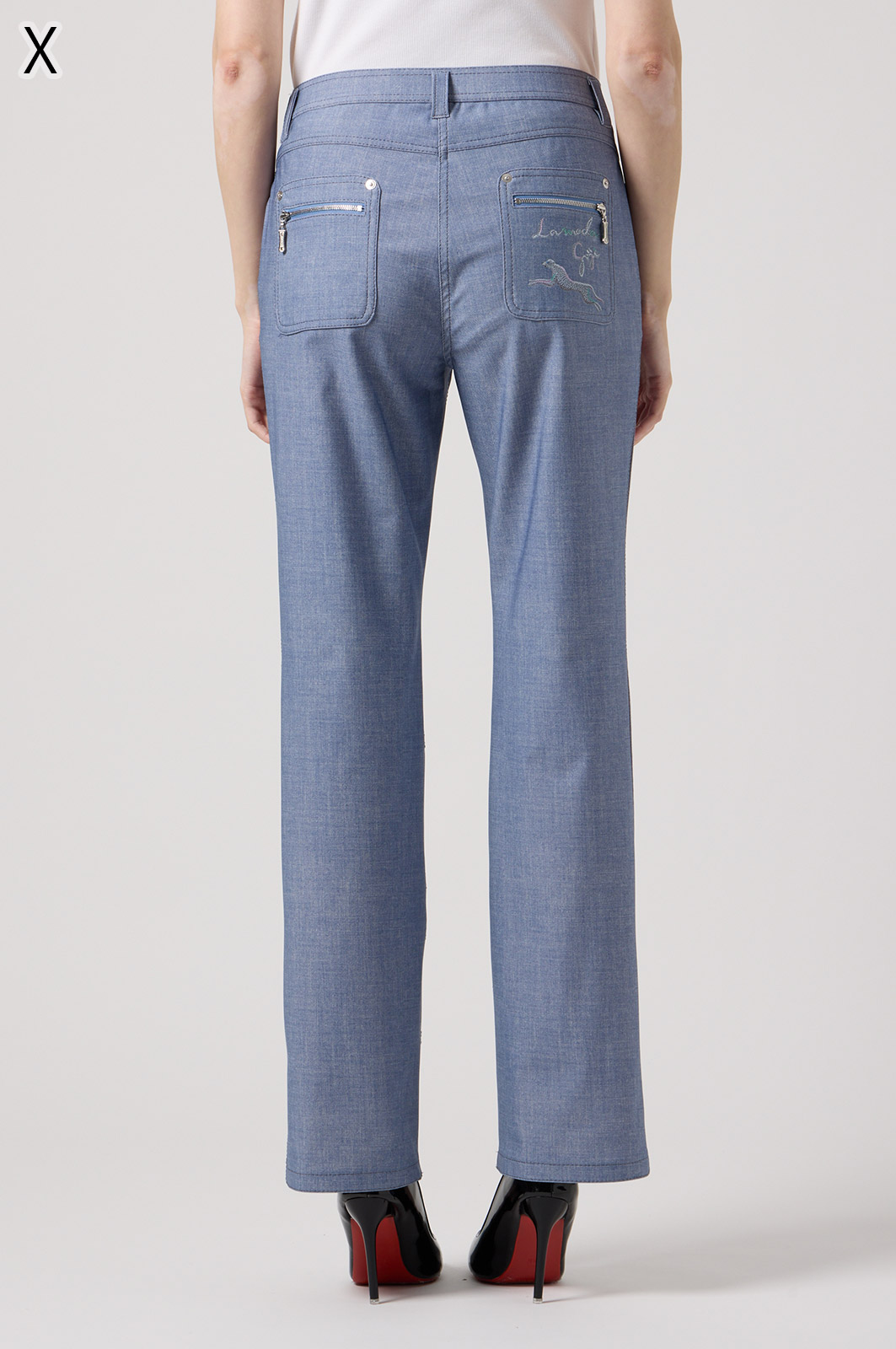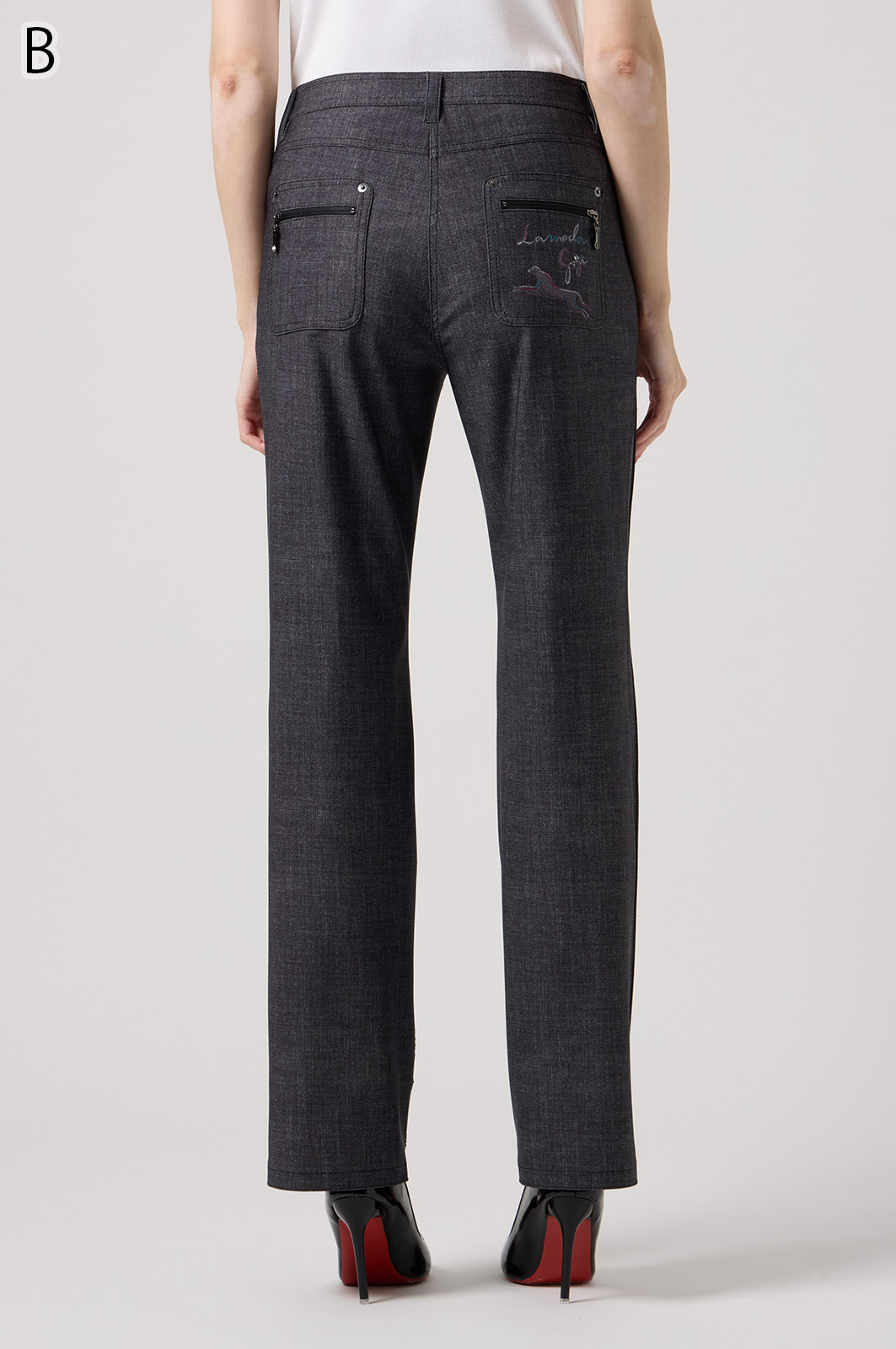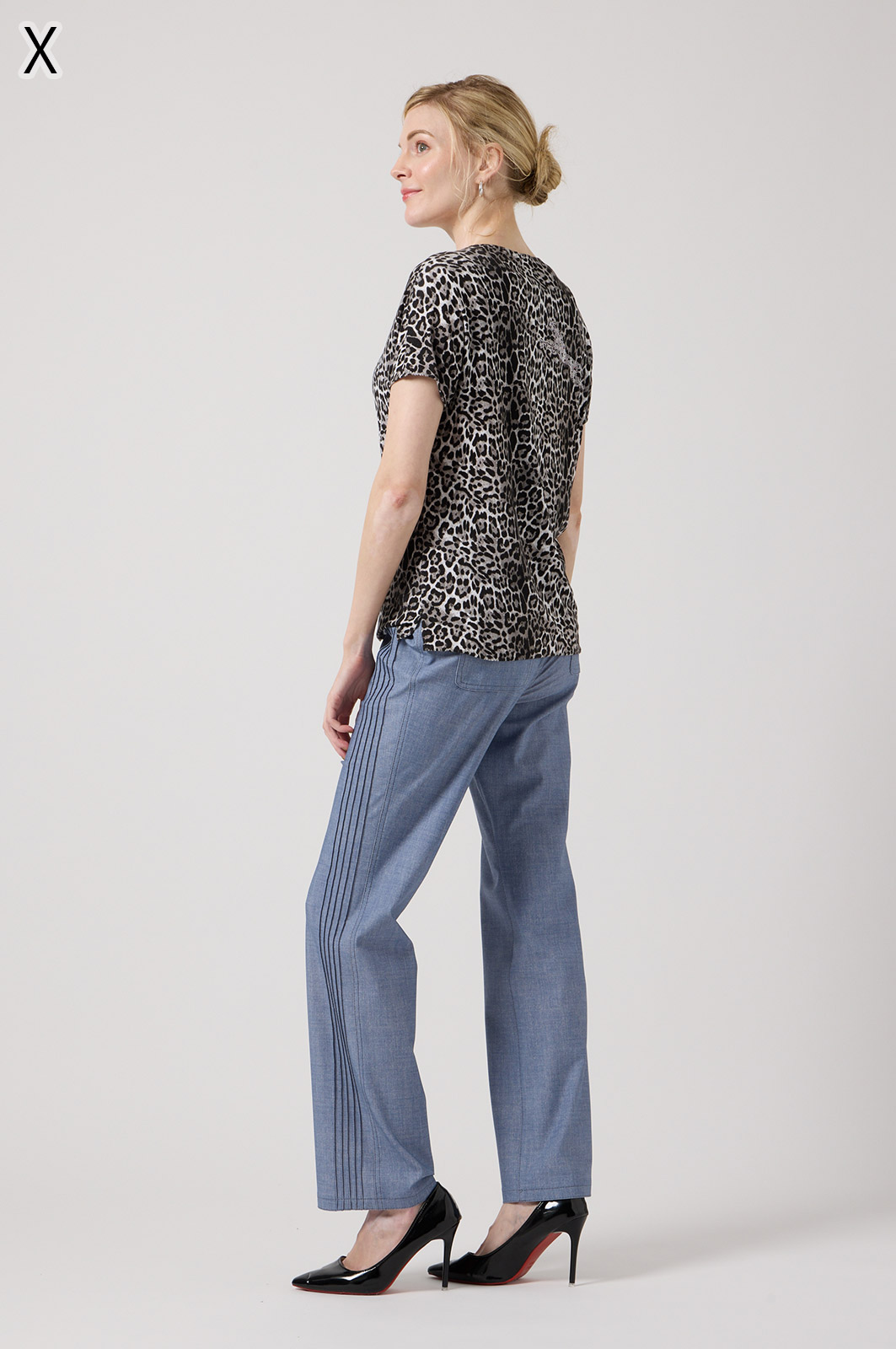 デニム風のプリントがおしゃれな、らくらく伸びる素材のパンツ。ウエストはゴム仕様で快適、サイドには5本の細かいタック入りでスッキリ見えも叶います。こだわりのオリジナルプリント加工で、さりげなく差がつく一本♪