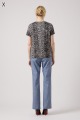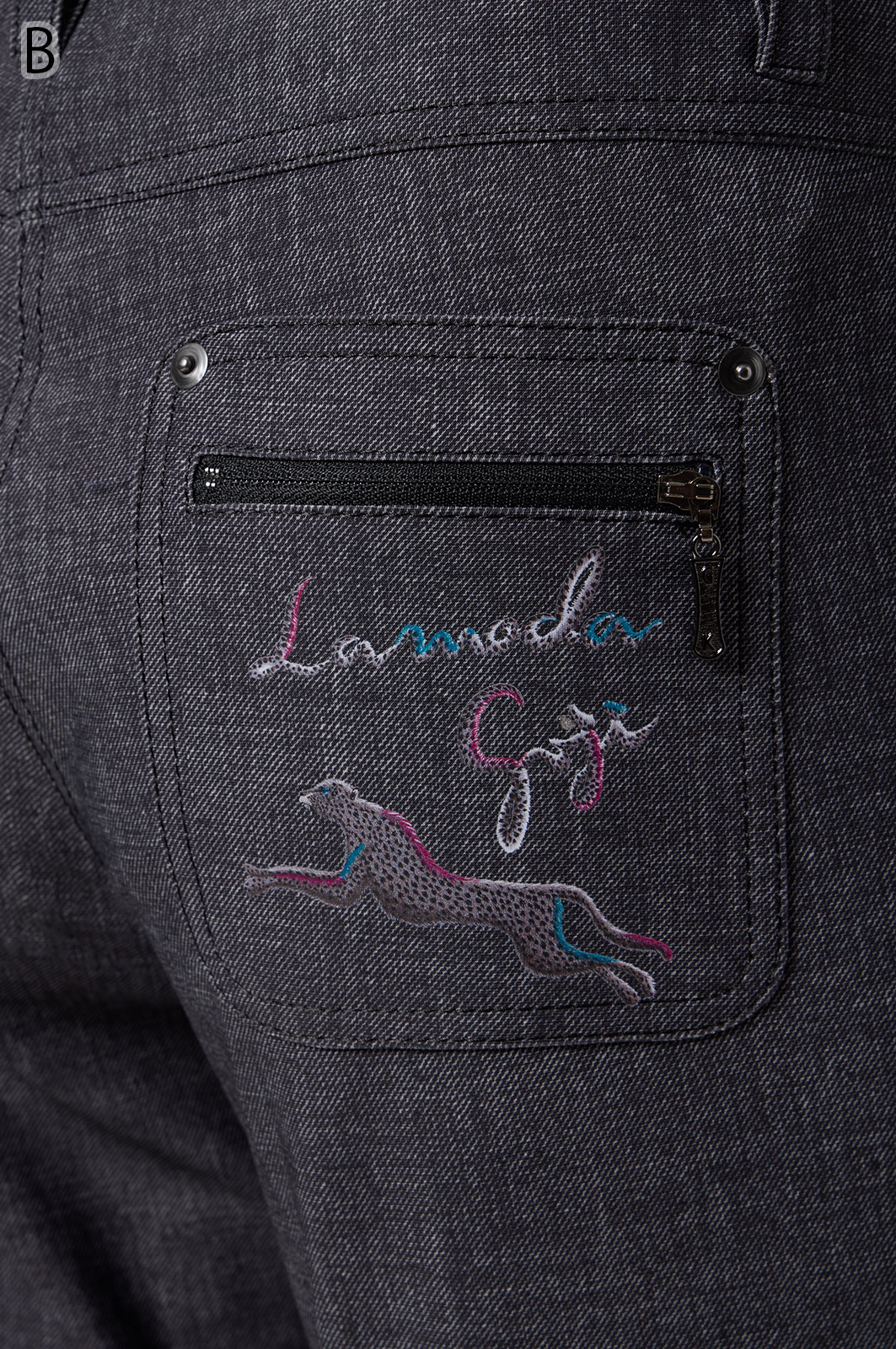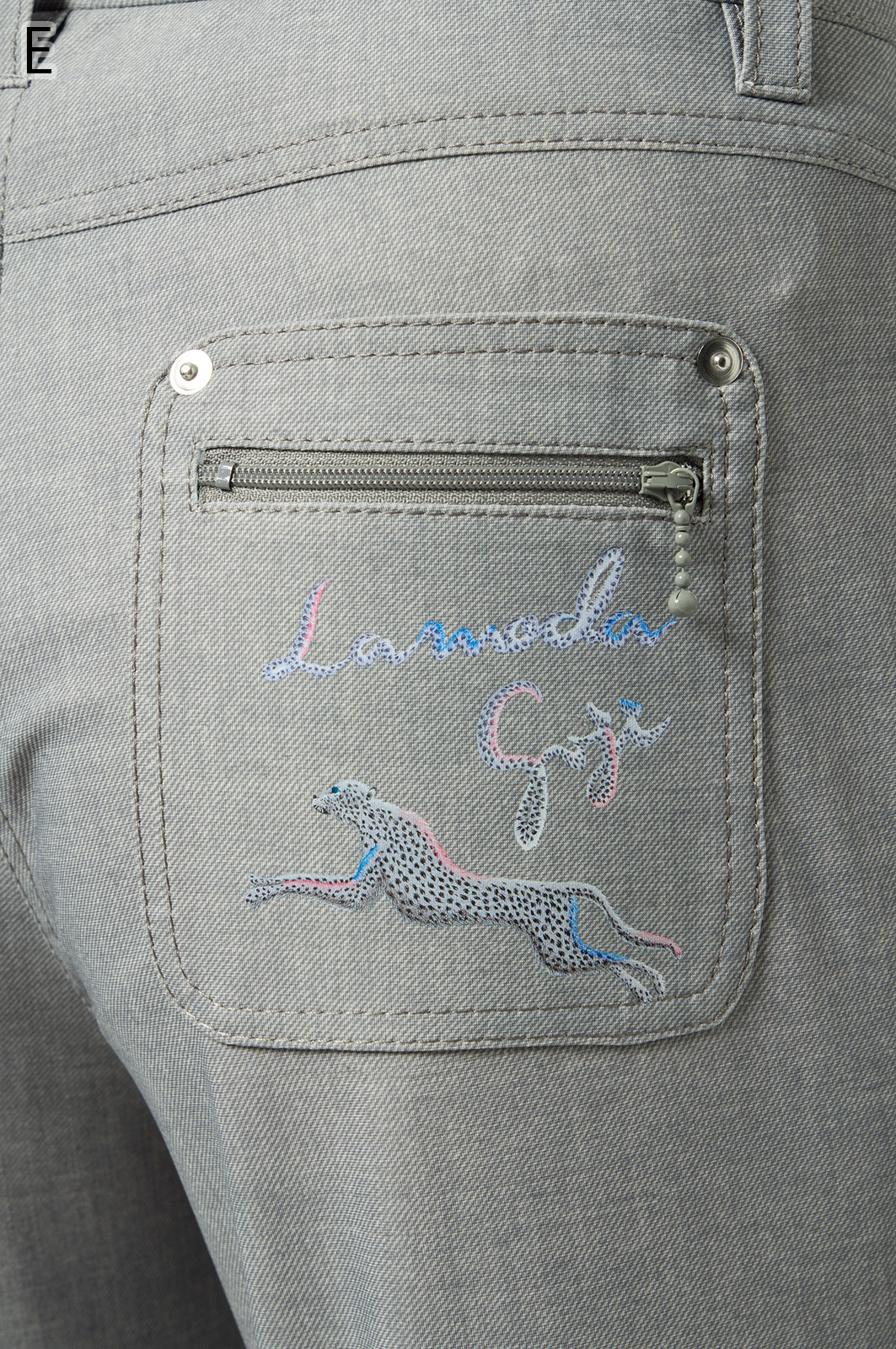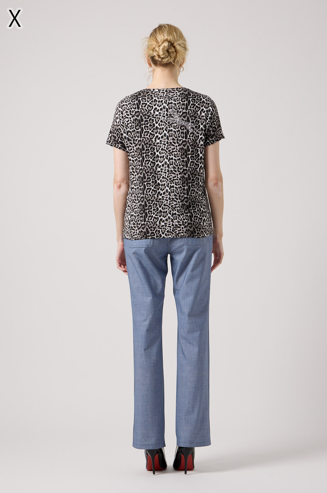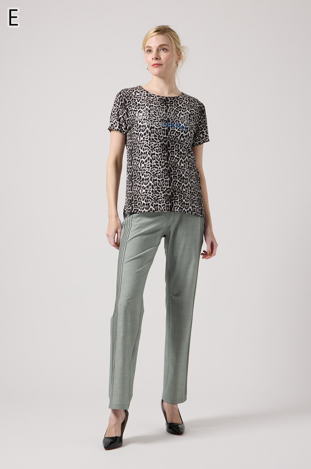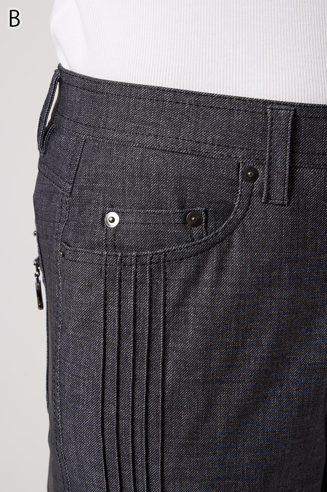 デニム風のプリントがおしゃれな、らくらく伸びる素材のパンツ。ウエストはゴム仕様で快適、サイドには5本の細かいタック入りでスッキリ見えも叶います。こだわりのオリジナルプリント加工で、さりげなく差がつく一本♪