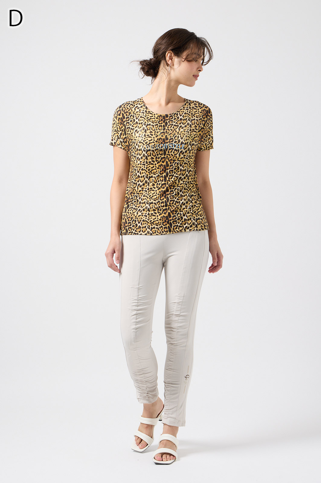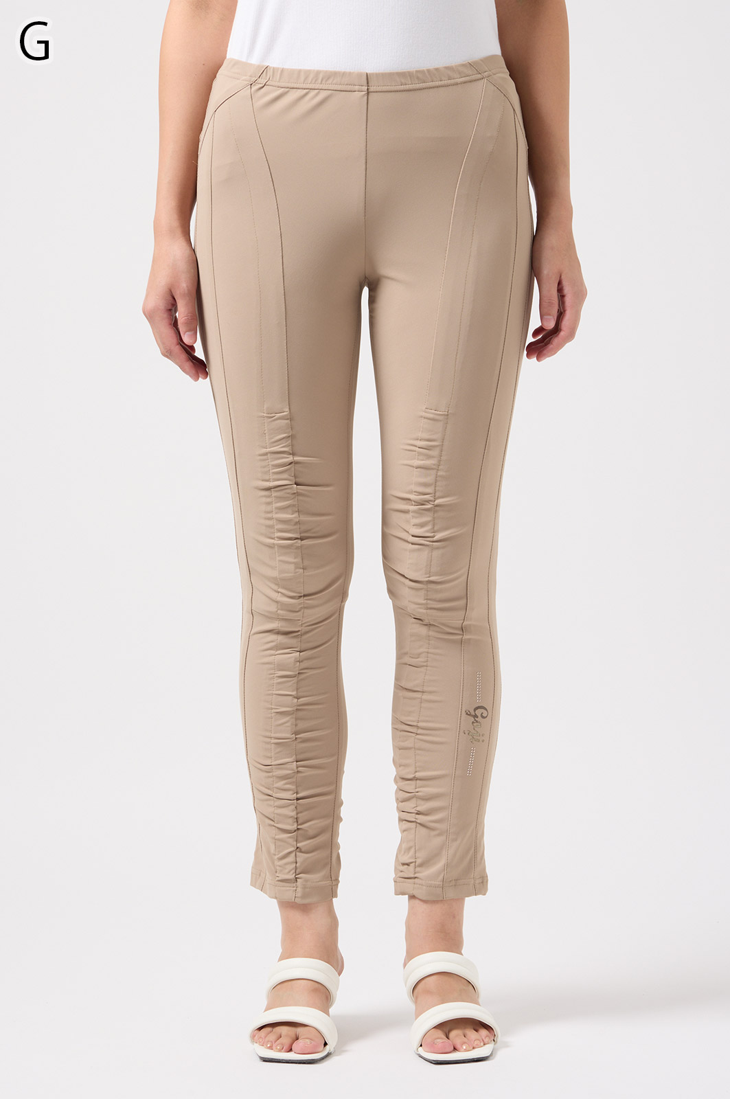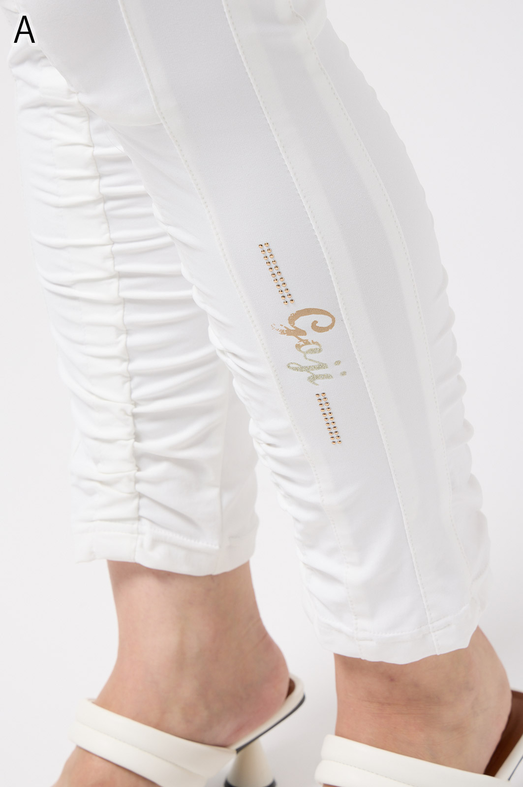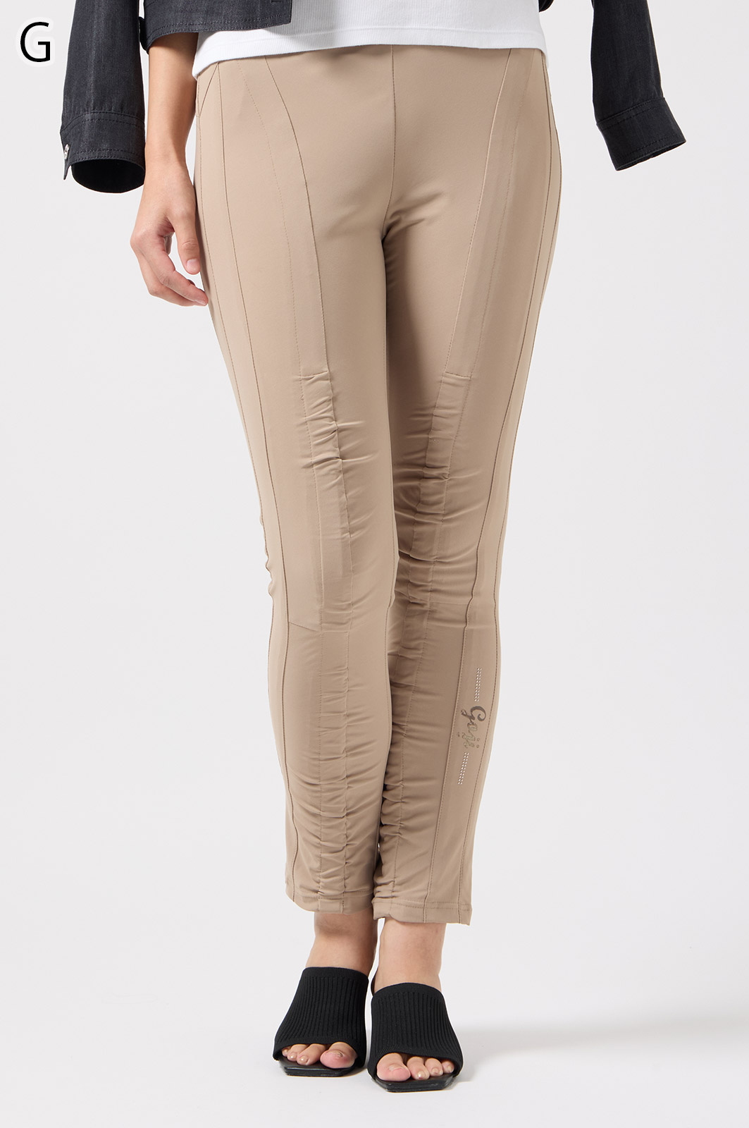 伸びがよく柔らかな無地生地を使い、ウエストは楽ちんなゴム仕様。縦の切り替えとギャザーで脚をすらっと見せ、他にはないオリジナル柄をプリントしました。