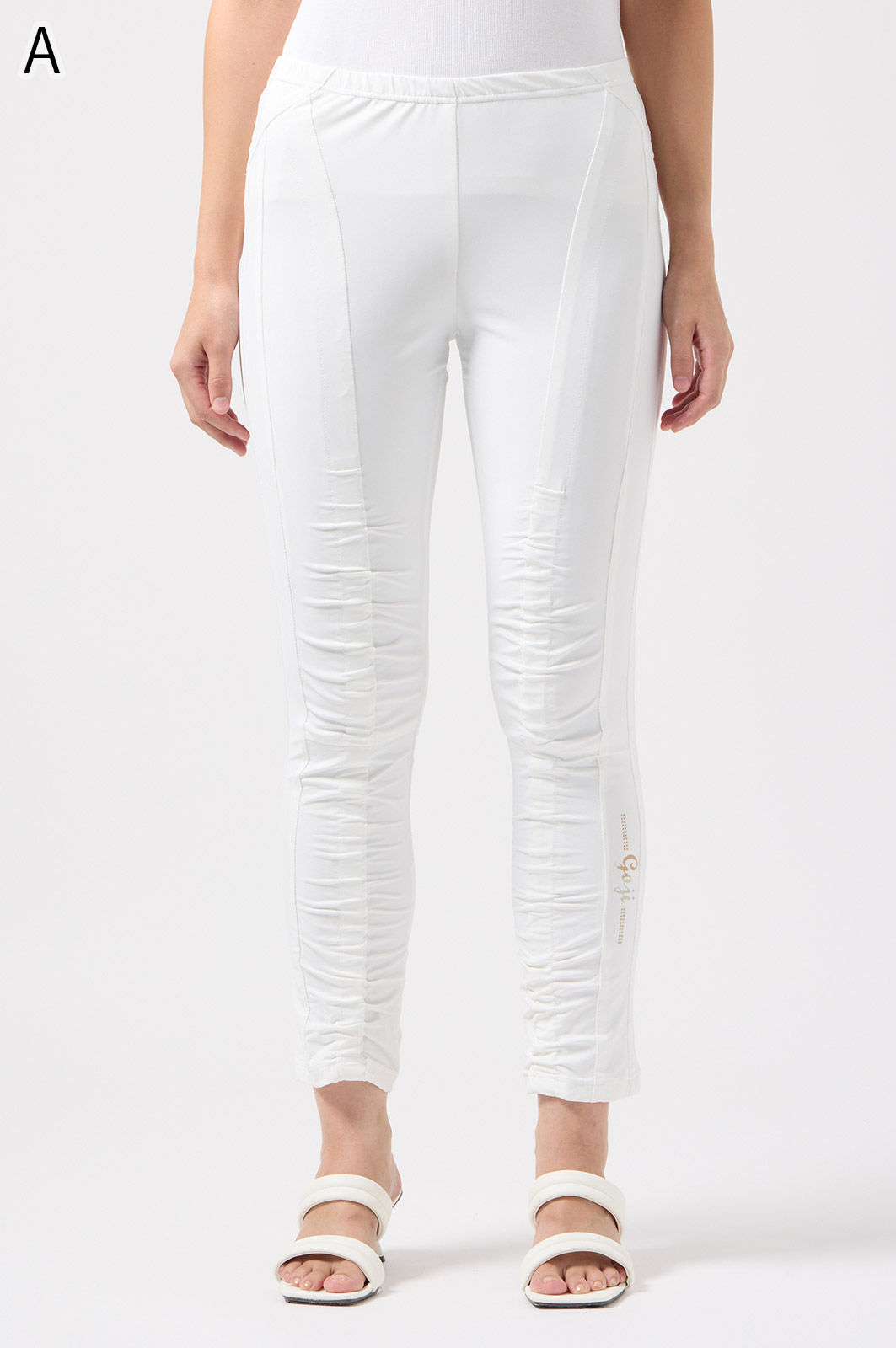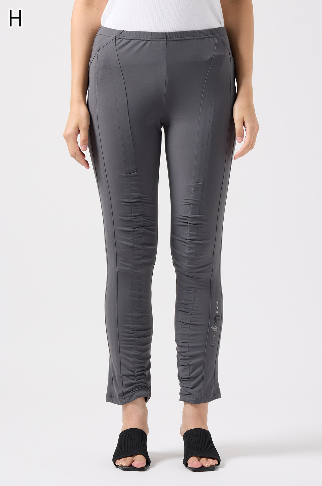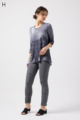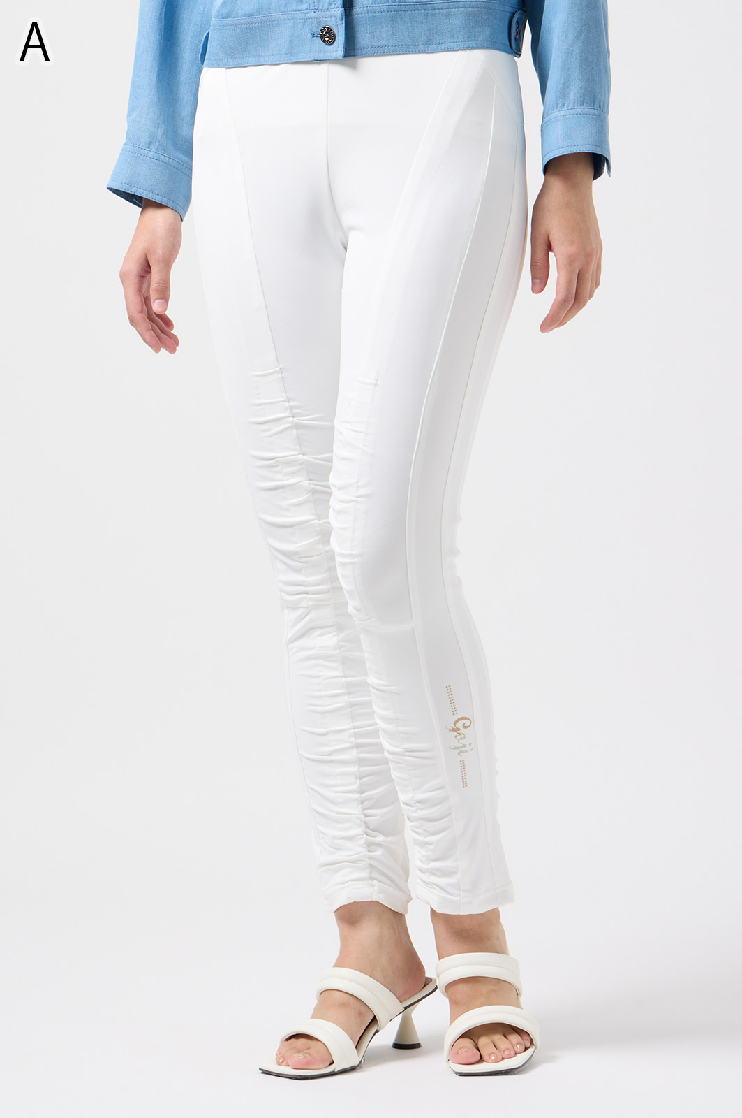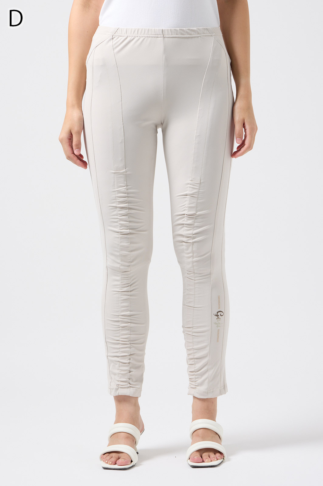 伸びがよく柔らかな無地生地を使い、ウエストは楽ちんなゴム仕様。縦の切り替えとギャザーで脚をすらっと見せ、他にはないオリジナル柄をプリントしました。