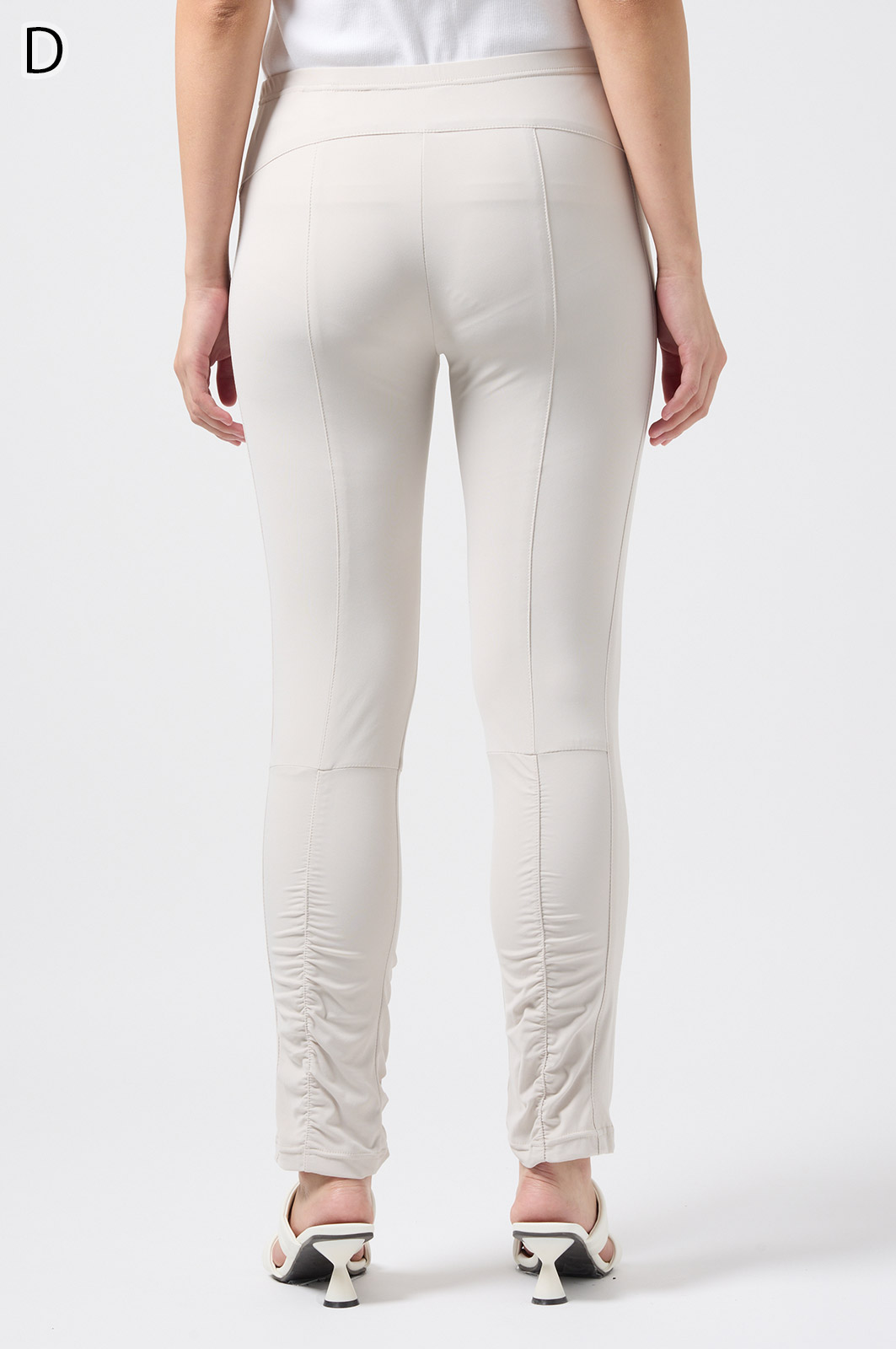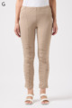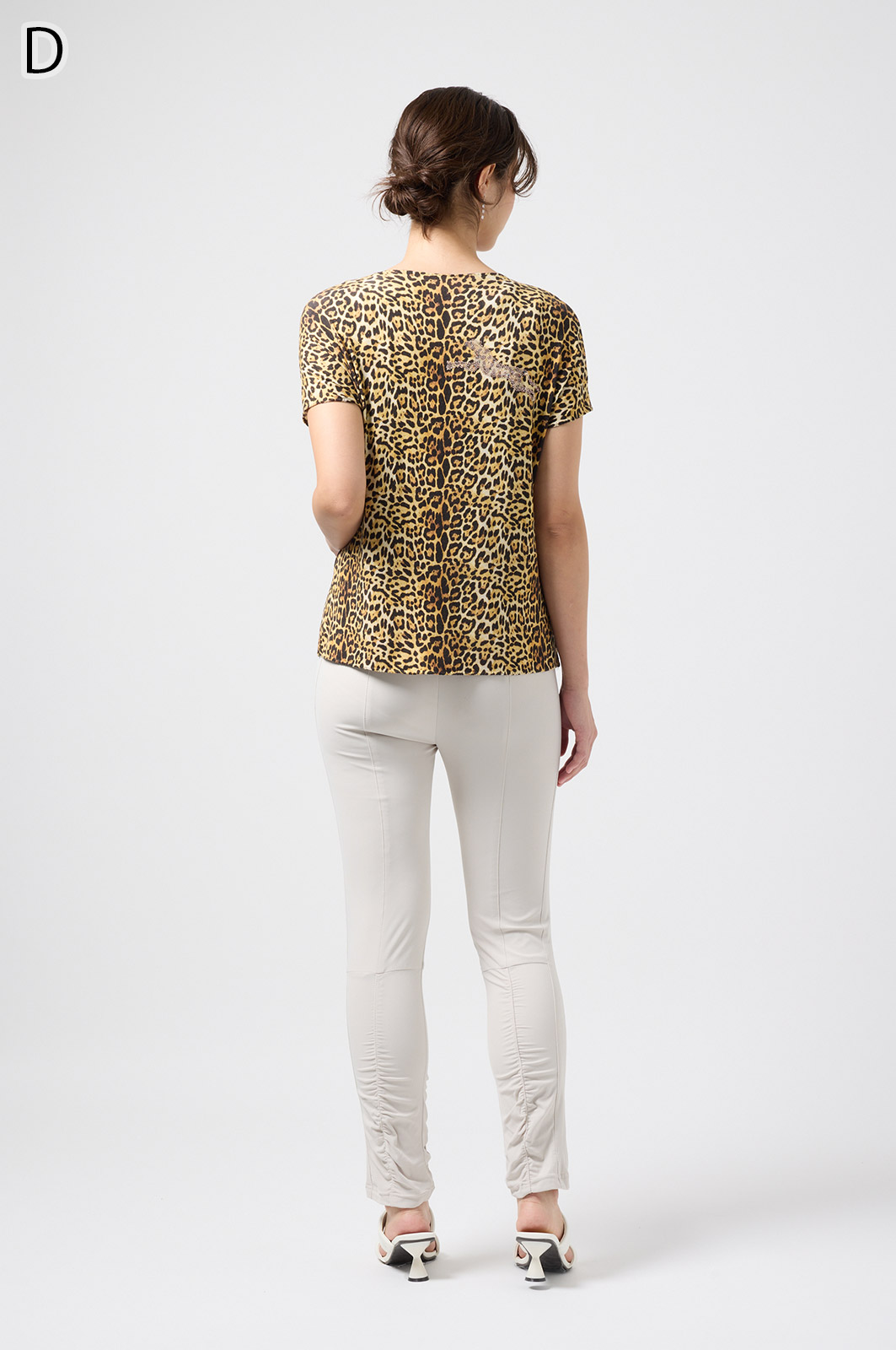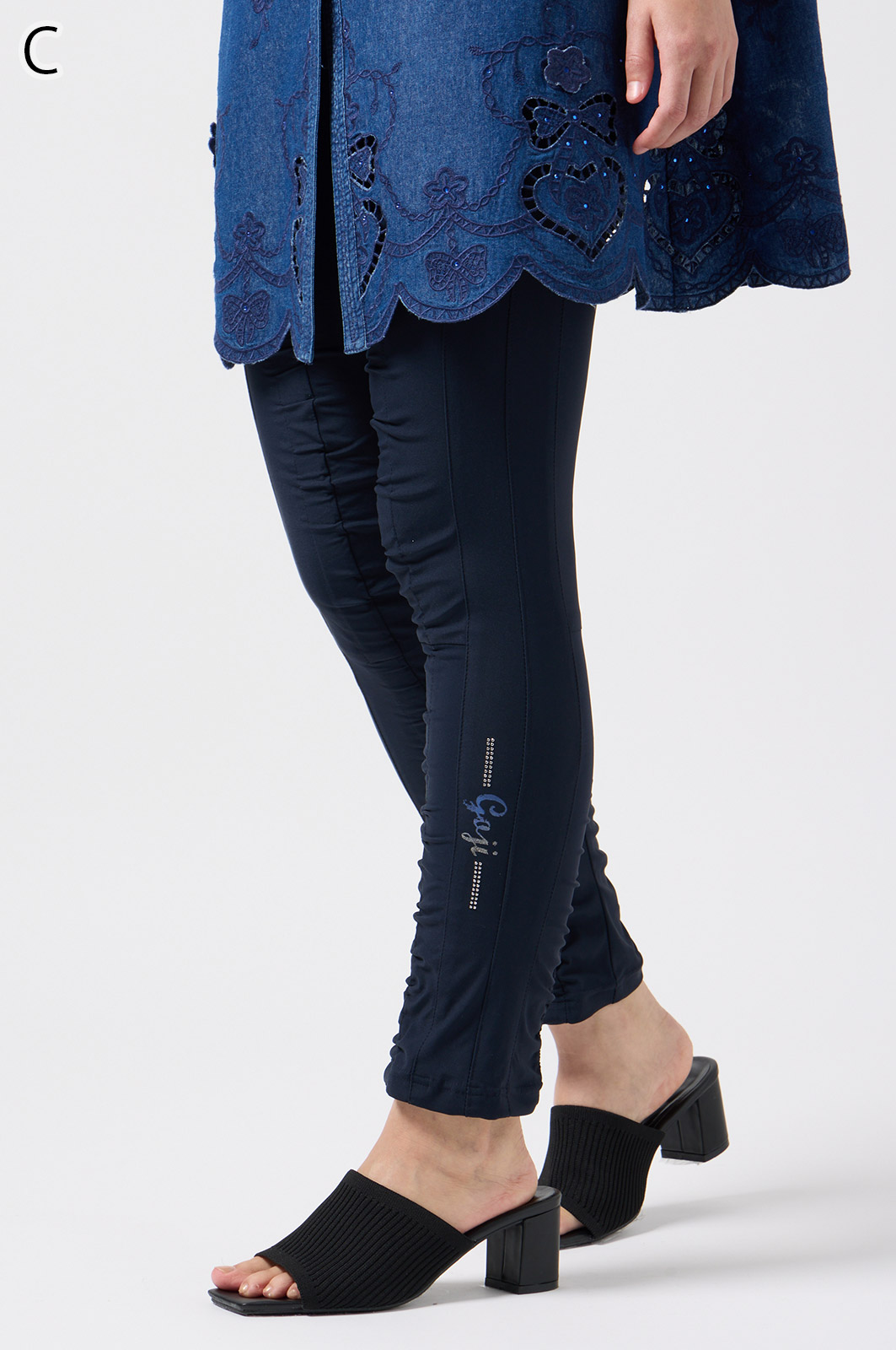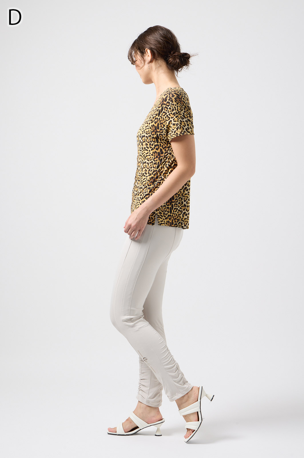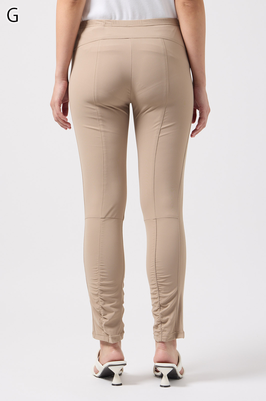 伸びがよく柔らかな無地生地を使い、ウエストは楽ちんなゴム仕様。縦の切り替えとギャザーで脚をすらっと見せ、他にはないオリジナル柄をプリントしました。