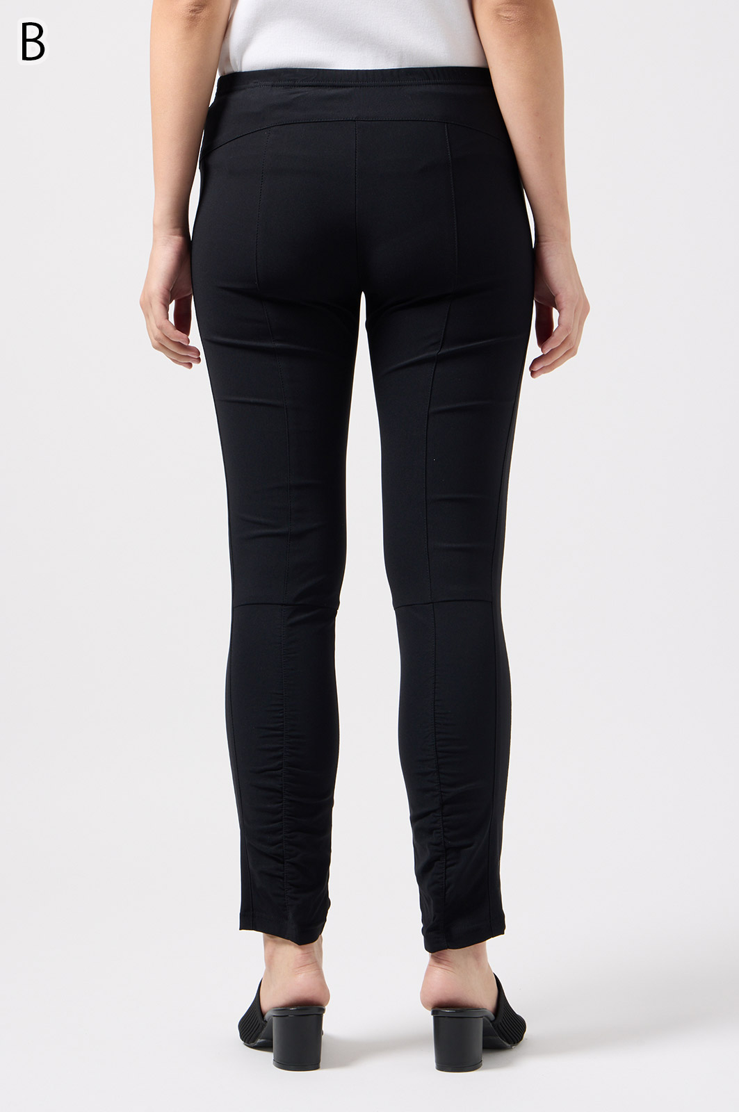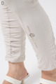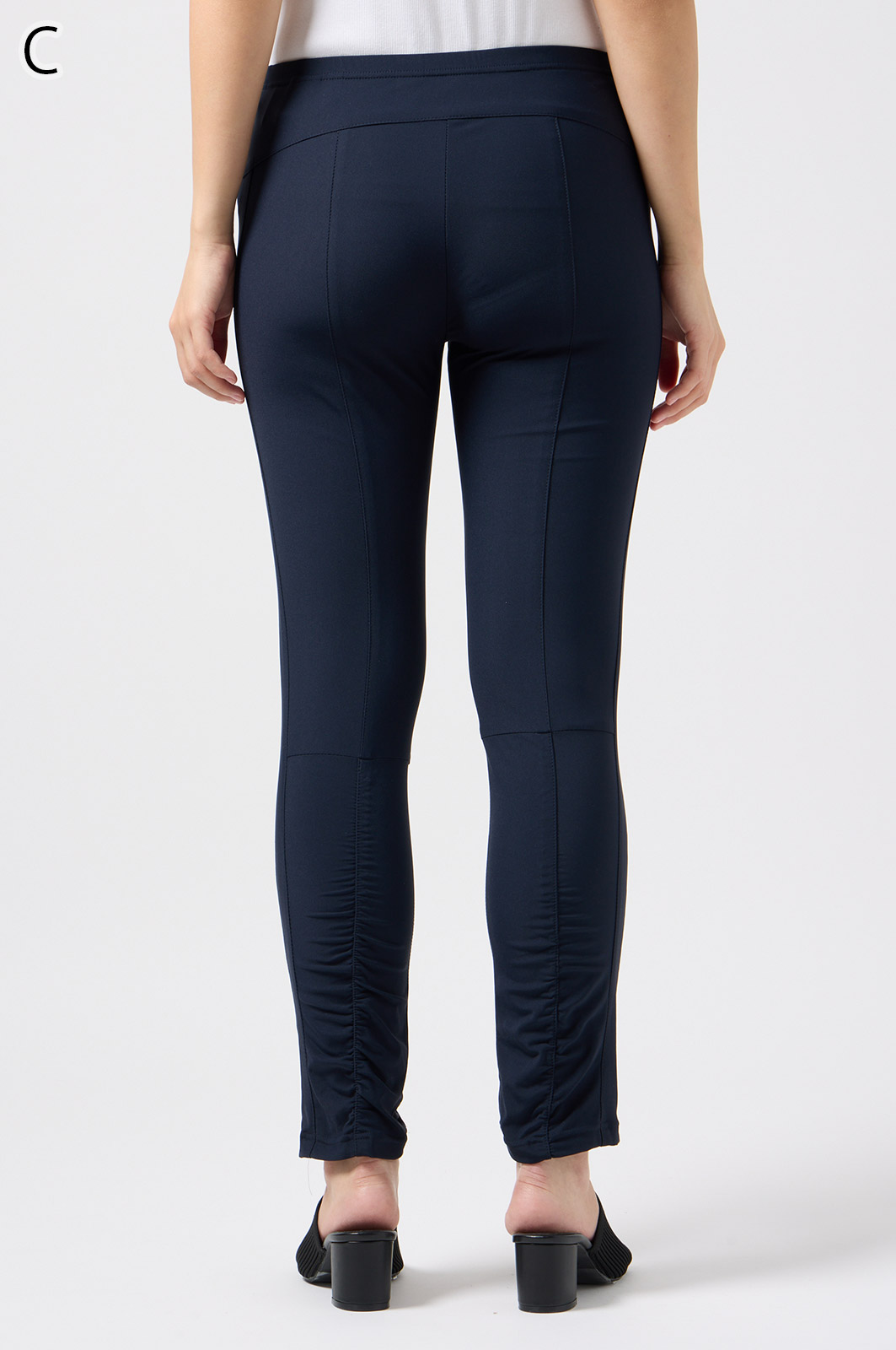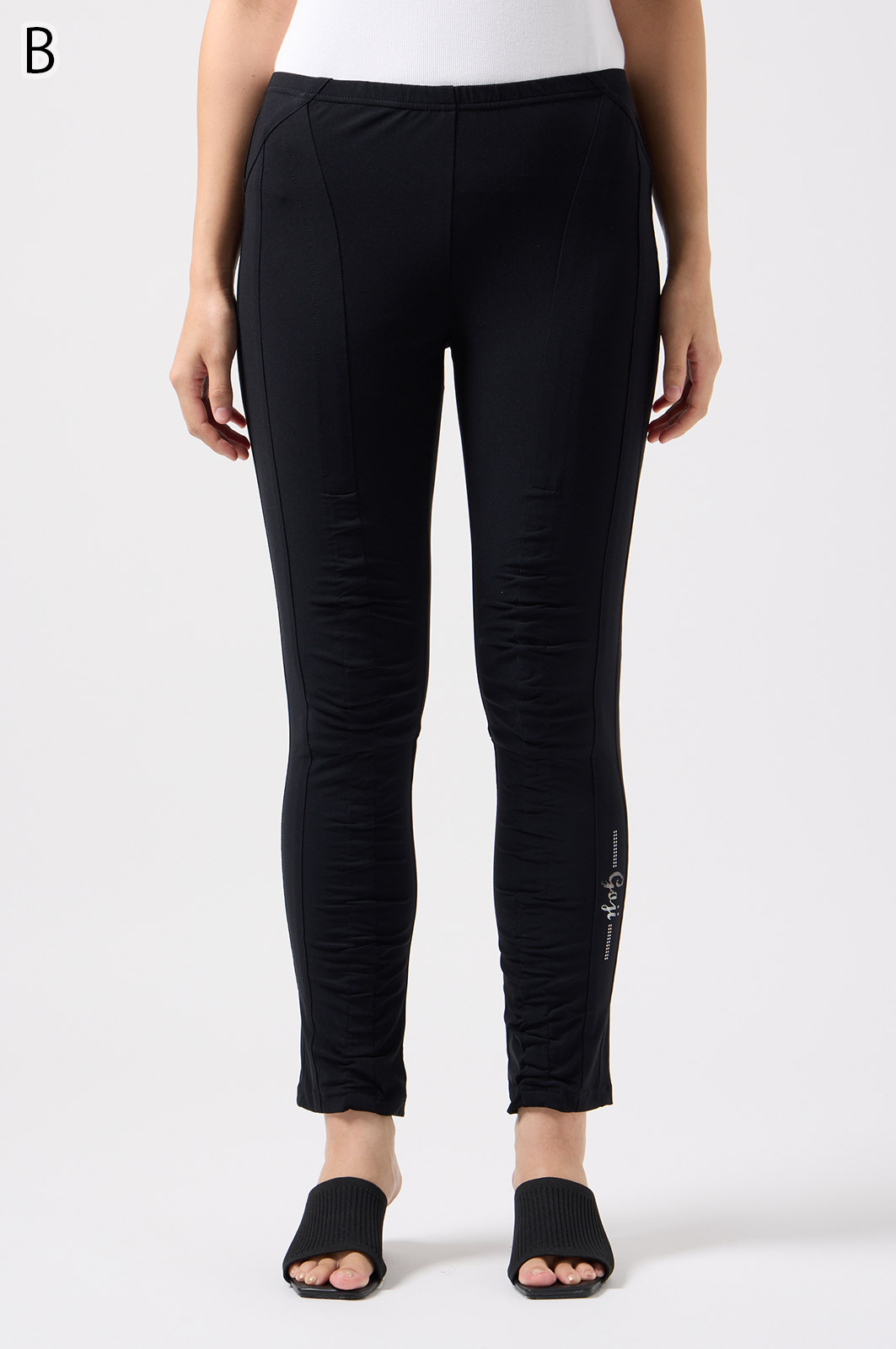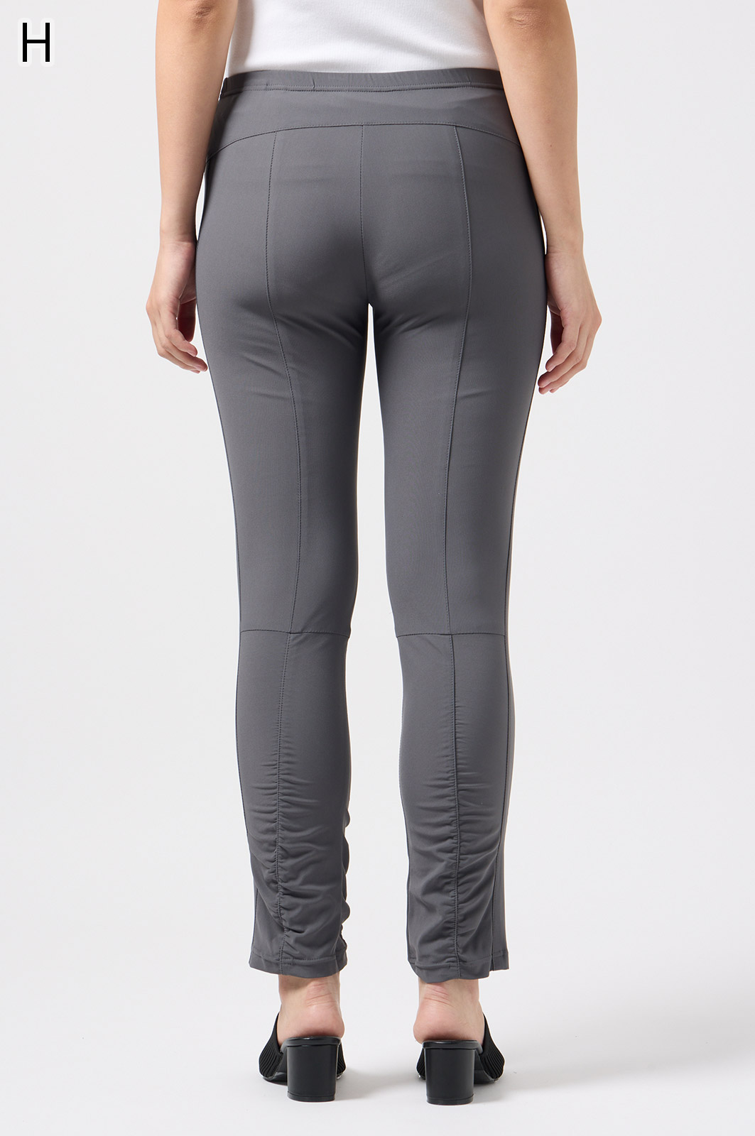 伸びがよく柔らかな無地生地を使い、ウエストは楽ちんなゴム仕様。縦の切り替えとギャザーで脚をすらっと見せ、他にはないオリジナル柄をプリントしました。