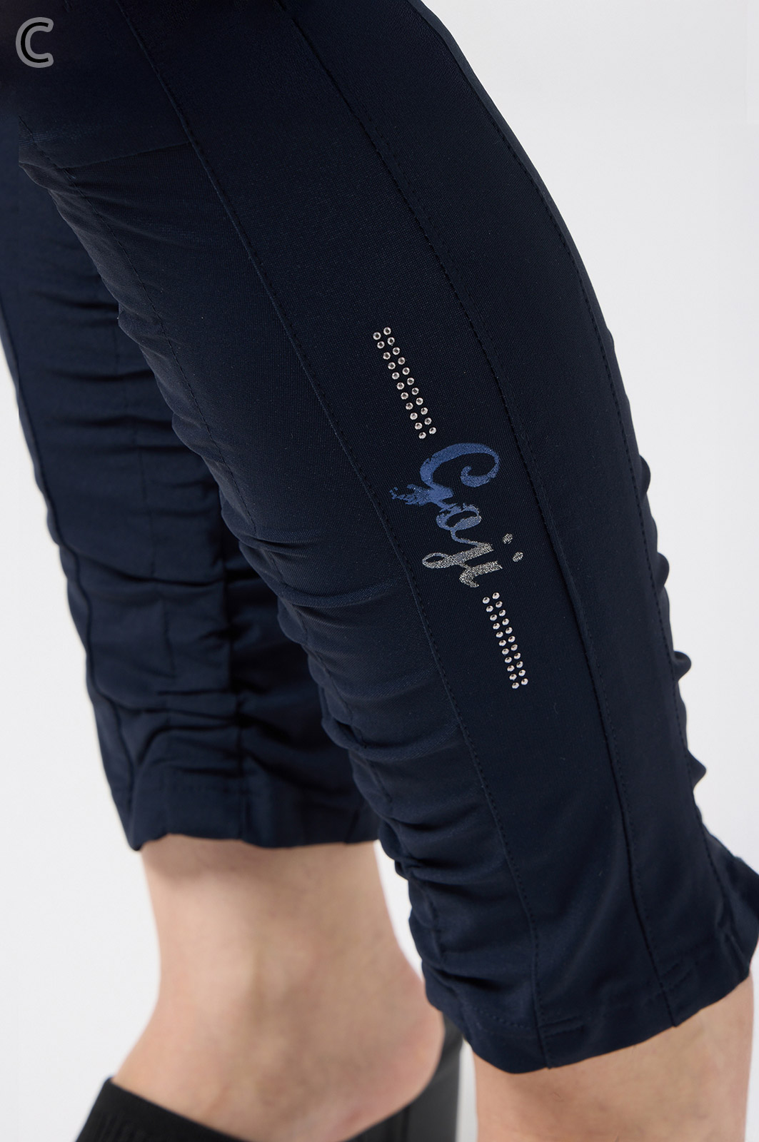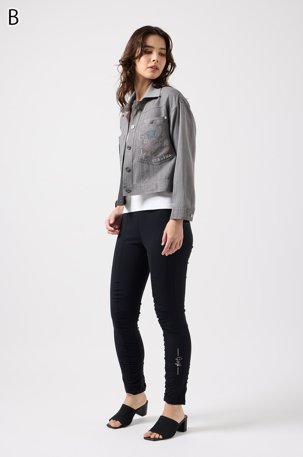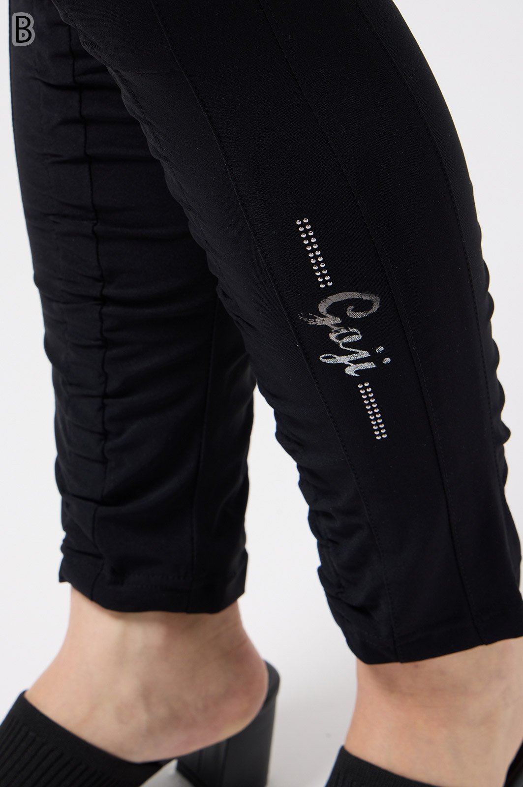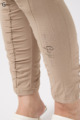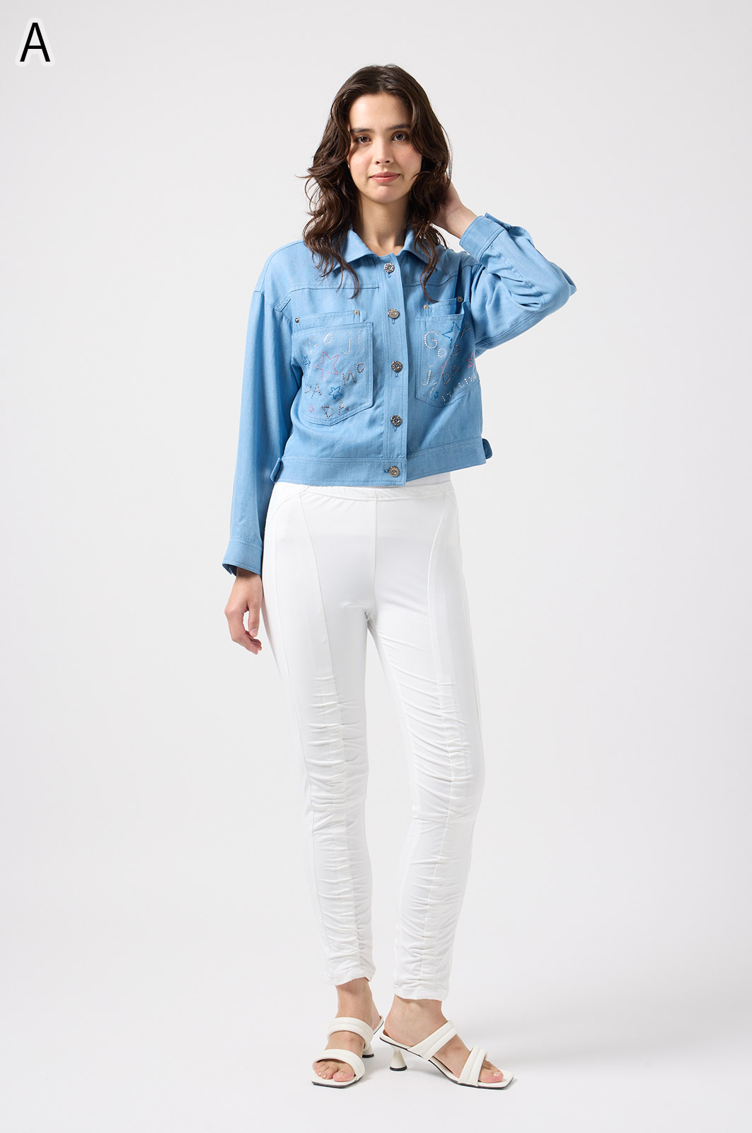 伸びがよく柔らかな無地生地を使い、ウエストは楽ちんなゴム仕様。縦の切り替えとギャザーで脚をすらっと見せ、他にはないオリジナル柄をプリントしました。