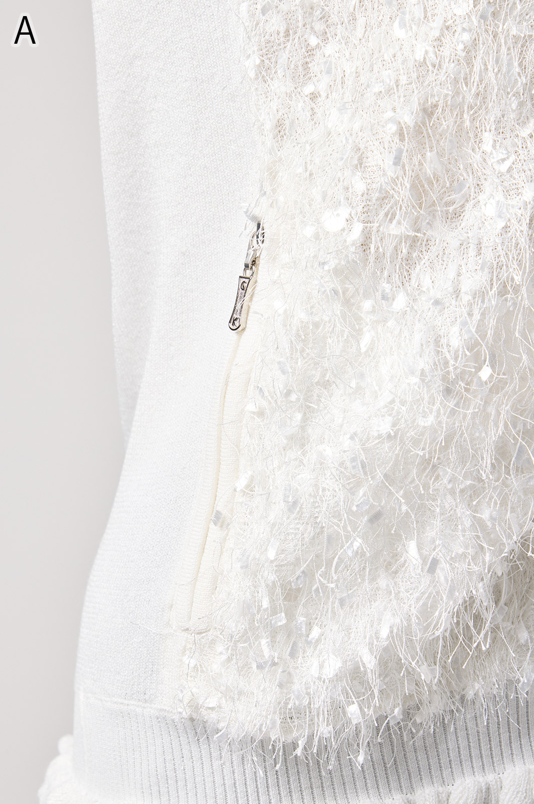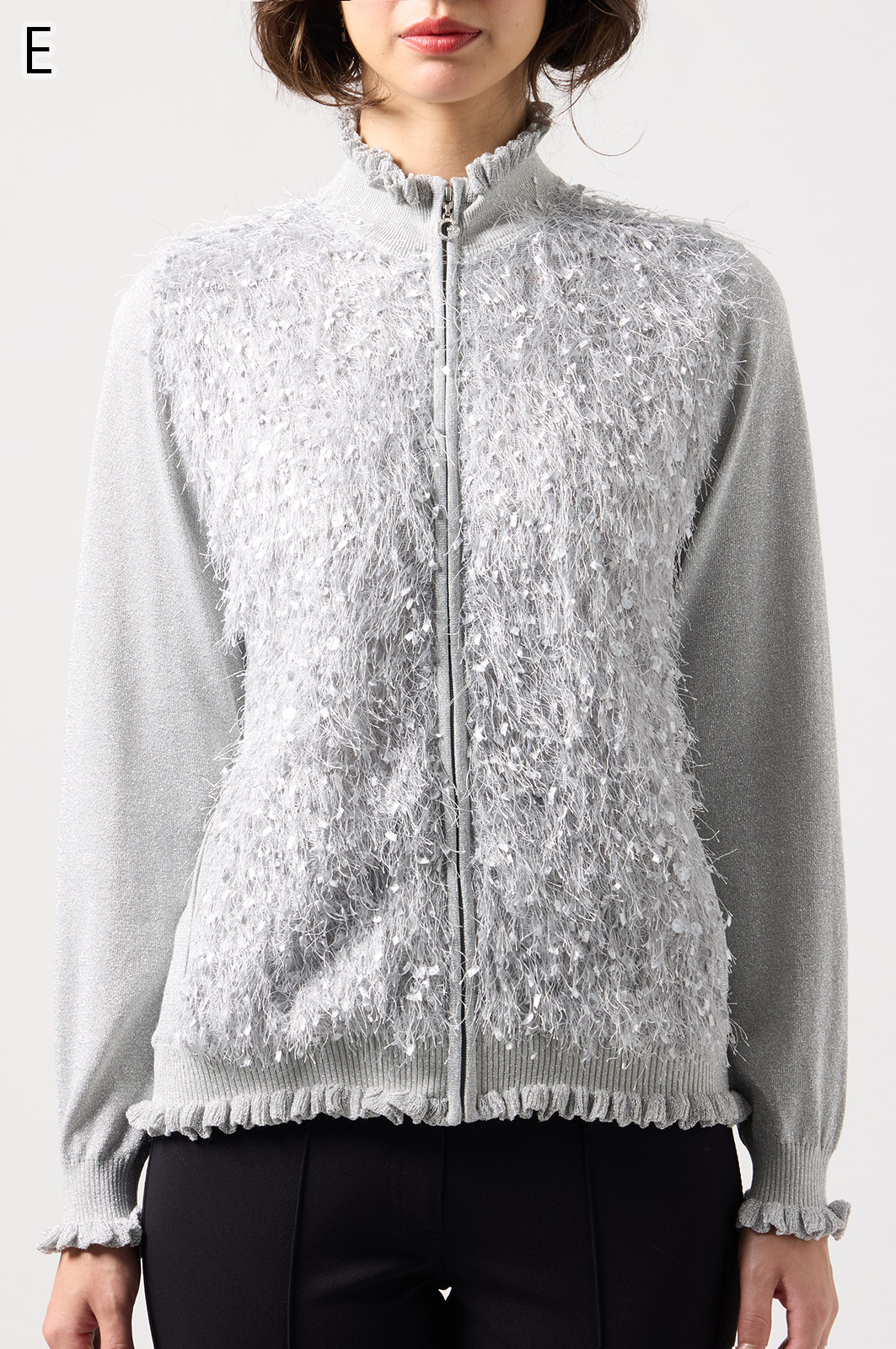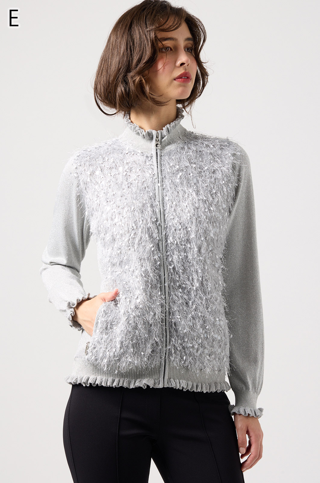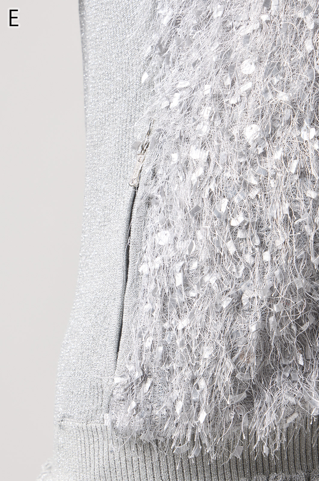 きらきら輝くスパンコール入りの生地と、光沢感のあるニットを組み合わせた羽織りカーディガン。華やかなシーンでもおしゃれに決まる一着です。