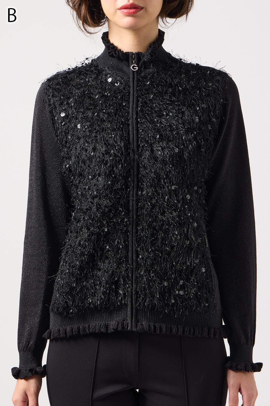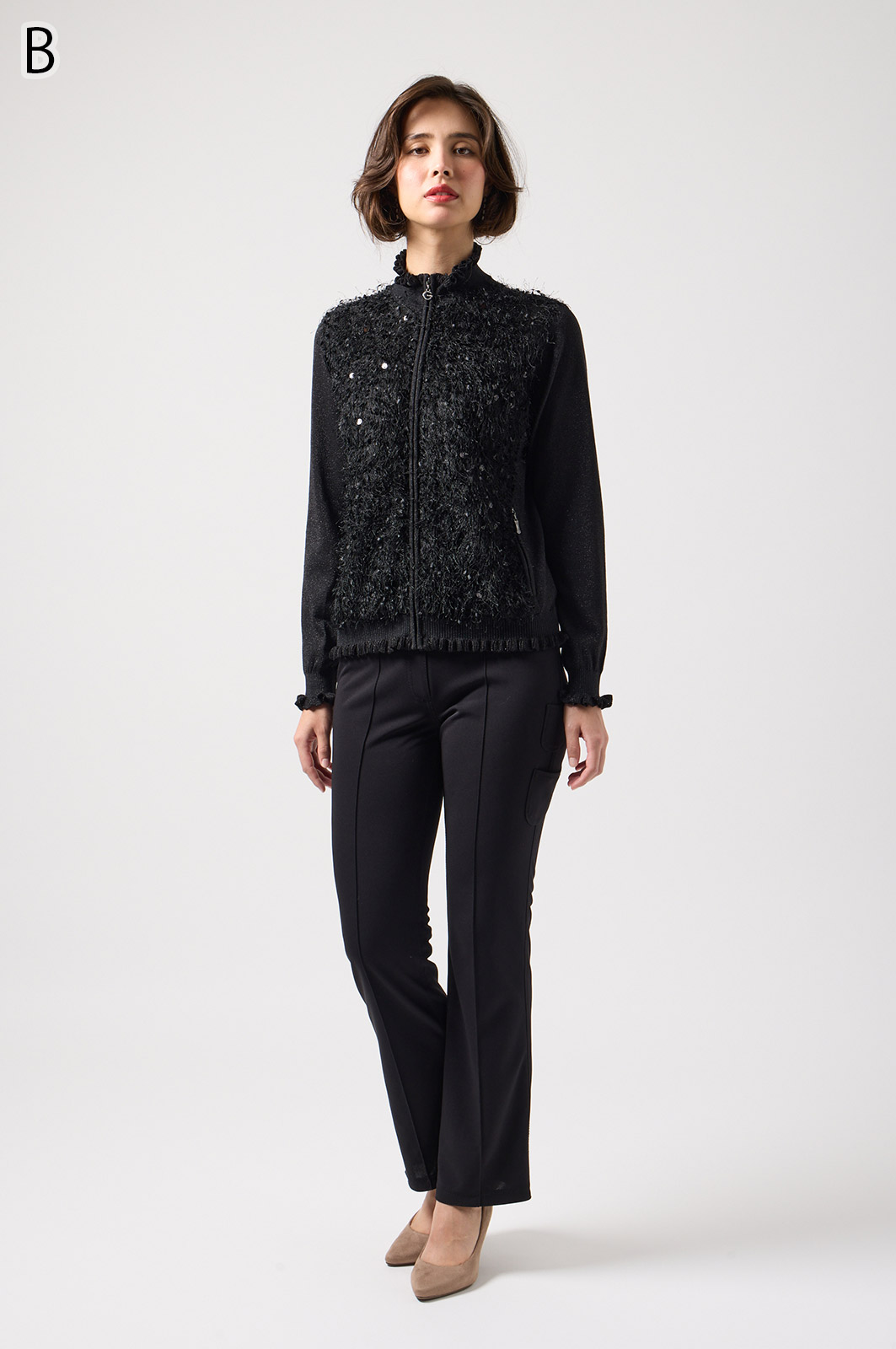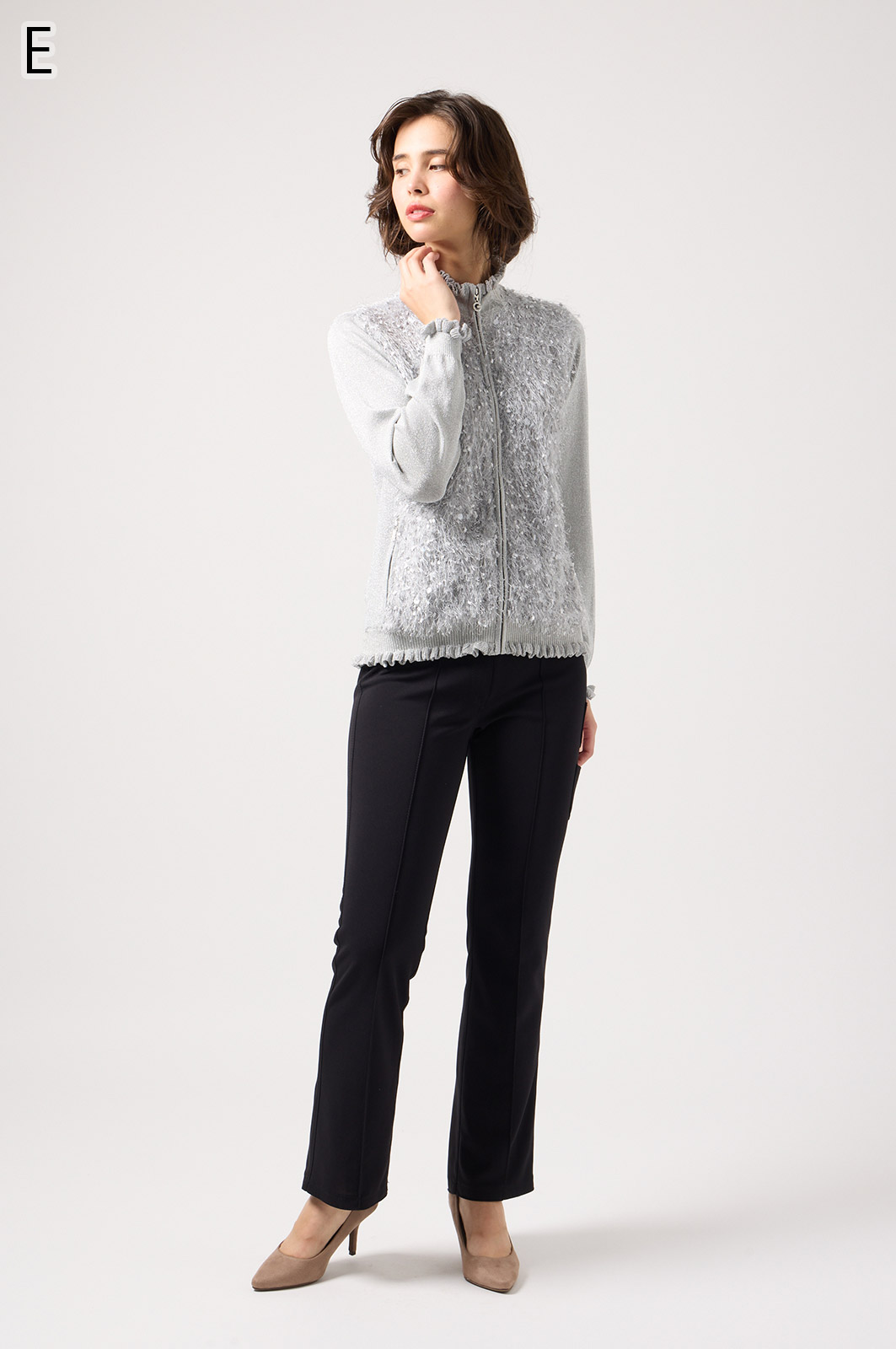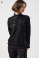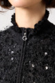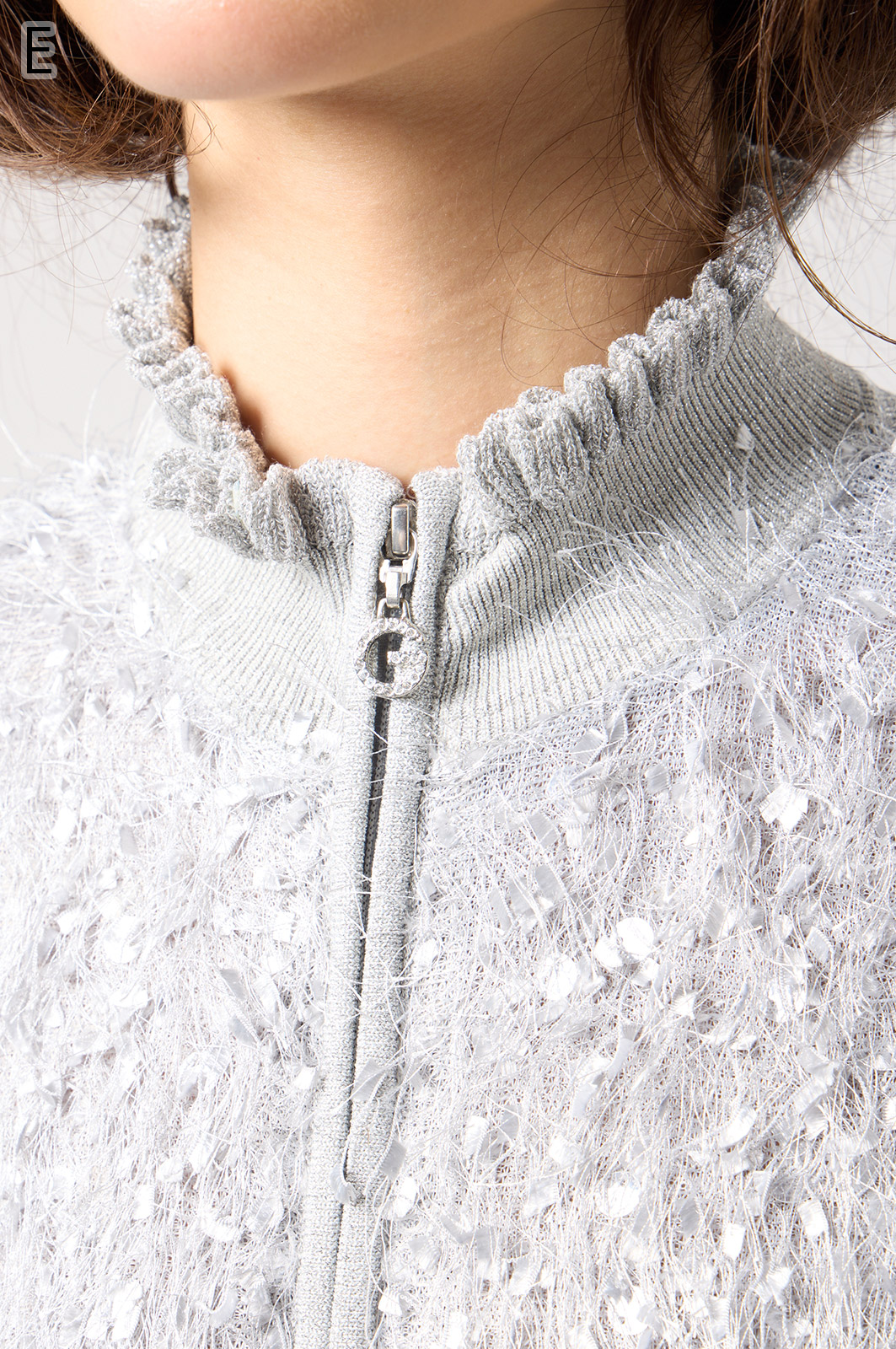 きらきら輝くスパンコール入りの生地と、光沢感のあるニットを組み合わせた羽織りカーディガン。華やかなシーンでもおしゃれに決まる一着です。