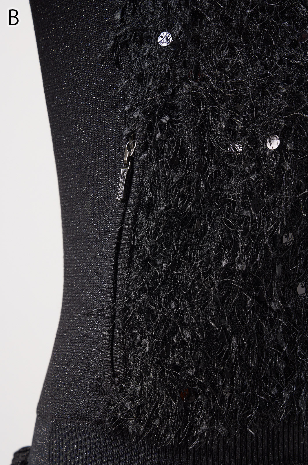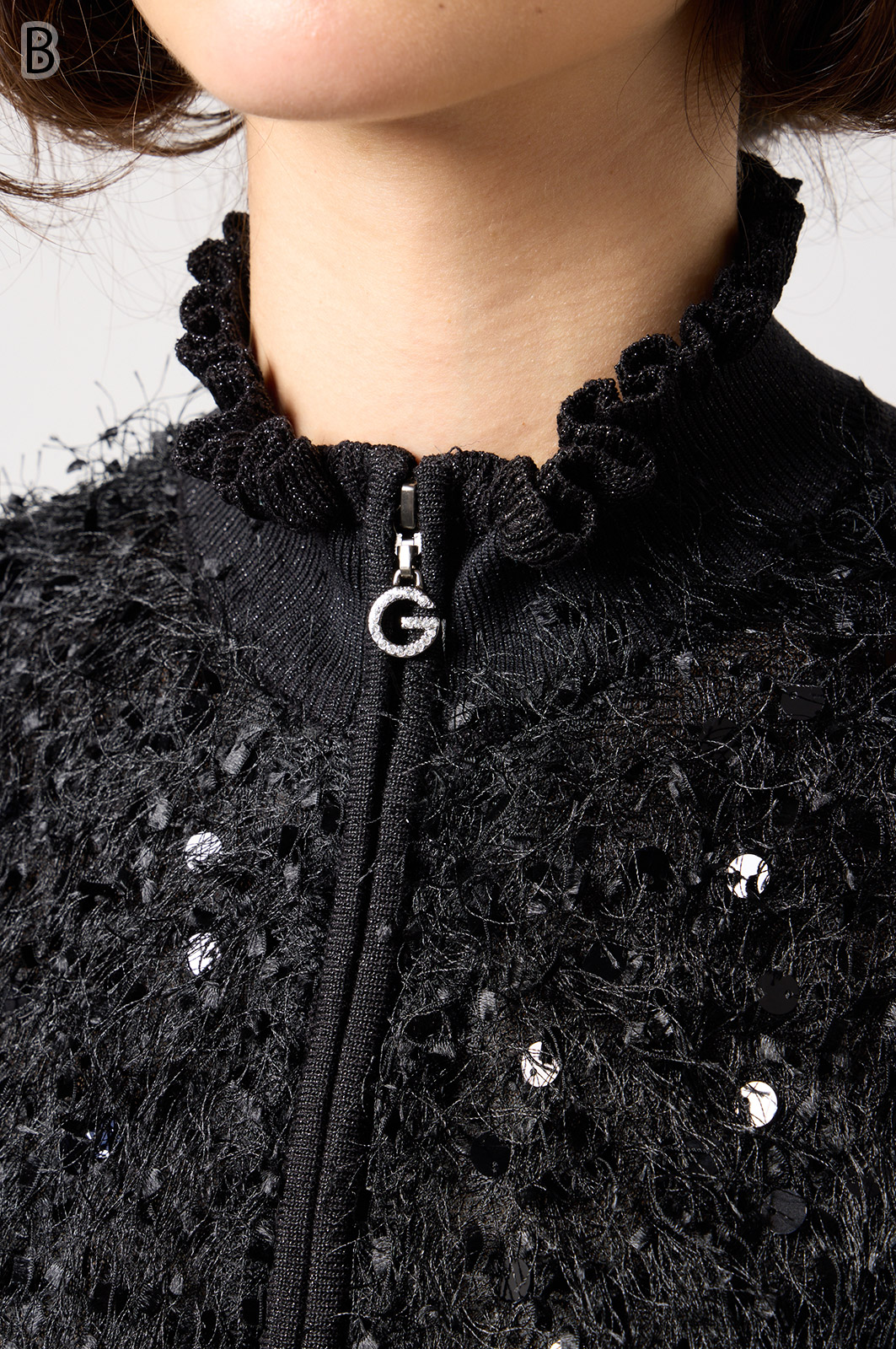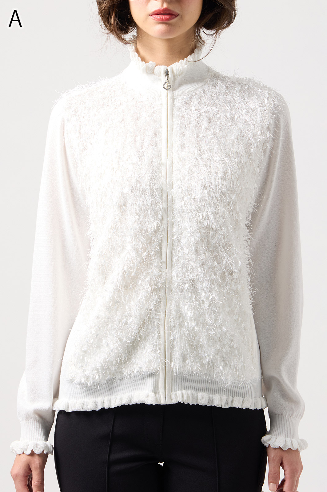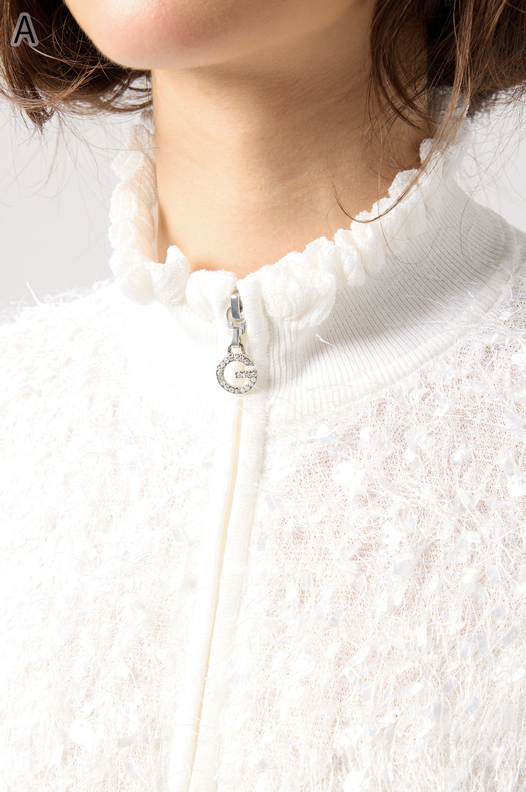 きらきら輝くスパンコール入りの生地と、光沢感のあるニットを組み合わせた羽織りカーディガン。華やかなシーンでもおしゃれに決まる一着です。