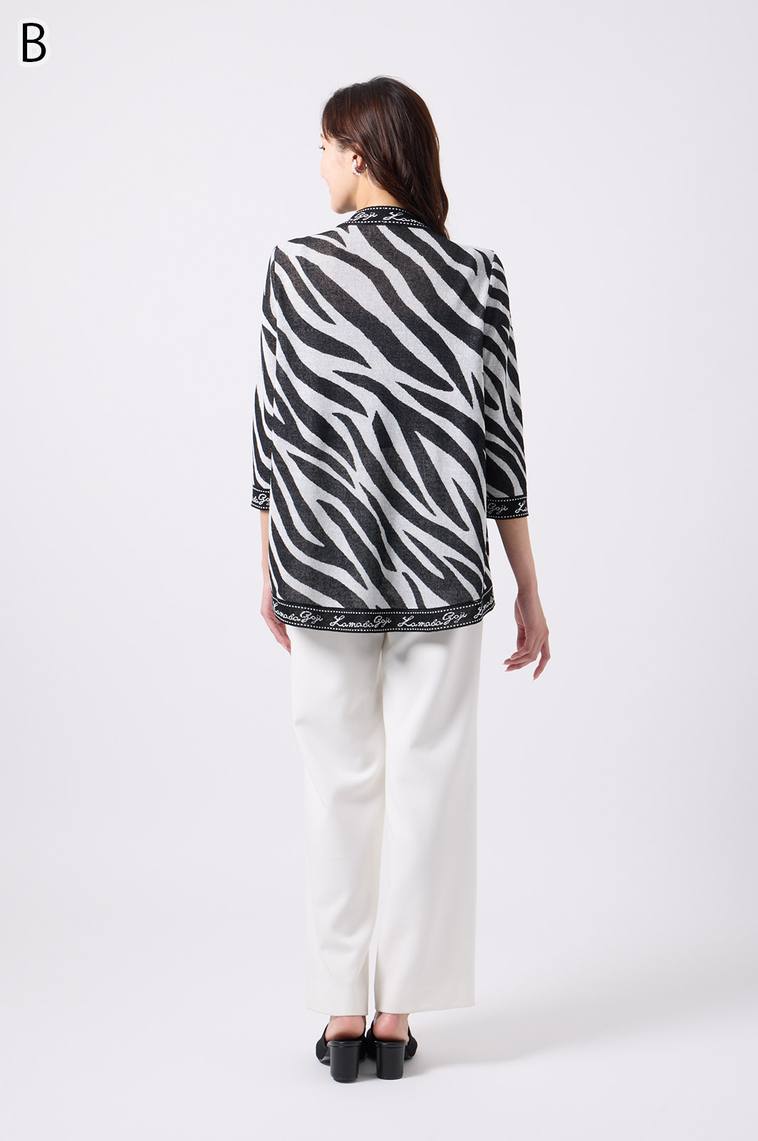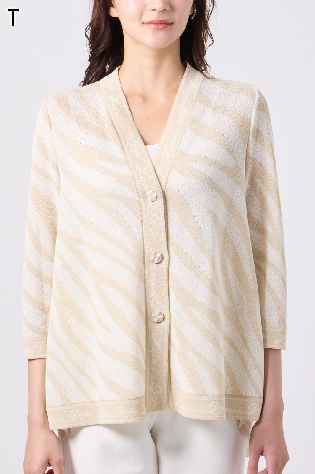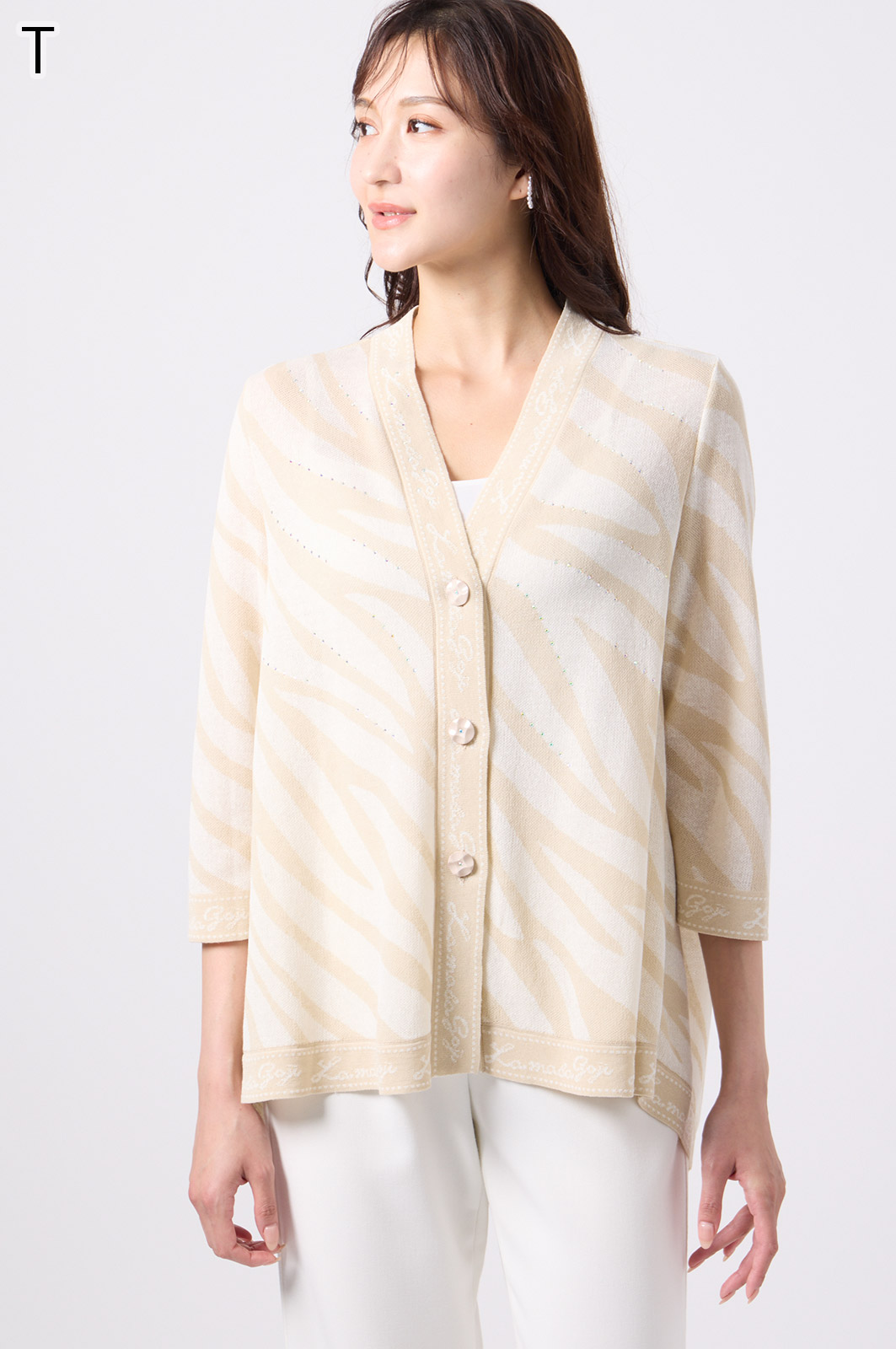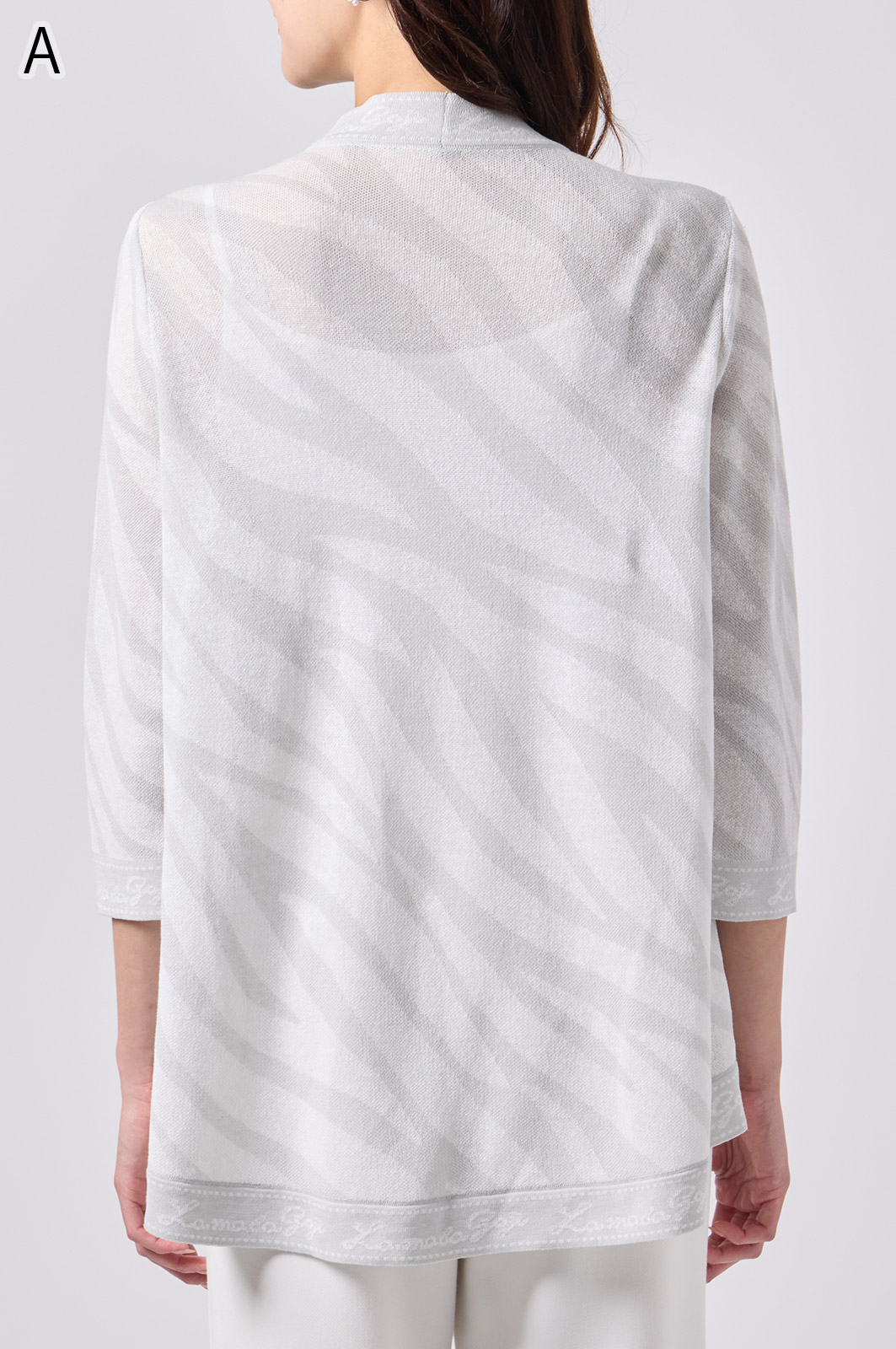 綿麻素材のミックス糸で編み上げた、ゼブラ柄が印象的な涼しげカーディガン。軽やかな風合いで春夏にぴったり。編地にさりげなく施されたオリジナルロゴが、大人の遊び心をプラスします。