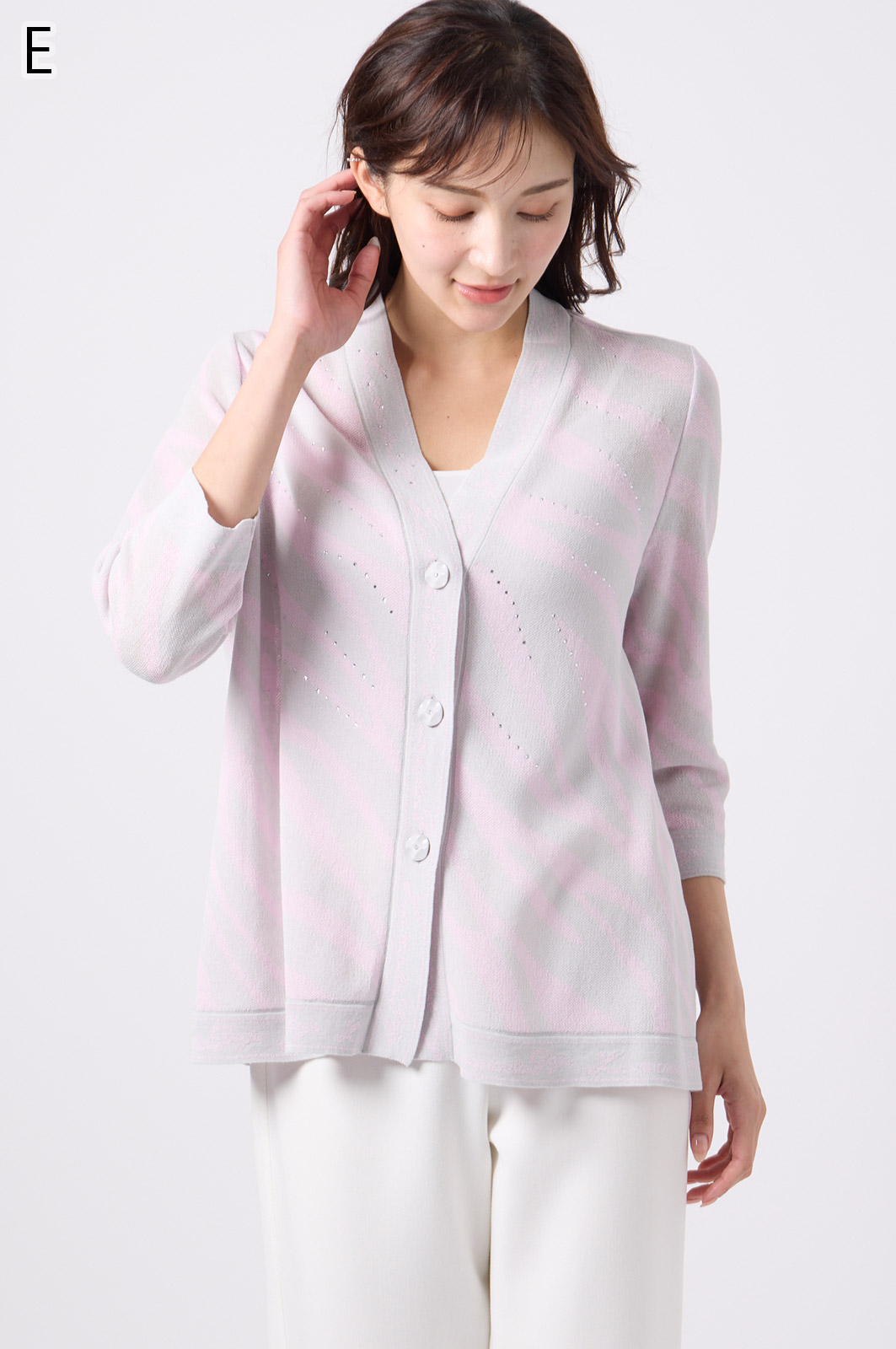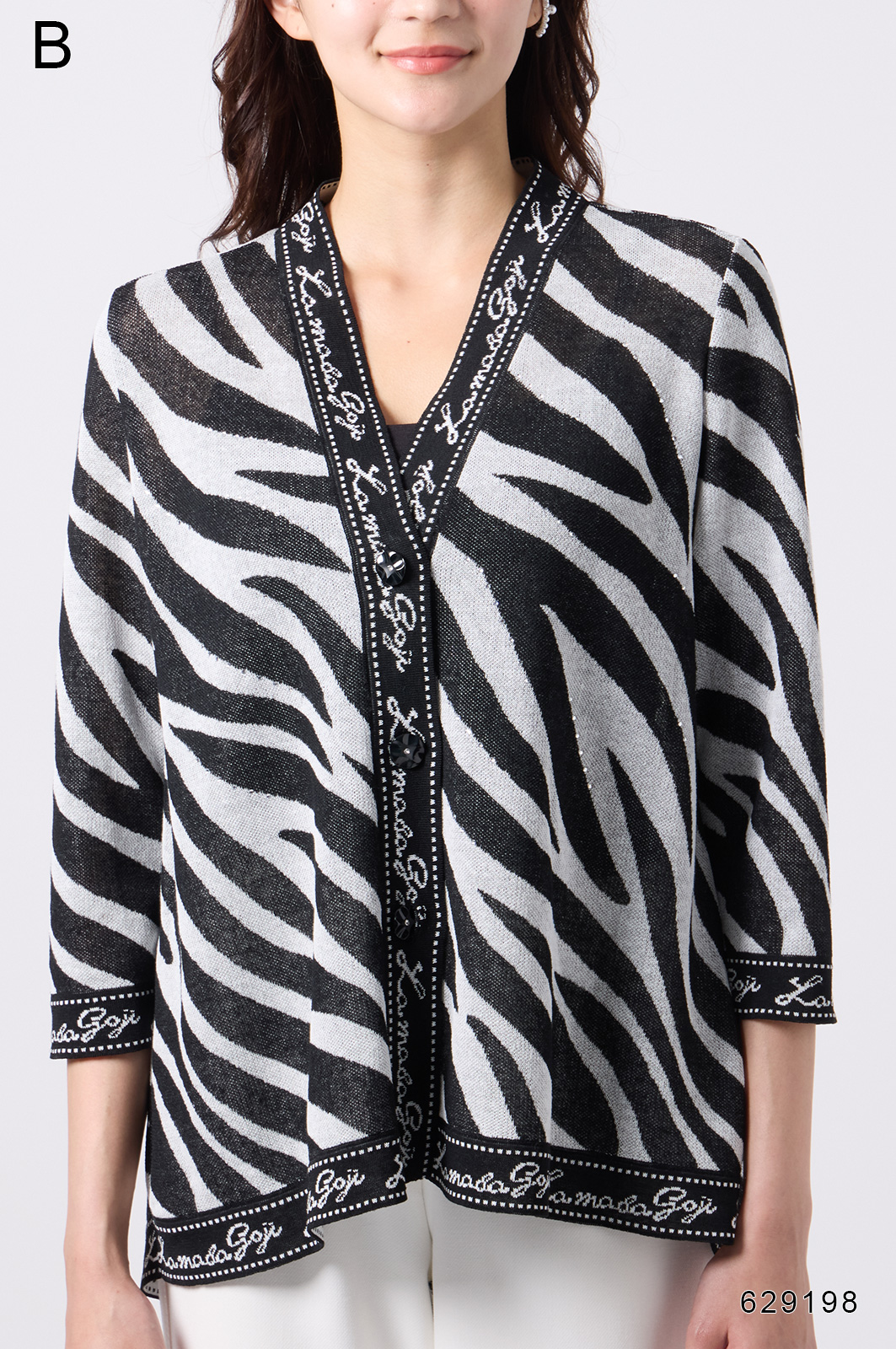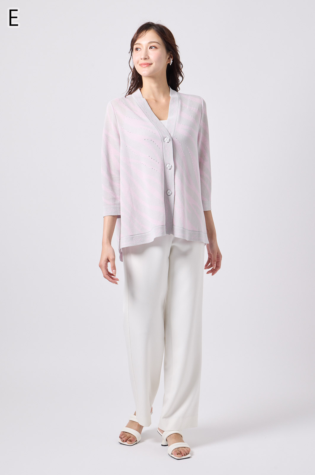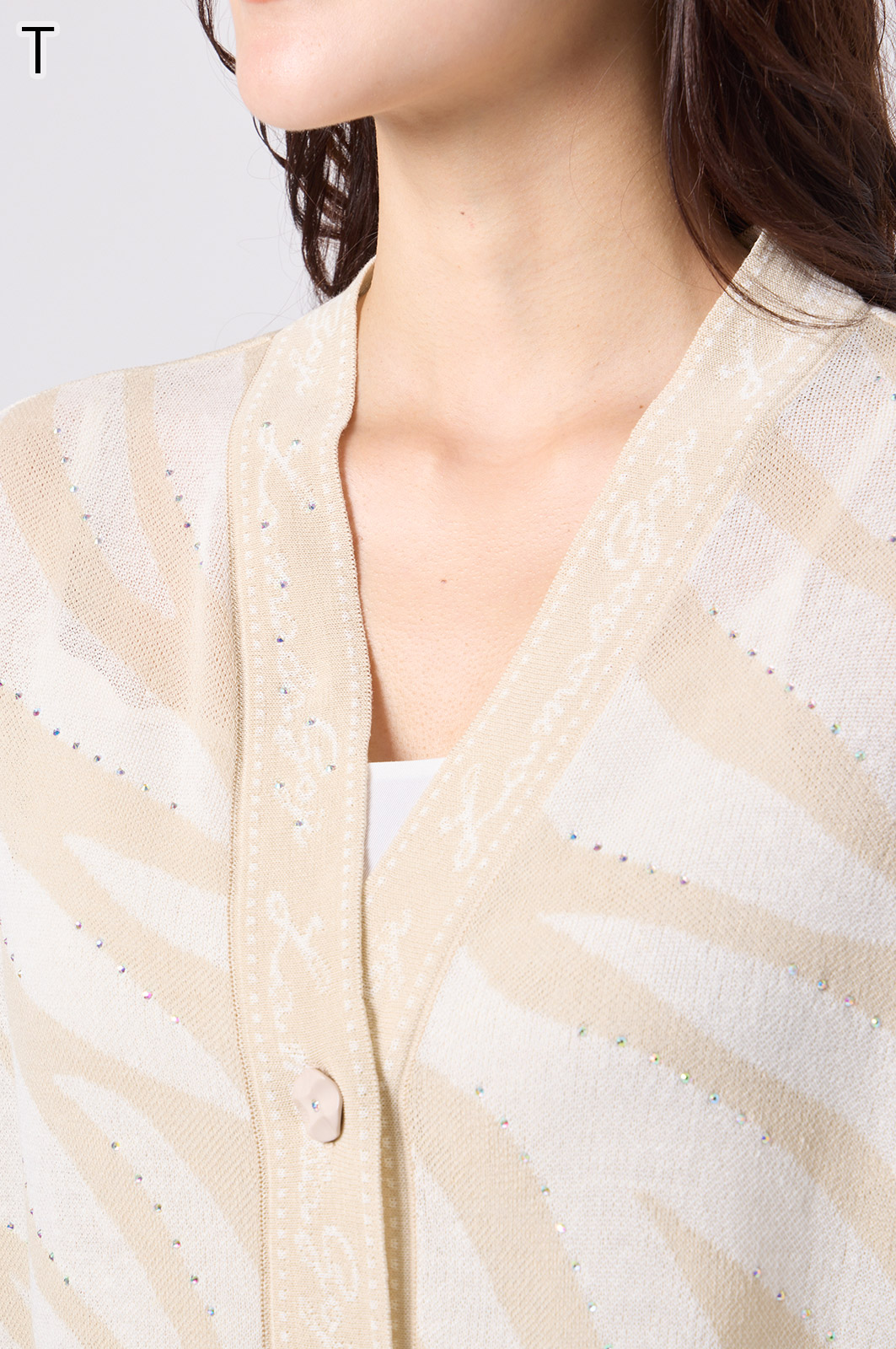 綿麻素材のミックス糸で編み上げた、ゼブラ柄が印象的な涼しげカーディガン。軽やかな風合いで春夏にぴったり。編地にさりげなく施されたオリジナルロゴが、大人の遊び心をプラスします。