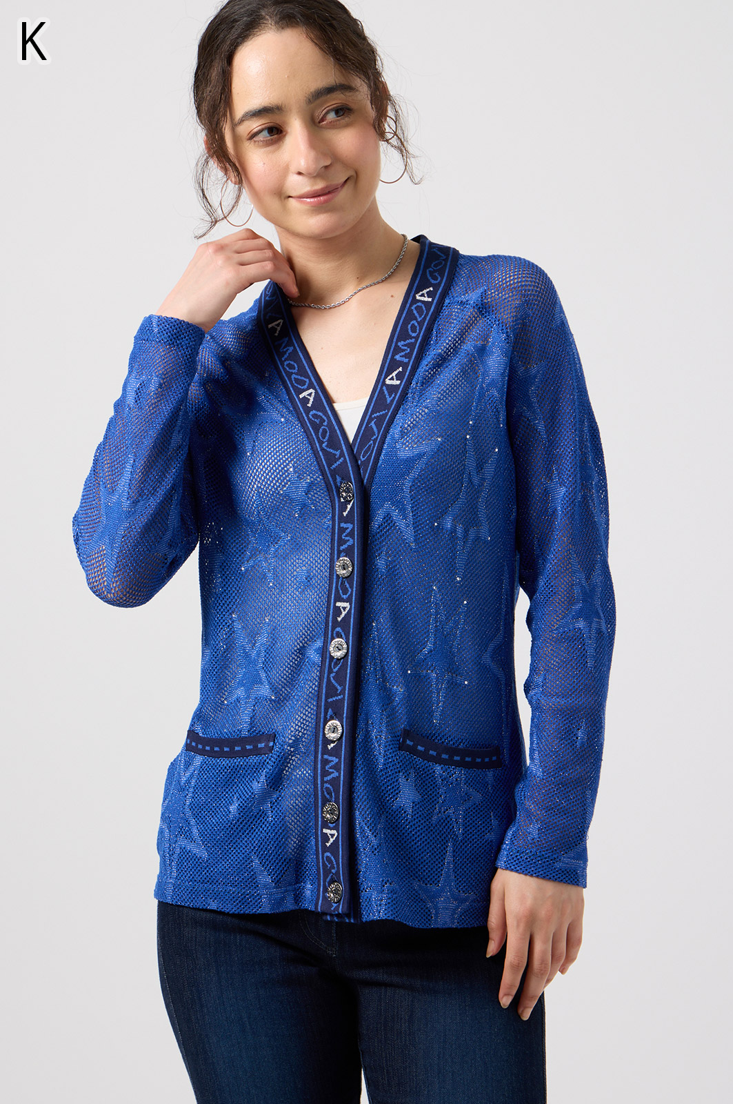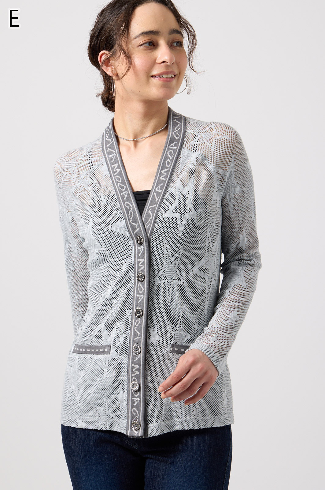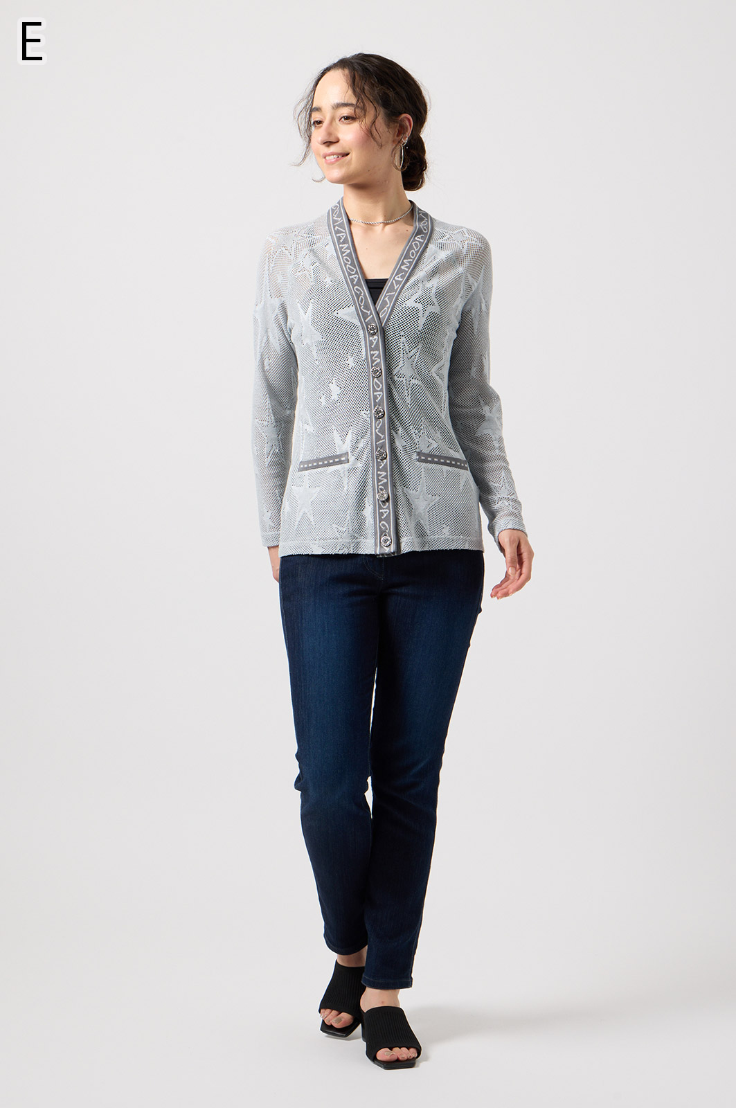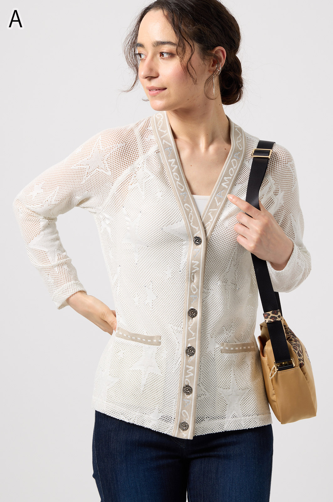 星柄ラメのきらっとしたメッシュ素材が目を引く、軽く羽織れるカーディガン。肩まわりが動かしやすいデザインで、前立てとポケットの編み込みがアクセントに。ロゴ入りで個性も◎!