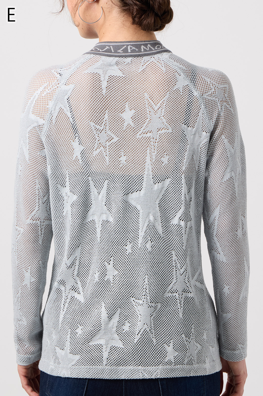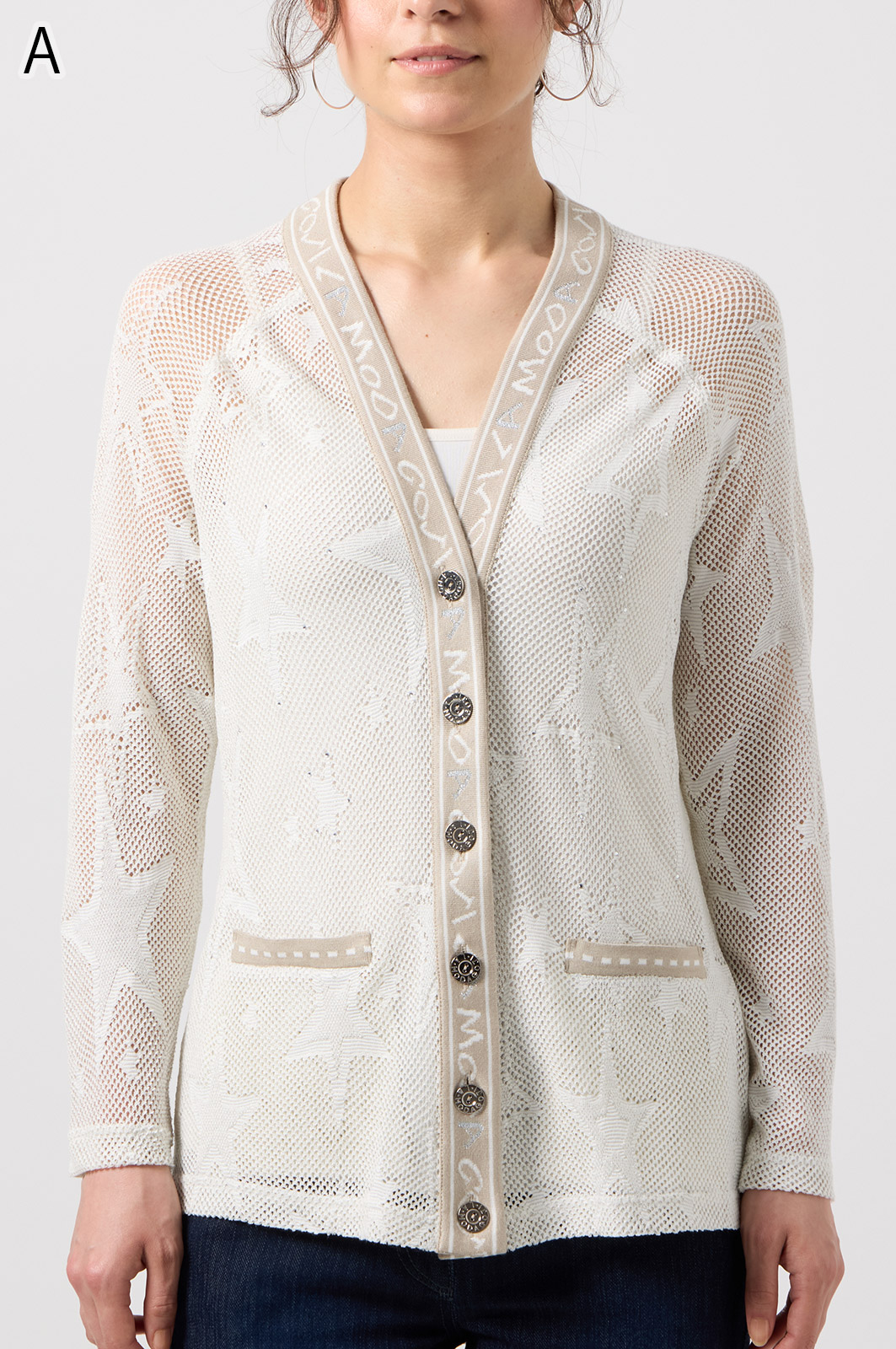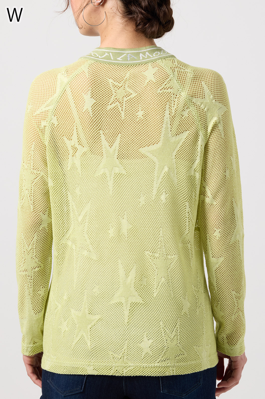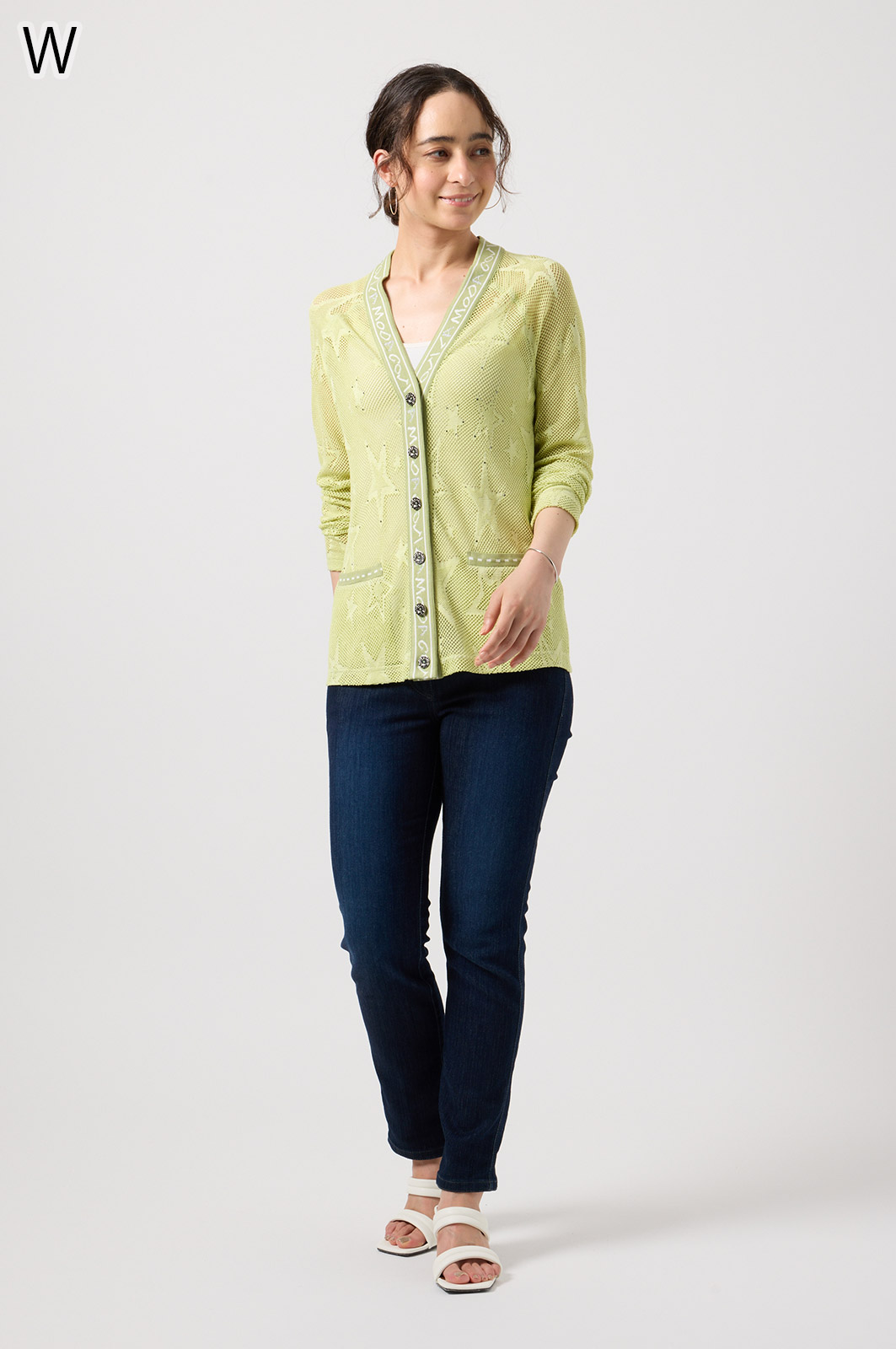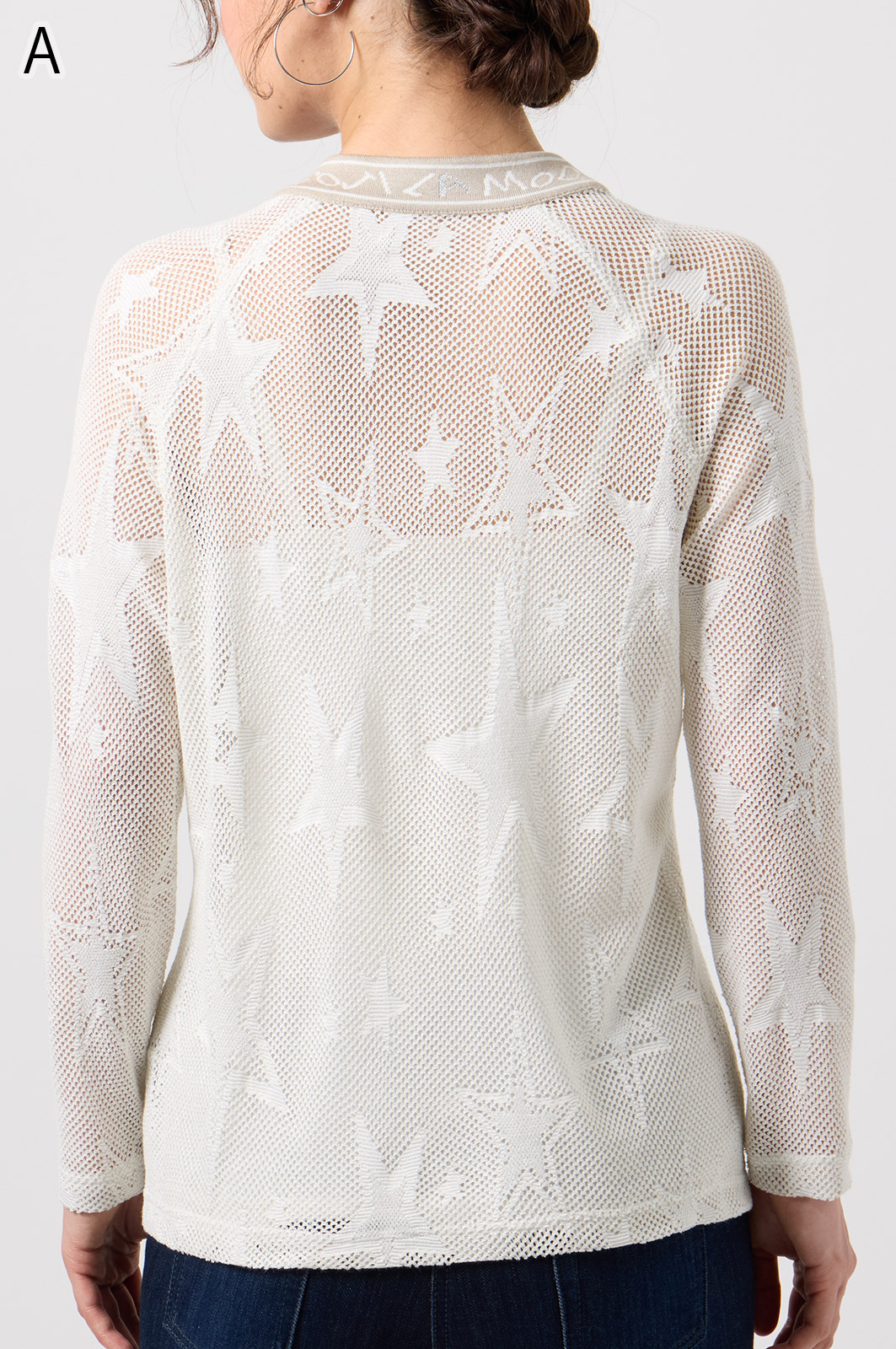 星柄ラメのきらっとしたメッシュ素材が目を引く、軽く羽織れるカーディガン。肩まわりが動かしやすいデザインで、前立てとポケットの編み込みがアクセントに。ロゴ入りで個性も◎!