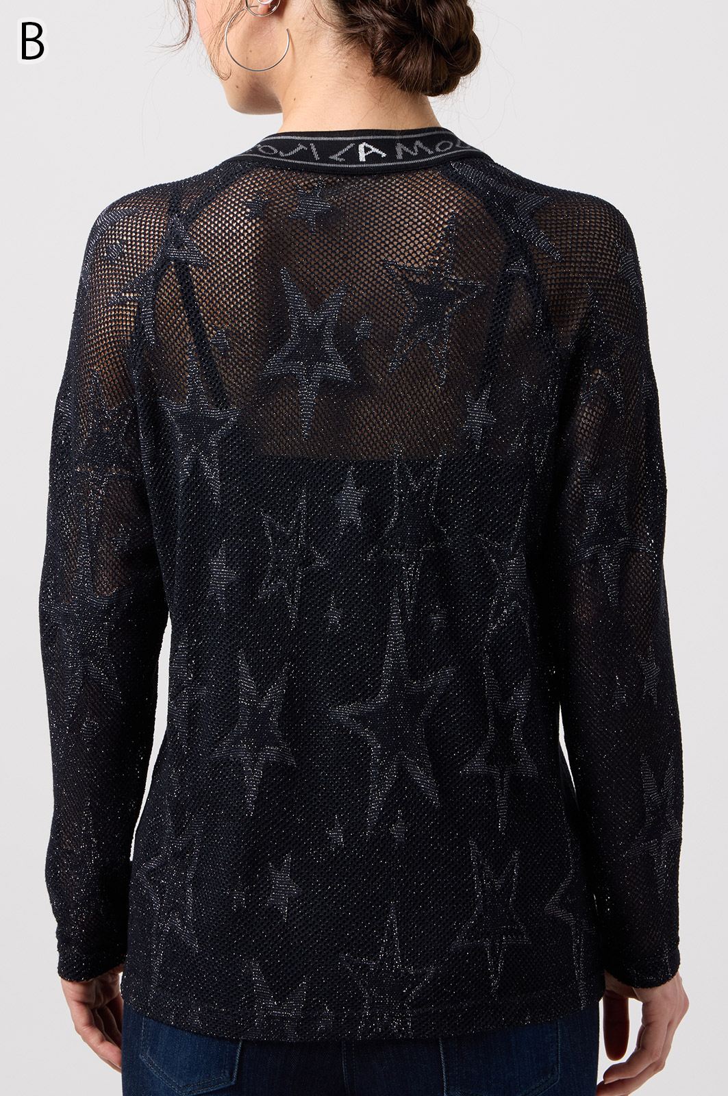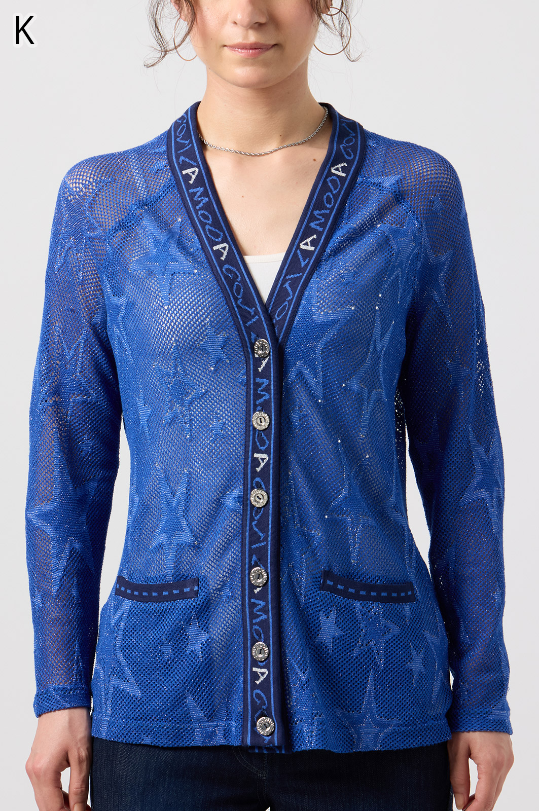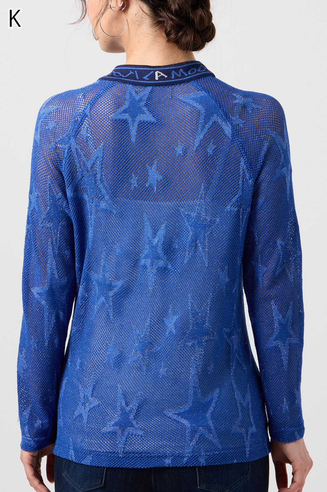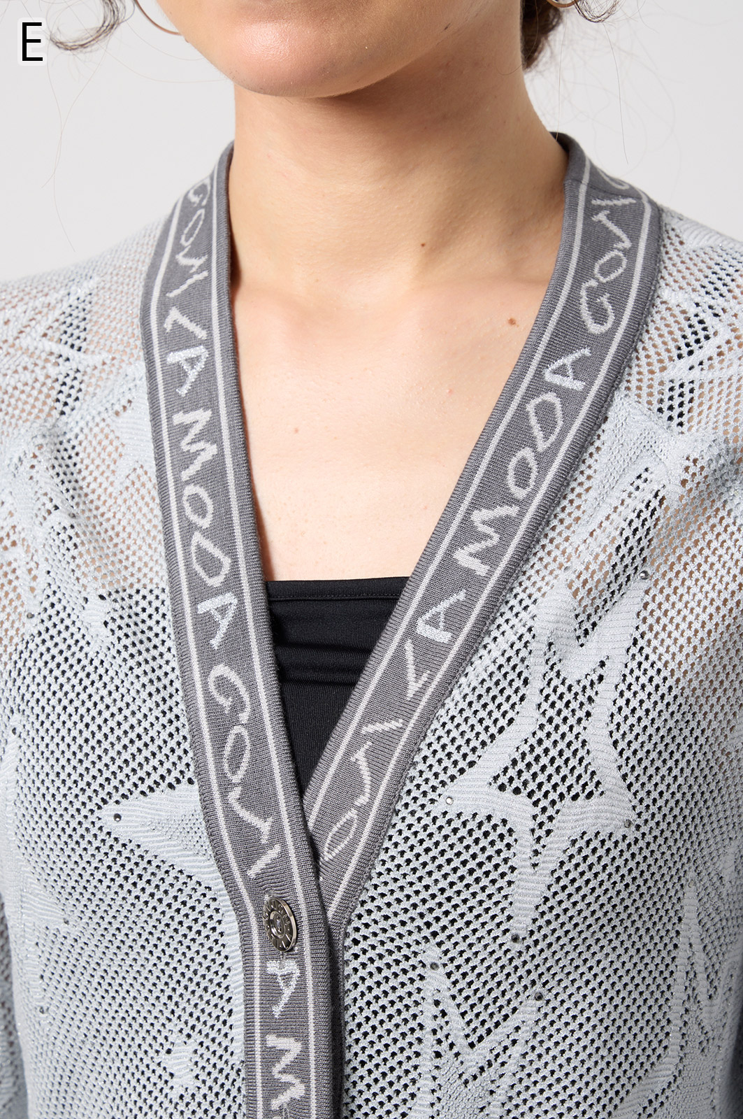 星柄ラメのきらっとしたメッシュ素材が目を引く、軽く羽織れるカーディガン。肩まわりが動かしやすいデザインで、前立てとポケットの編み込みがアクセントに。ロゴ入りで個性も◎!