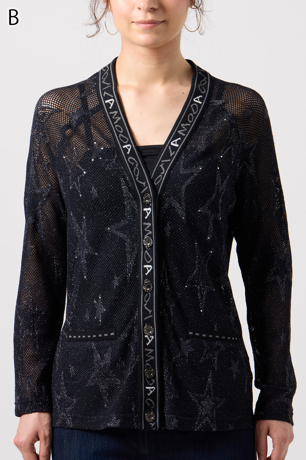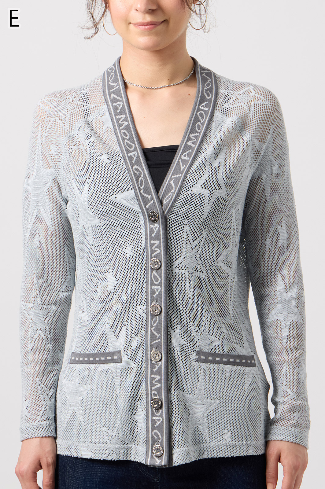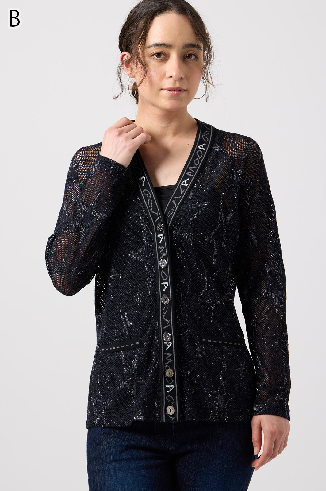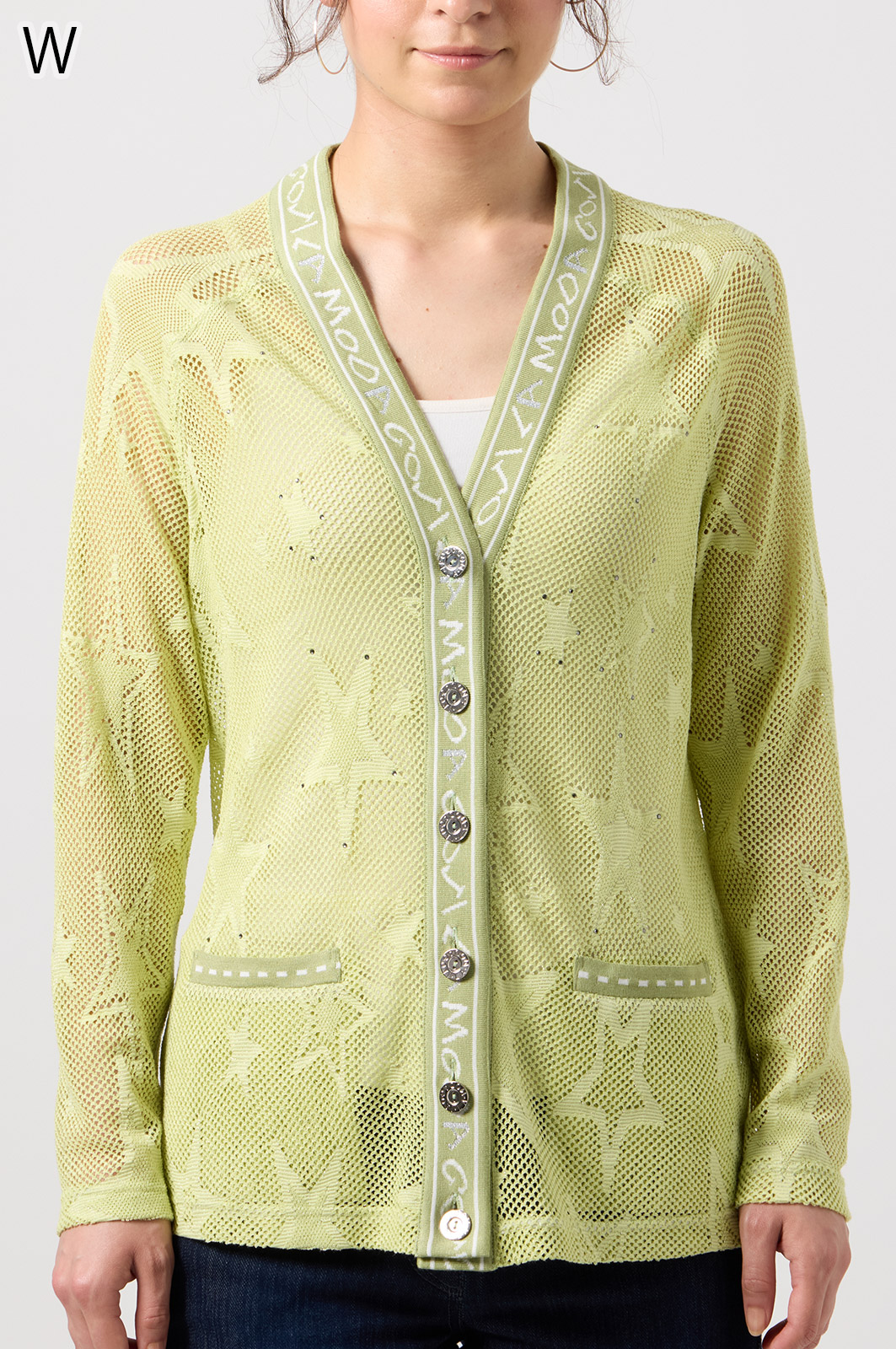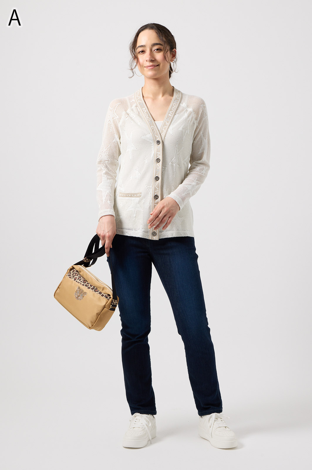 星柄ラメのきらっとしたメッシュ素材が目を引く、軽く羽織れるカーディガン。肩まわりが動かしやすいデザインで、前立てとポケットの編み込みがアクセントに。ロゴ入りで個性も◎!
