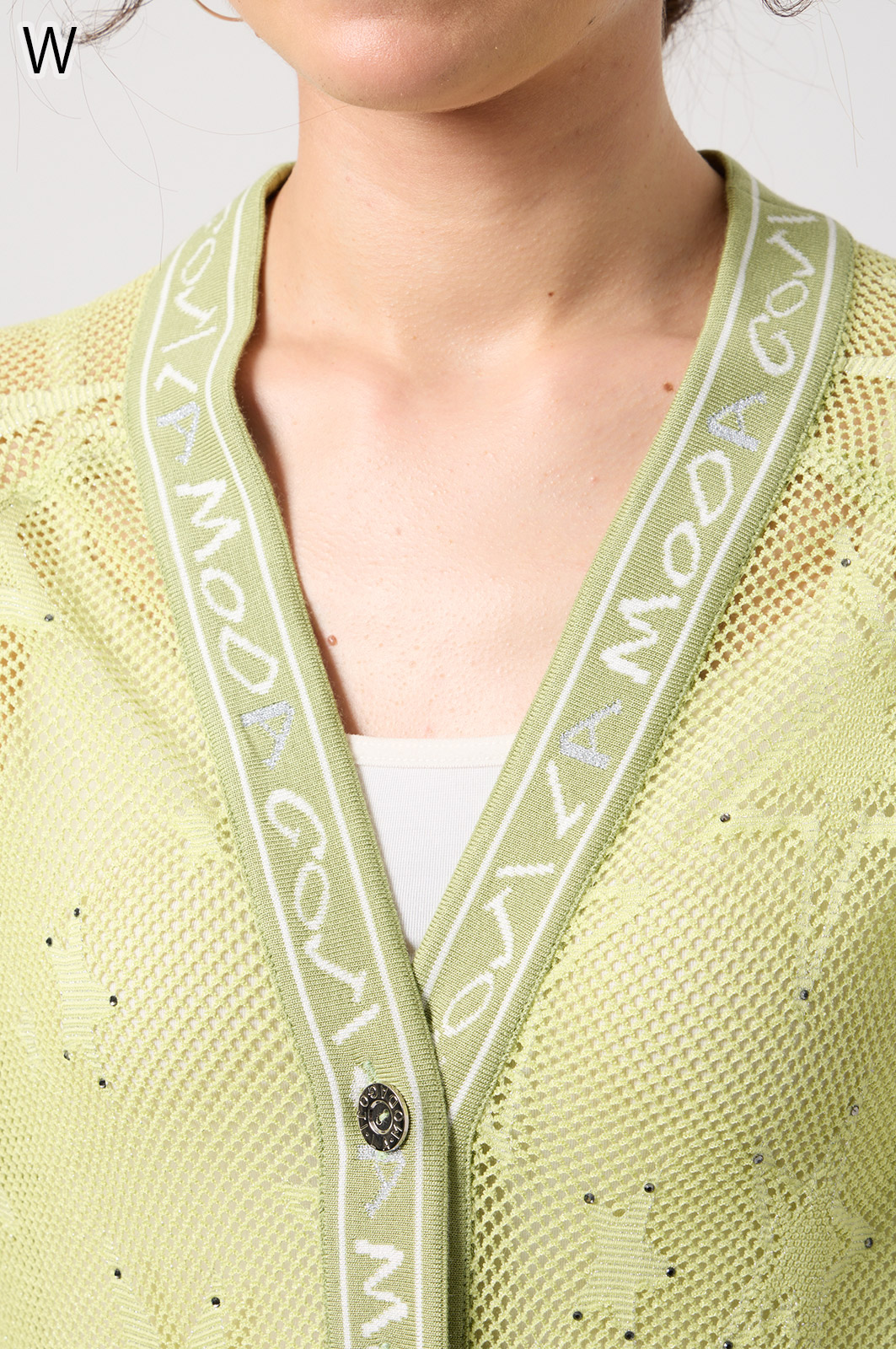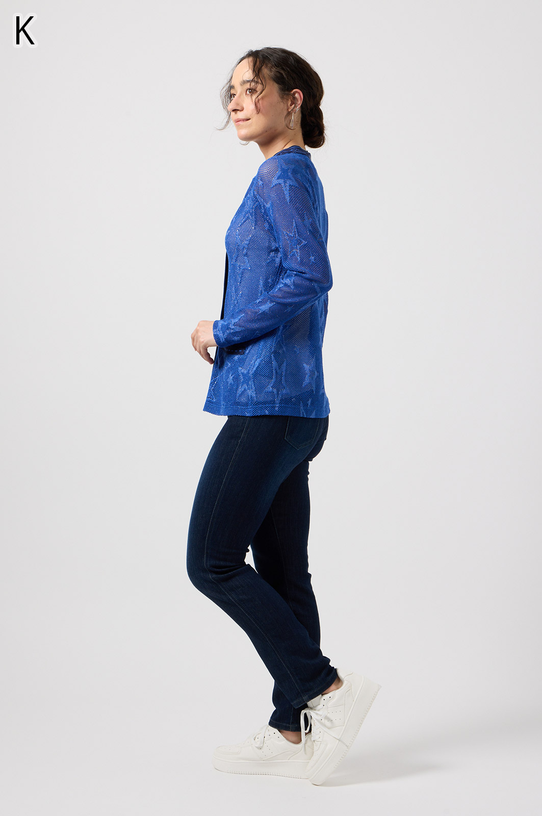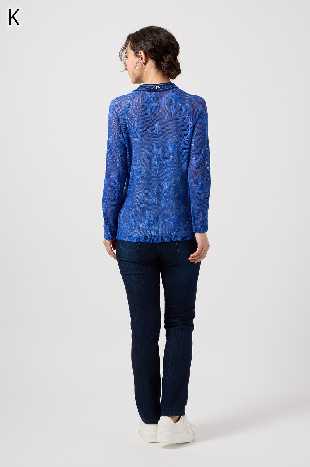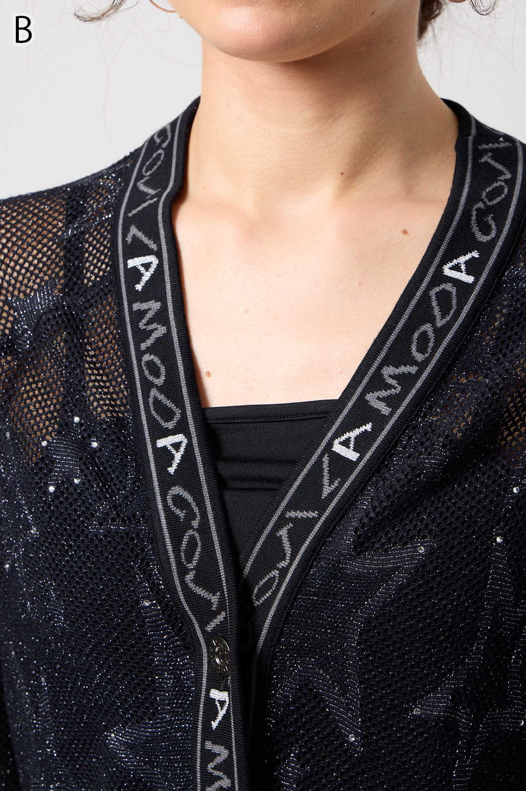 星柄ラメのきらっとしたメッシュ素材が目を引く、軽く羽織れるカーディガン。肩まわりが動かしやすいデザインで、前立てとポケットの編み込みがアクセントに。ロゴ入りで個性も◎!