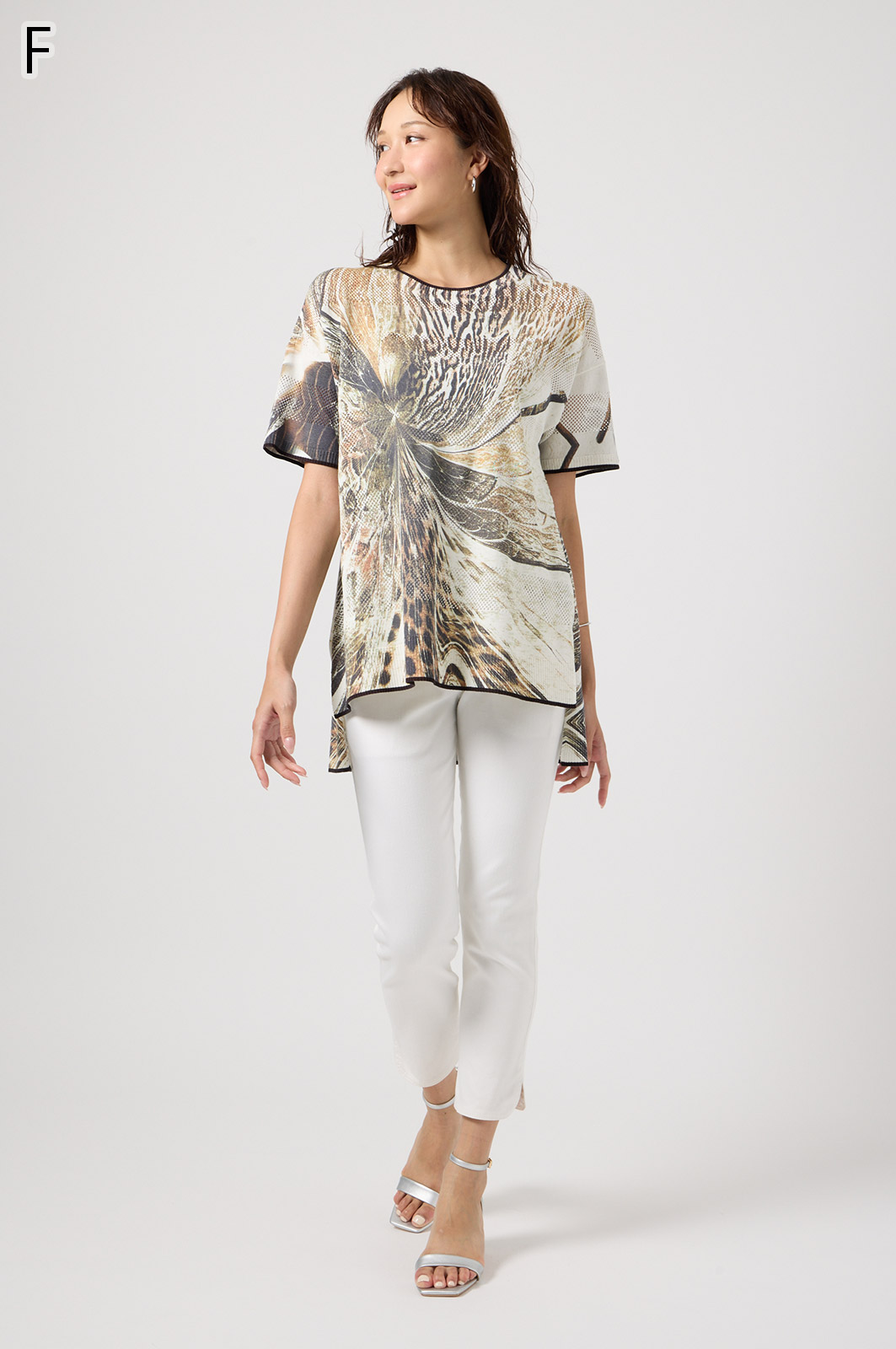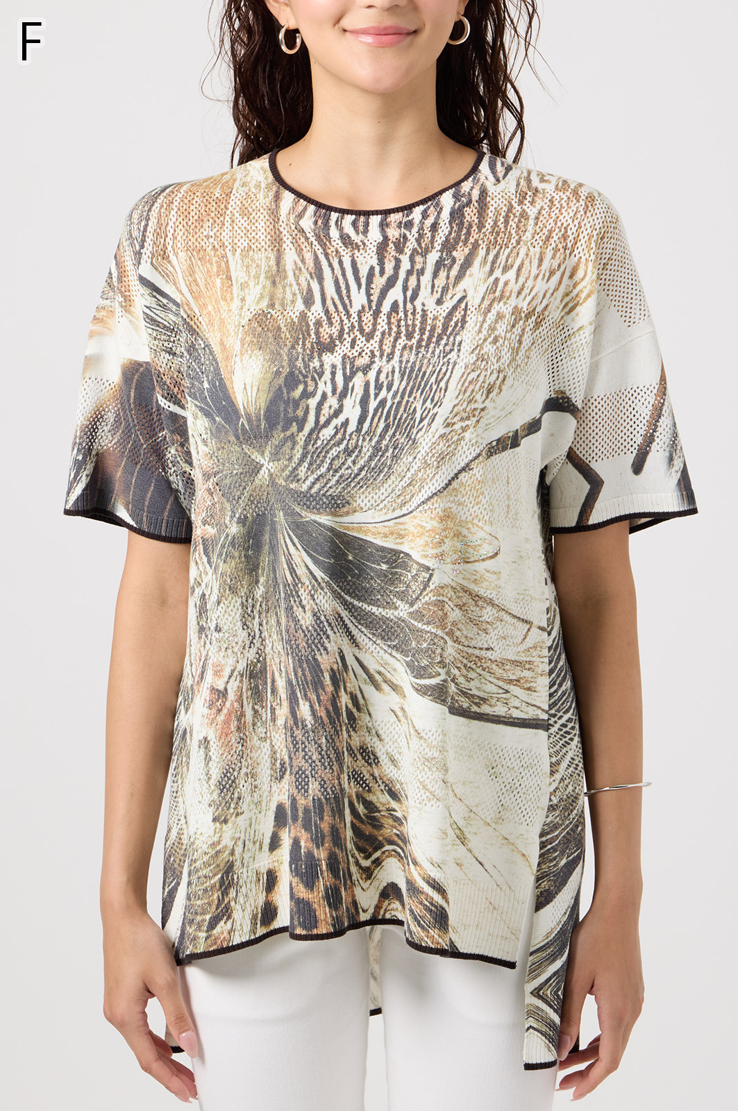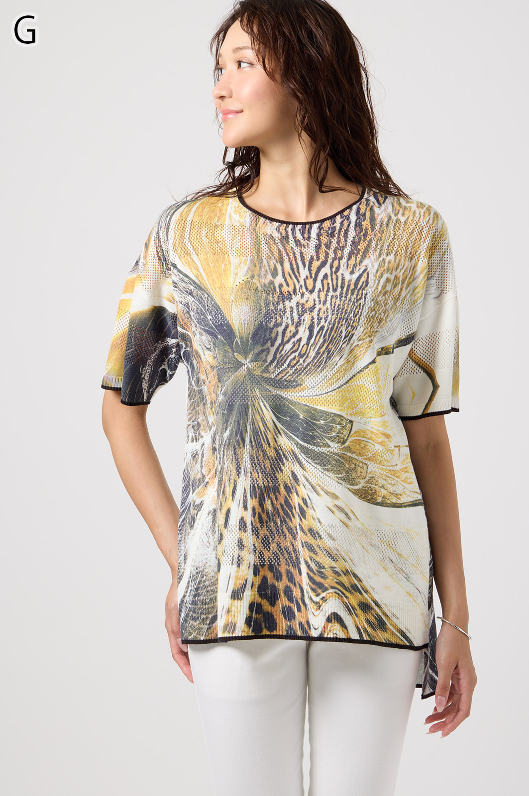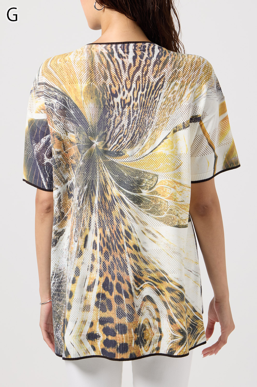 風通しのよい透かし編みに、遊び心のあるアニマル柄プリントが映える一枚。ふんわり広がるAラインで、涼しく着られて夏にぴったりのニットです。