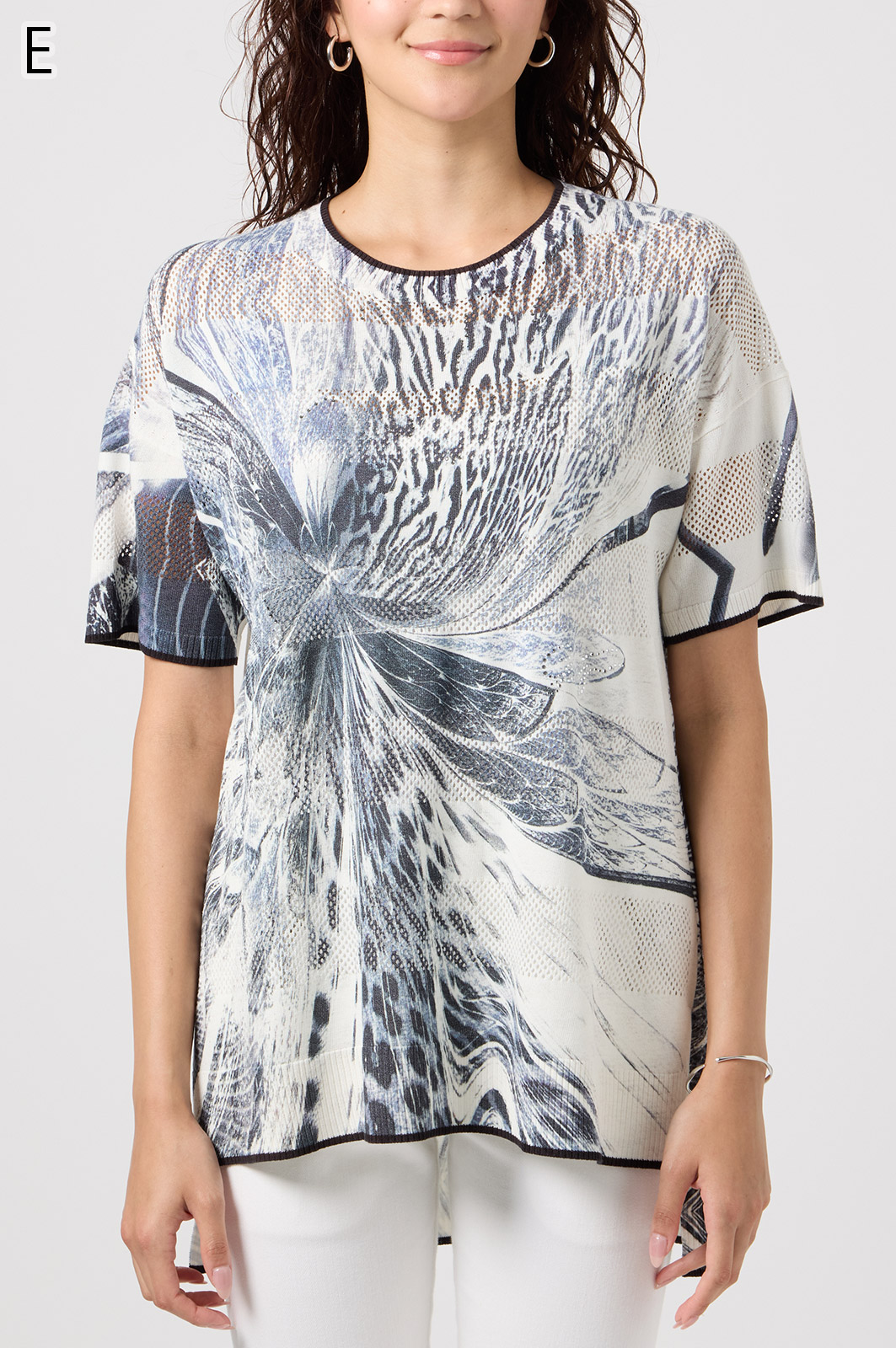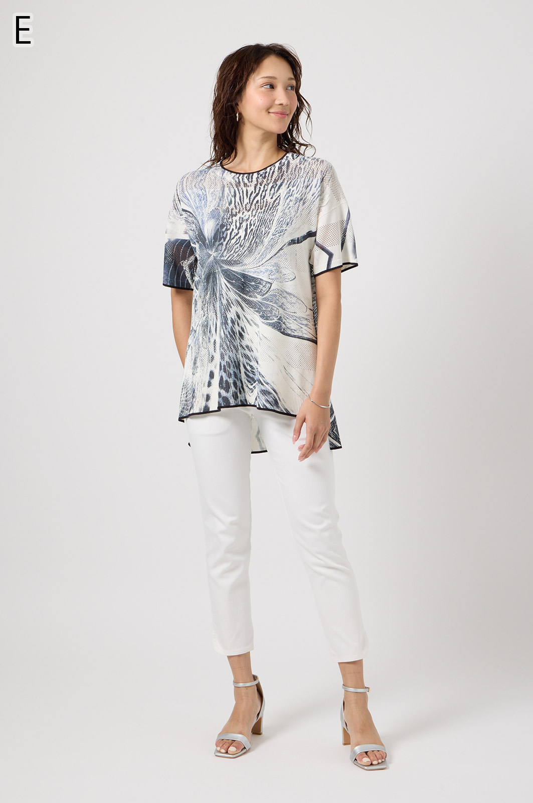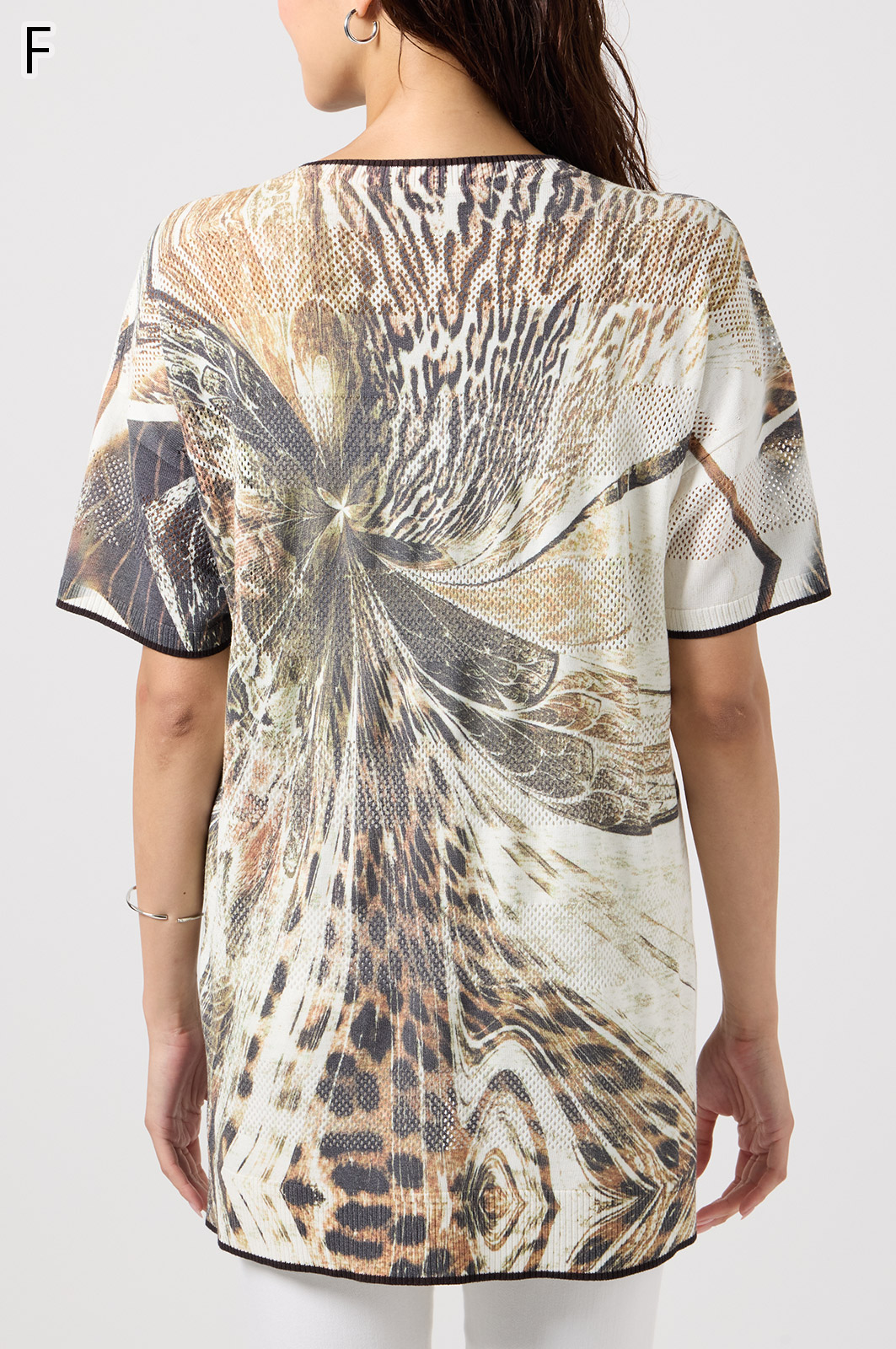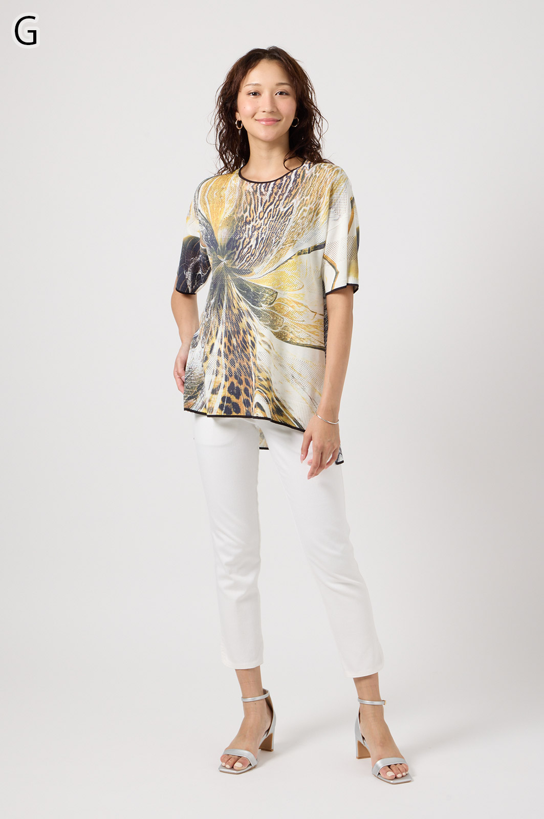 風通しのよい透かし編みに、遊び心のあるアニマル柄プリントが映える一枚。ふんわり広がるAラインで、涼しく着られて夏にぴったりのニットです。