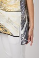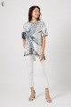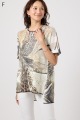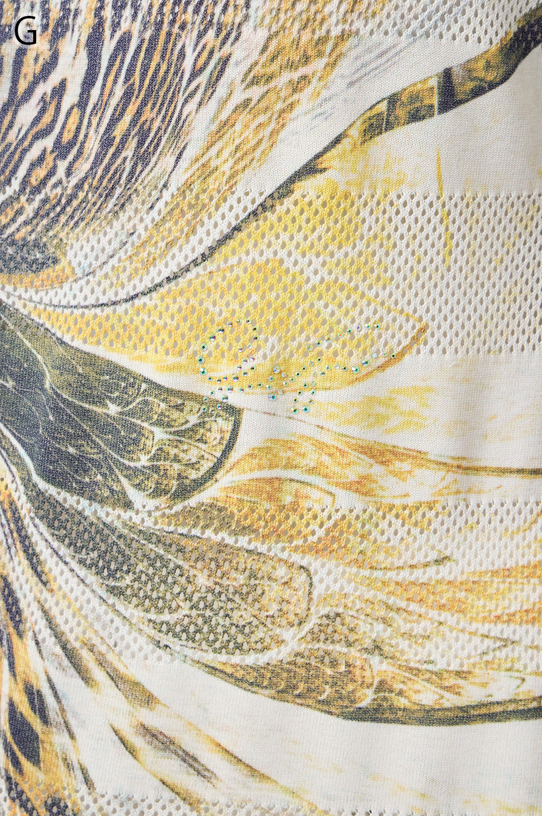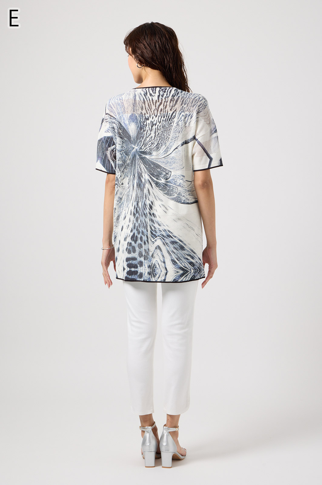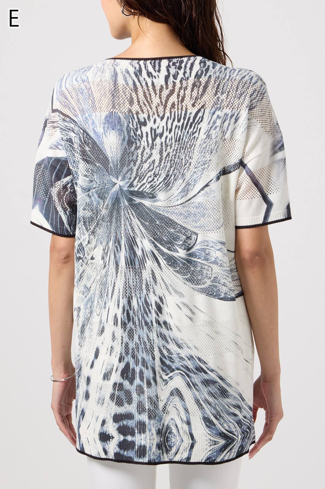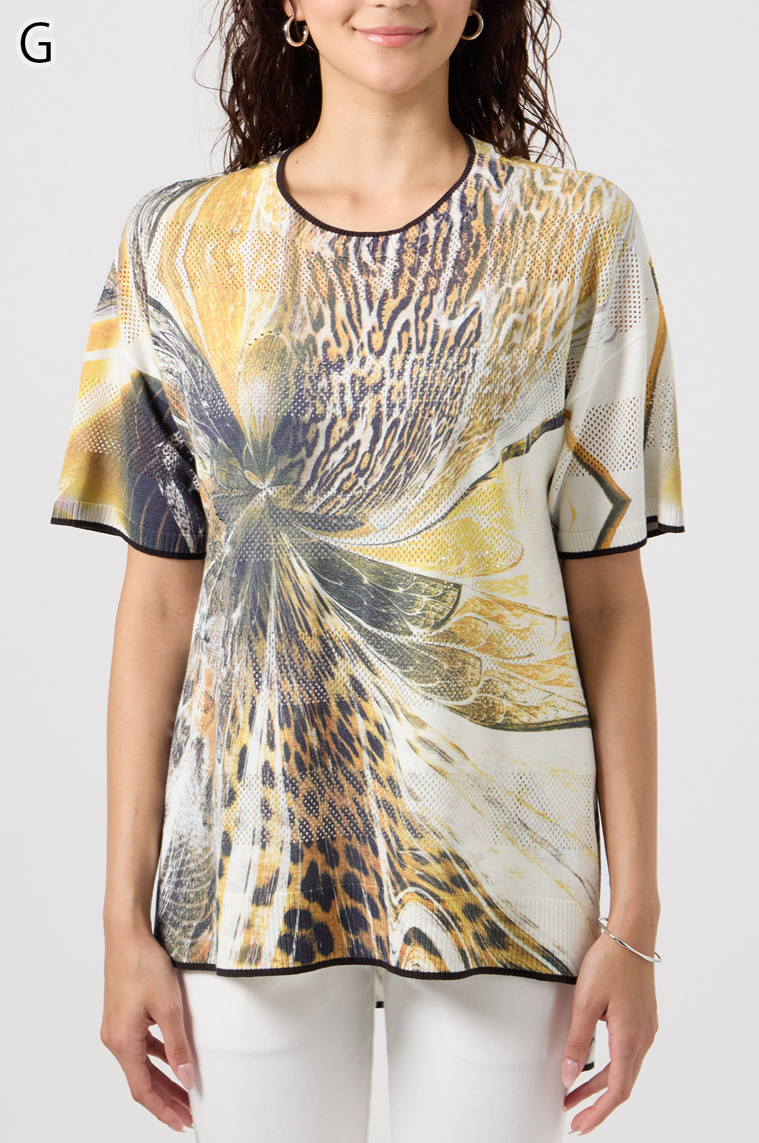 風通しのよい透かし編みに、遊び心のあるアニマル柄プリントが映える一枚。ふんわり広がるAラインで、涼しく着られて夏にぴったりのニットです。