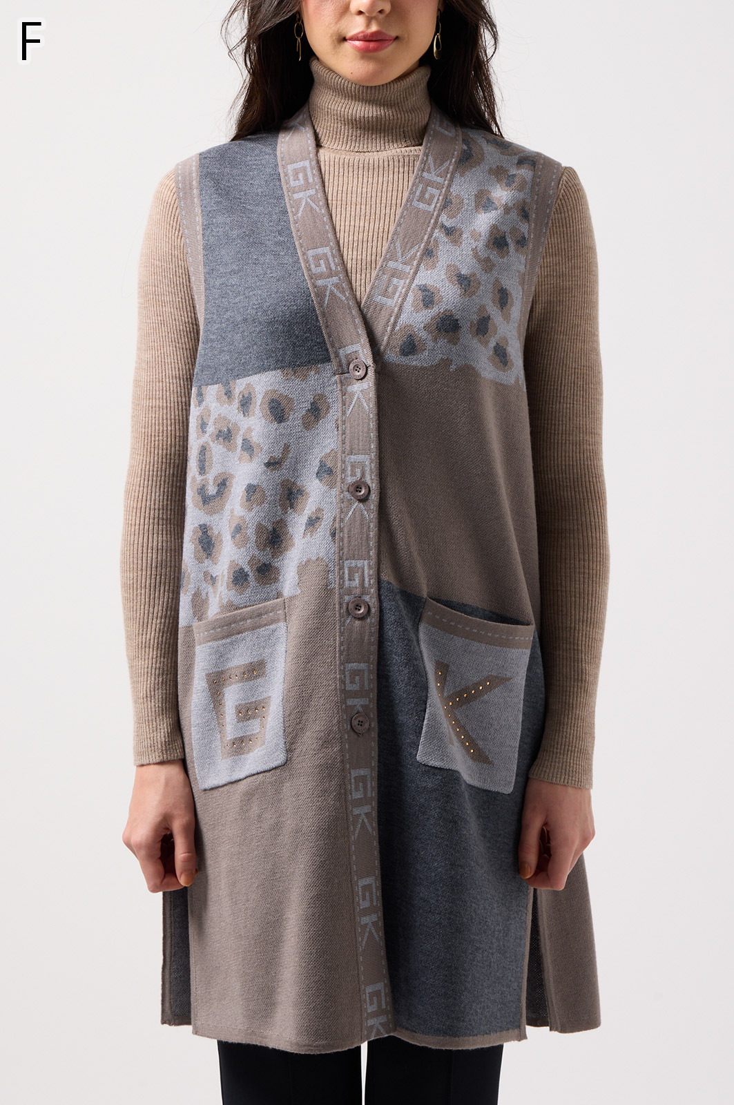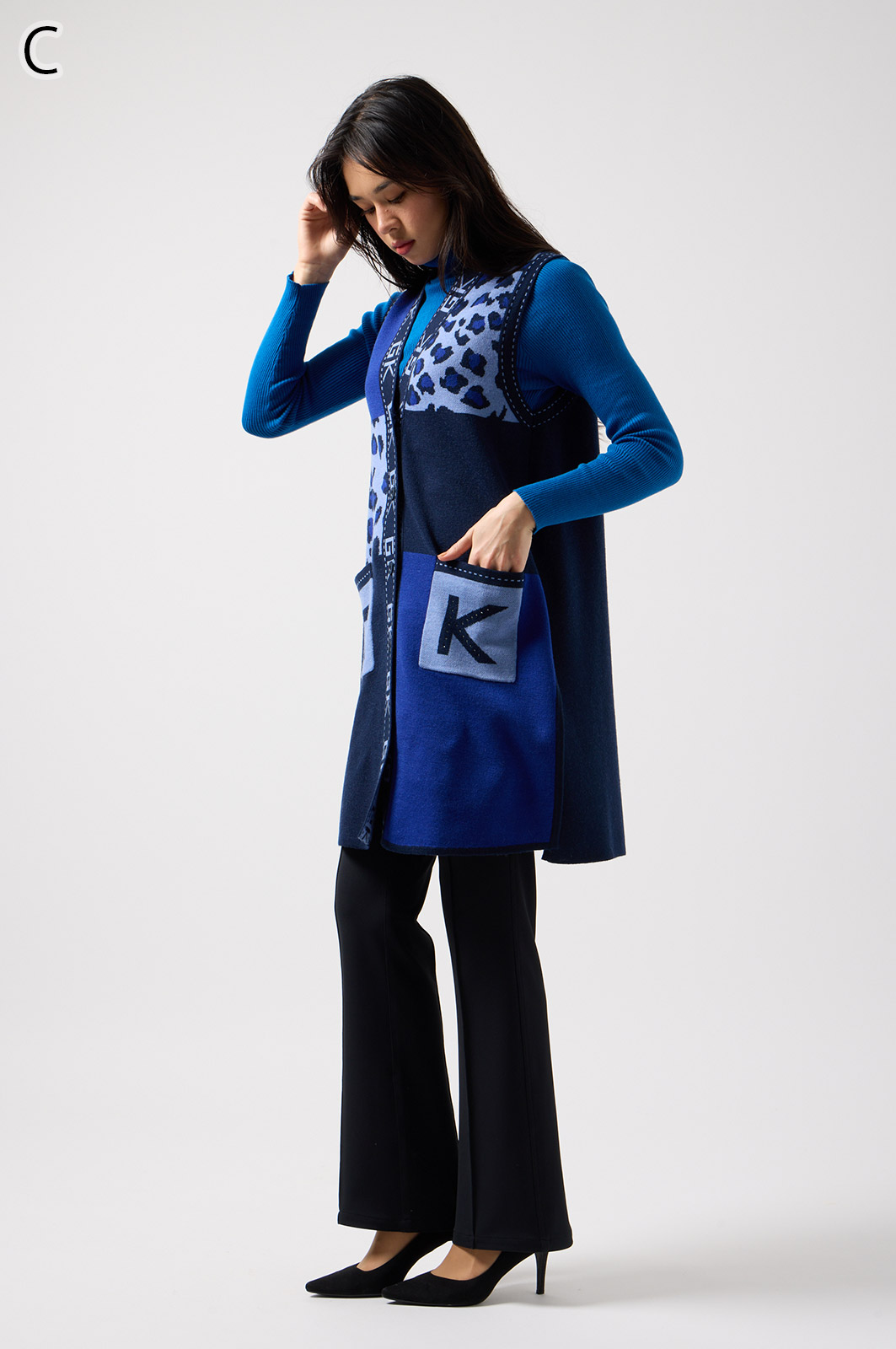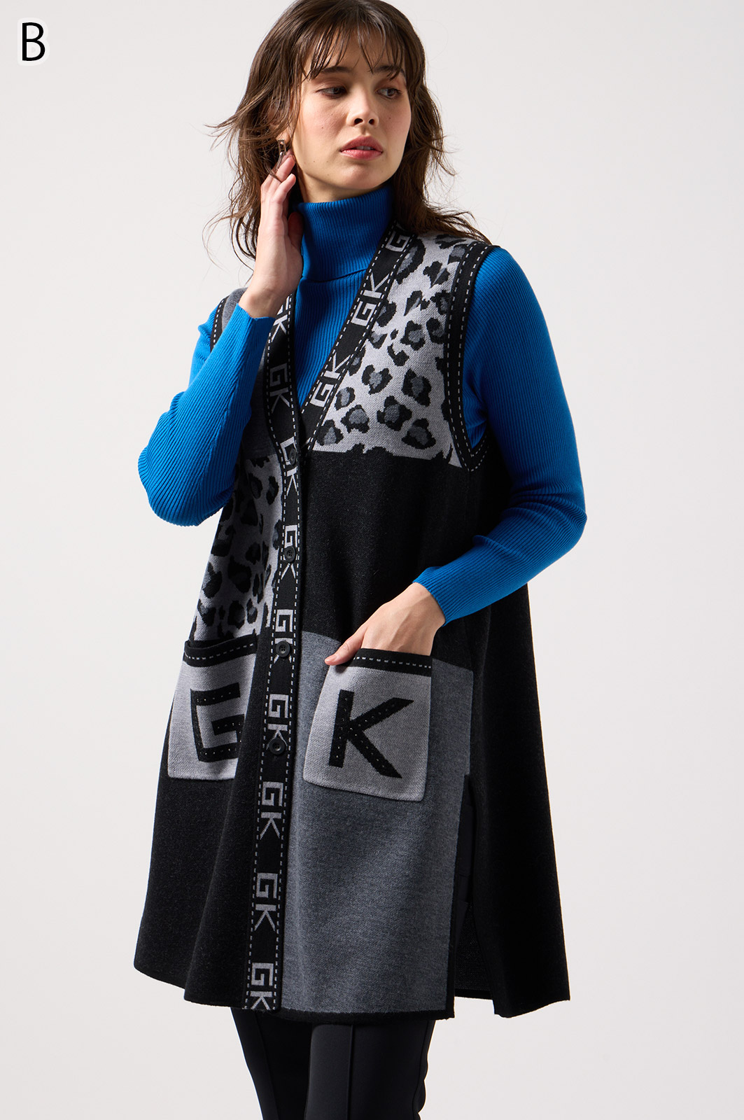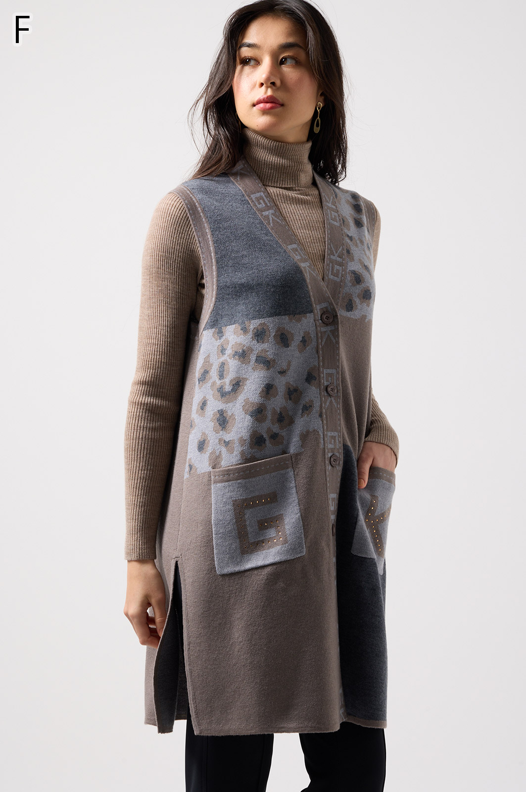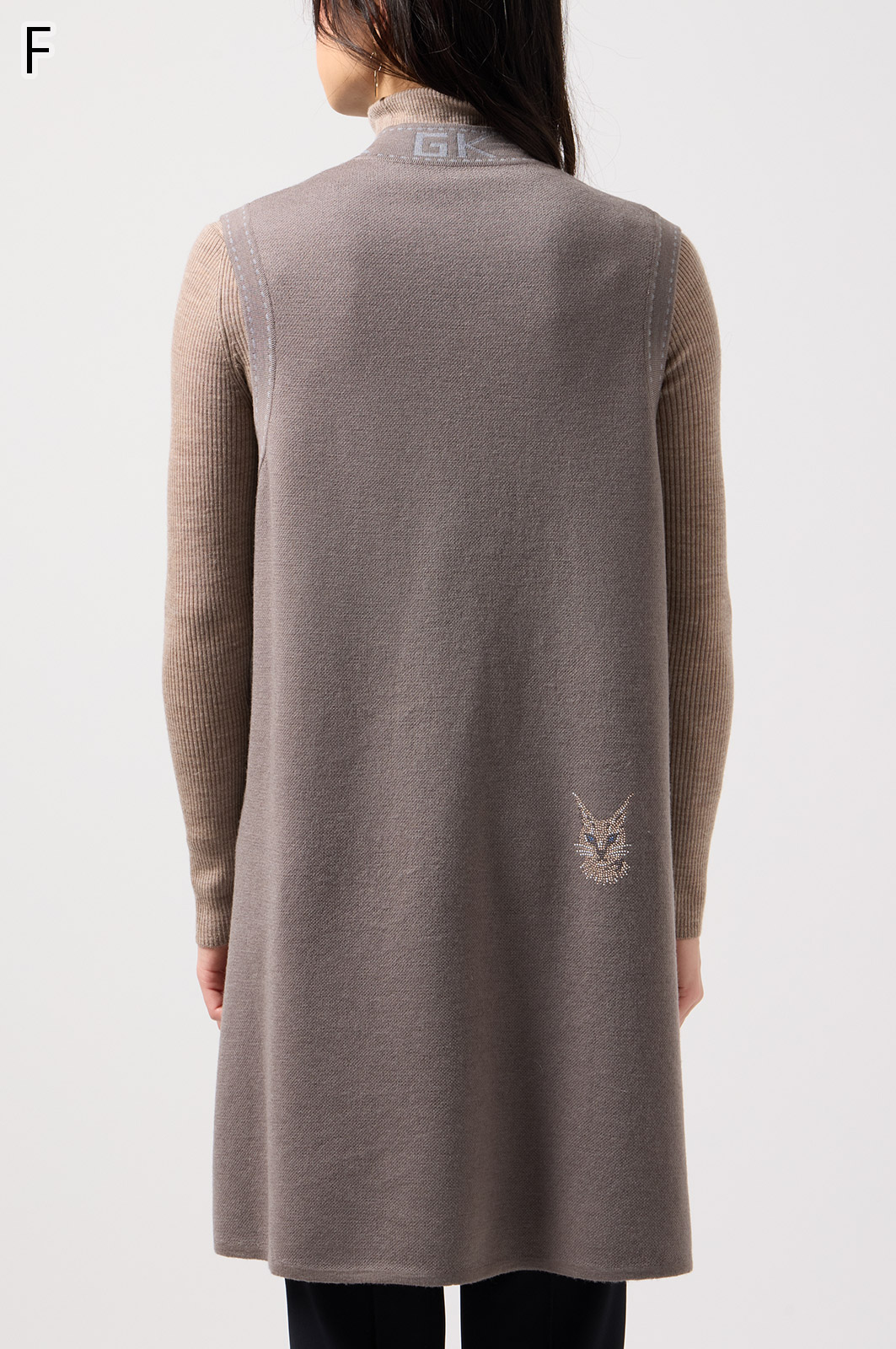 NO.680048VE ヴェスト (Vest) ヒョウ柄とロゴを織り込んだ存在感のあるデザイン。カシミヤのようにやわらかく上質なウール素材を使用。脇にスリットが入った、ロング丈のベストです。 【 価格 (PRICE) 】 ¥61,600 税込(W/ TAX) 【 カラー (COLOR) 】 【 品質 (QUALITY) 】 毛100% 【 サイズ ( SIZE ) 】 9号:着丈84.5cm/バスト102cm/裾幅136cm/アームホール50cm 11号:着丈86.5cm/バスト110cm/裾幅142cm/アームホール53cm